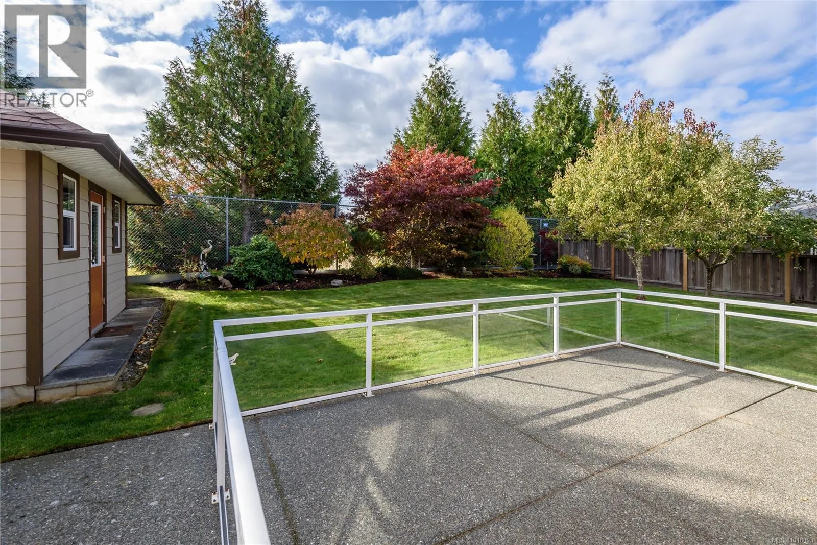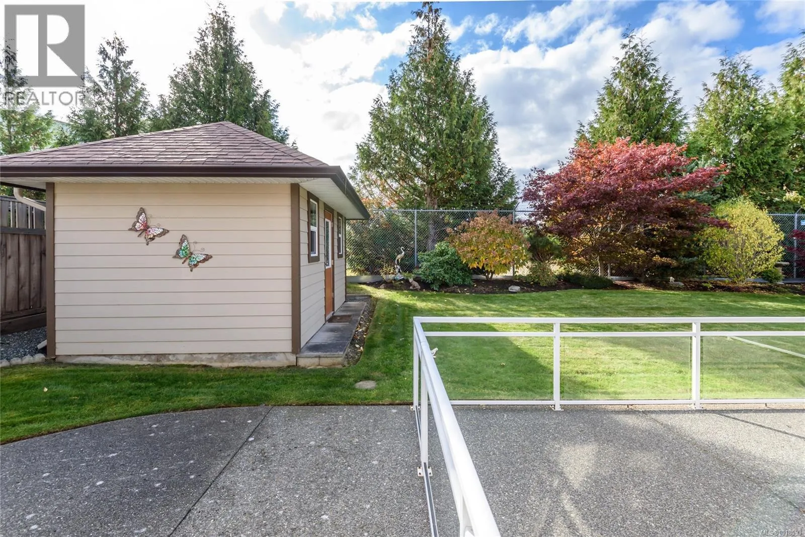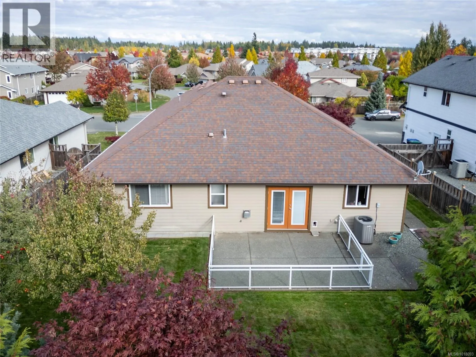 Beautiful Comox rancher with double garage and exceptional storage. Welcome to this spacious 1,850 sq. ft. rancher in a quiet Comox neighbourhood, just a short walk to nearby shopping and amenities. This well-designed home offers three bedrooms plus a den/officeâall on one convenient level. The interior features gleaming hardwood floors and elegant maple shaker cabinetry, creating a warm and inviting atmosphere throughout. The open-concept kitchen and family room are perfect for entertaining, with a corner gas fireplace, French doors leading to the private back patio, and a separate island providing excellent workspace and additional seating. Built-in cabinetry ensures ample storage, and privacy blinds are installed on all windows. The primary suite includes a generous walk-in closet and a bright ensuite with a walk-in shower. Two additional bedrooms are situated near the main four-piece bathroom, making the layout ideal for families or guests. Practicality meets comfort with a heat pump for efficient year-round heating and cooling. A dedicated walk-in storage room is perfect for a freezer, bulk goods, or seasonal items. Outside, enjoy low-maintenance Hardie plank siding, a fully fenced yard for kids or pets, and a powered backyard shed for even more storage or workshop space. If youâre searching for a well-maintained, spacious, and storage-rich home in Comox â this is the one! (id:27476)