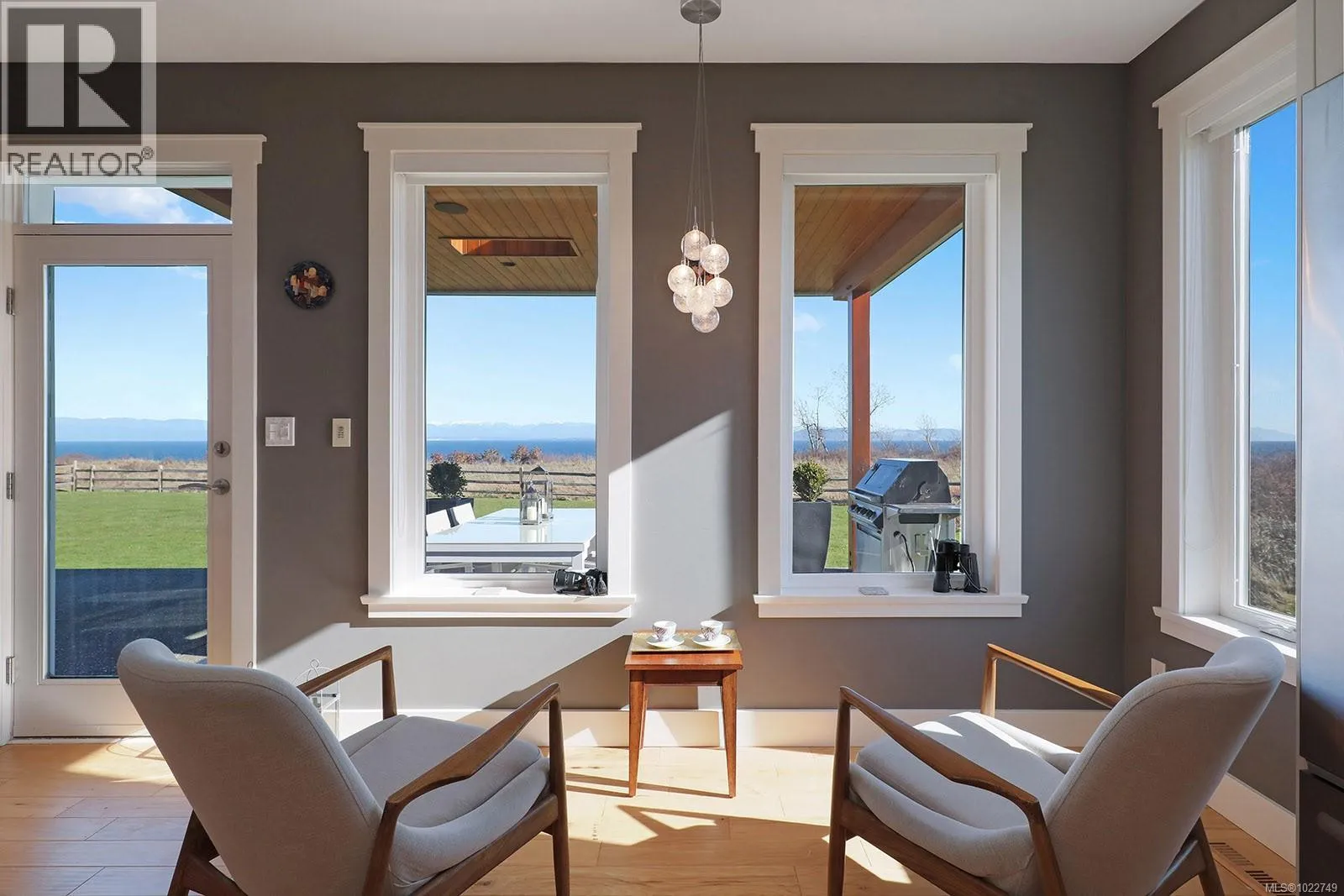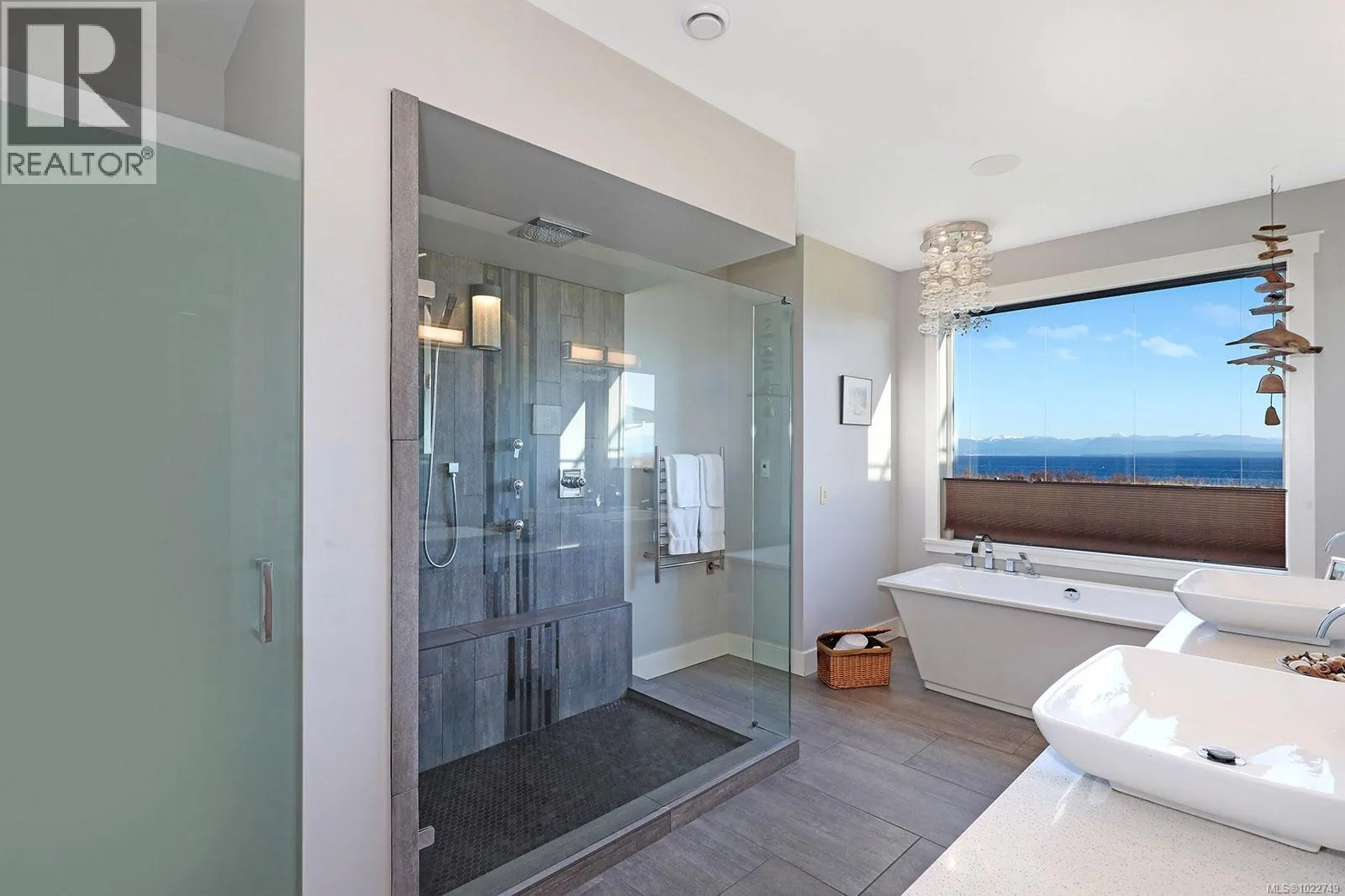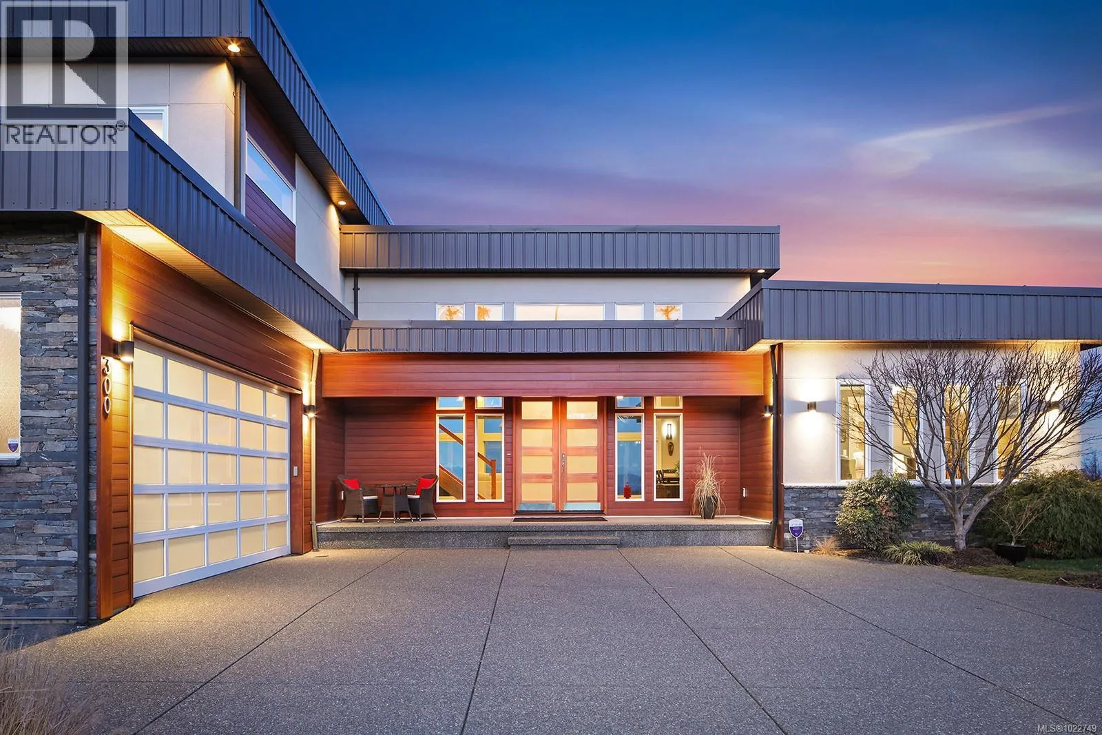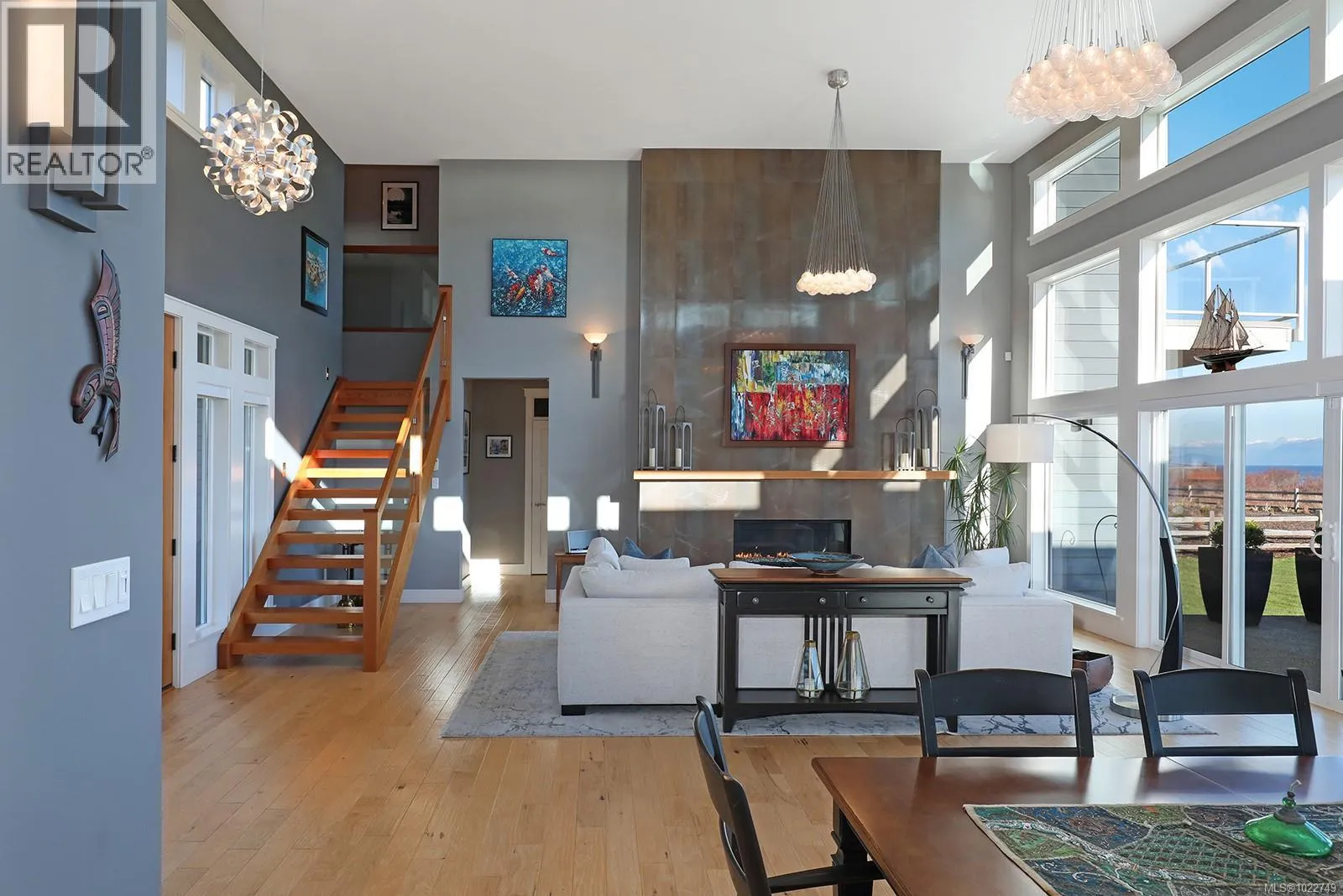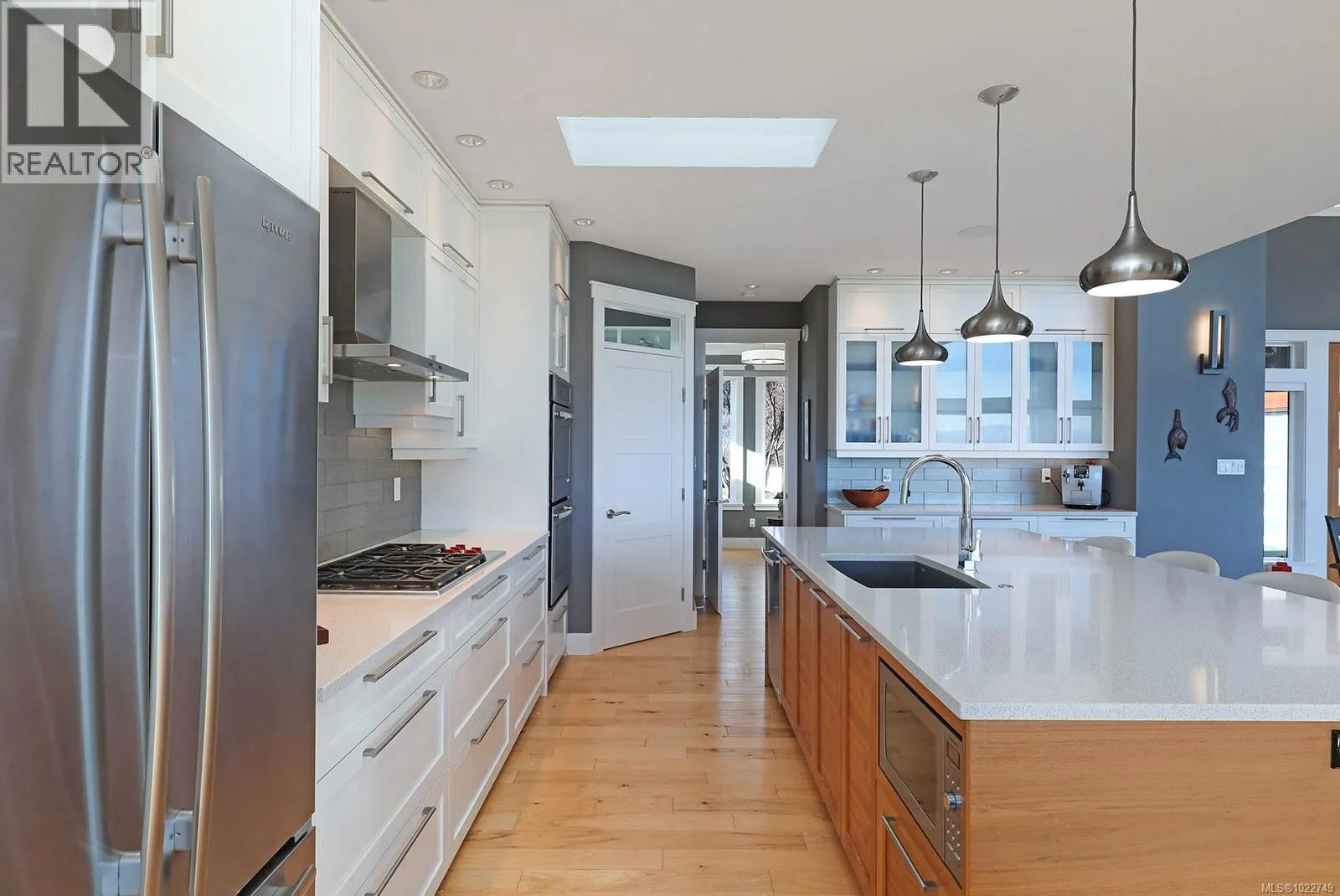 Stunning West Coast Ocean views across the Strait of Georgia to the snow-capped Coast Mountains beyond. Delivering panoramic views from all levels, this high-bank waterfront home of 3,415 sf, 4 BD/ 3 BA offers chic contemporary styling incorporating simple luxury and refined elegance. Streaming sunlight highlights the bright open plan w/ floor to ceiling windows & 15â5â ceilings in the Great Room, striking bronze tiled propane gas fireplace w/ fir timber mantle. Bright white kitchen w/ contrasting wood finished island, Wolf gas cooktop, Jennair dbl oven, pantry, & access to the covered patio w/ 4 skylights. Adjacent to the kitchen is a den/bedroom/formal dining room. The primary suite offers luxury, solitude, and 5 pce ensuite w/ soaker tub, glass & tile shower, dual sinks and views! Upstairs there are 2 bedrooms, den/small bedroom, & entertainment room w/ wet bar, ideal for media, pool table, & access to the deck. Doggie shower, 6â crawl, Longboard aluminum siding âBuilt to last.â (id:27476)