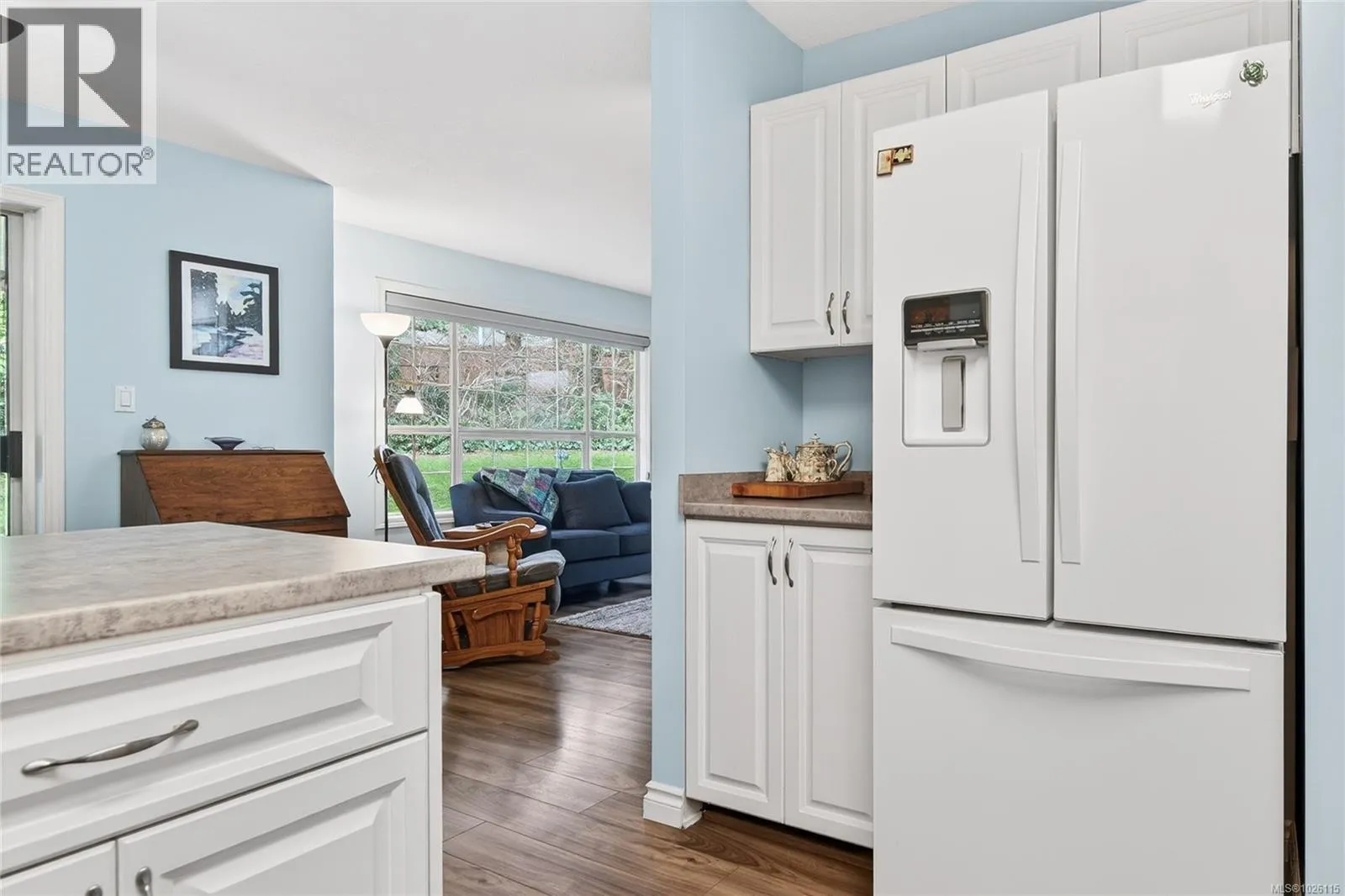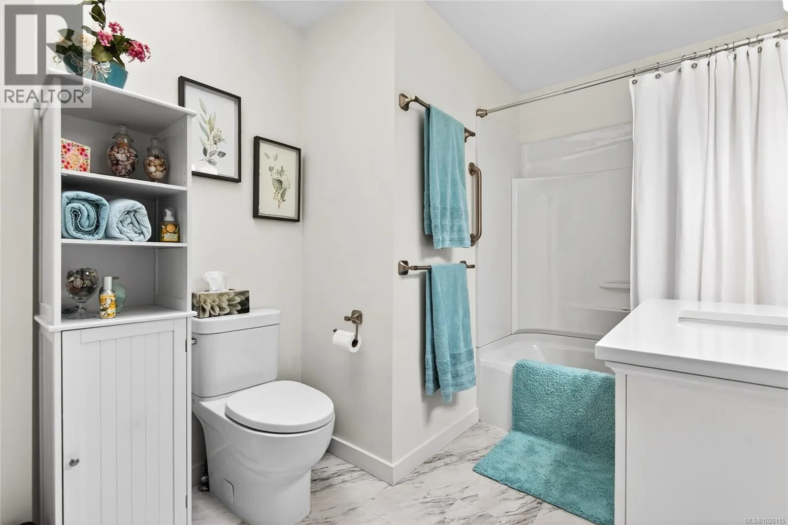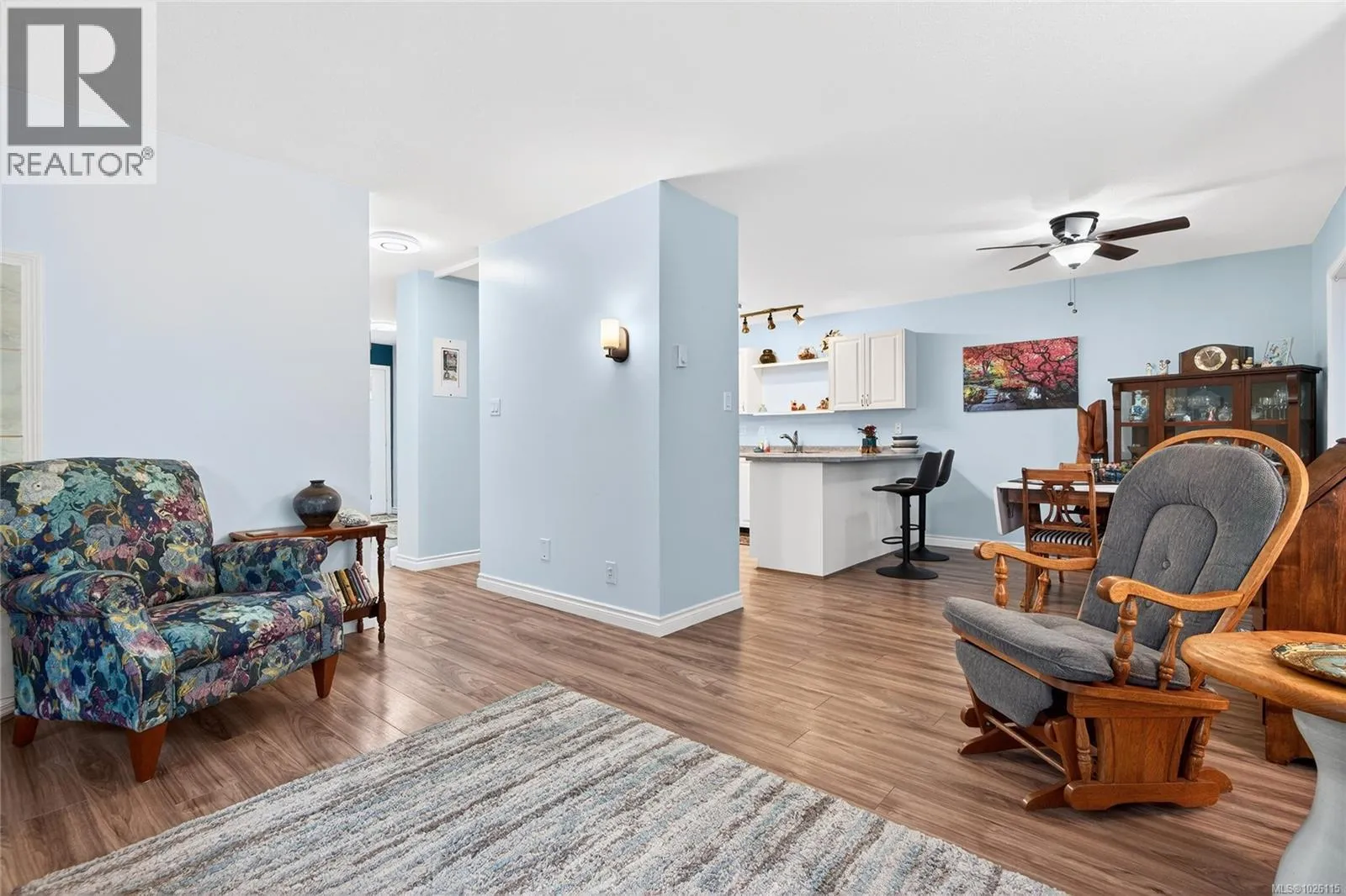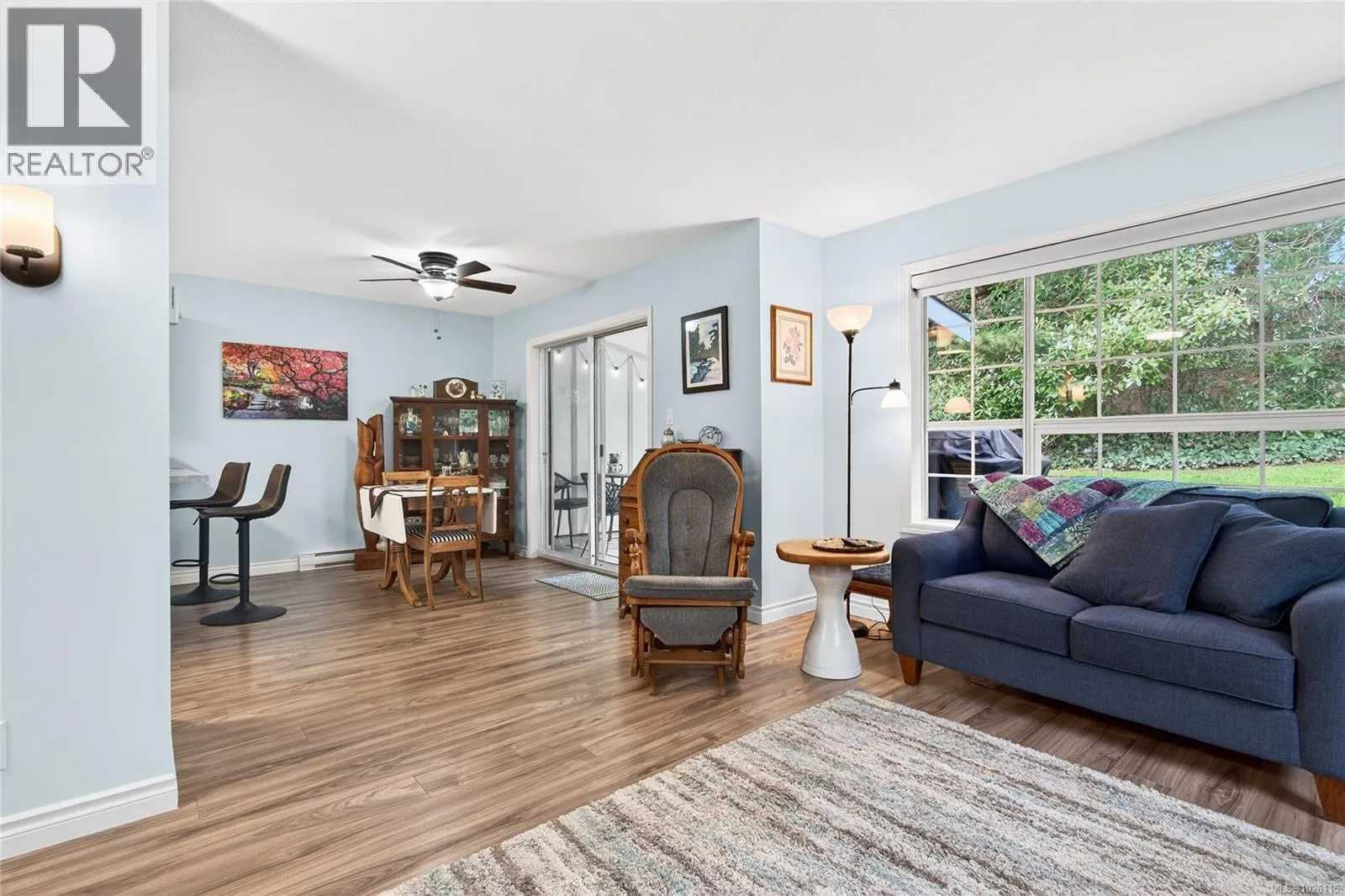 Welcome to Eagle Ridge Estates a beautiful 55 plus community in the town of Comox. This 1283 sqft two story townhouse style unit features a bright and spacious kitchen with plenty of cupboard and counter-space, the kitchen opens to a dining area and large living room complete with warm Gas Fireplace. Downstairs you will also find a updated powder room, laundry and garage access for your car, storage or recreation items. Upstairs is two bright bedrooms including a primary with walk-in closet, and a second bedroom that captures lovely ocean and mountain views and a fresh fully renovated main bathroom also there is a bonus storage room upstairs. This complex is in a great location within walk-able amenities and located in a great low maintenance strata community including access to a clubhouse and guest suite for overnight visitors. Lots of recent updates including easy care flooring, fresh paint, new window coverings, and a fully redesigned rear covered patio space. (id:27476)
