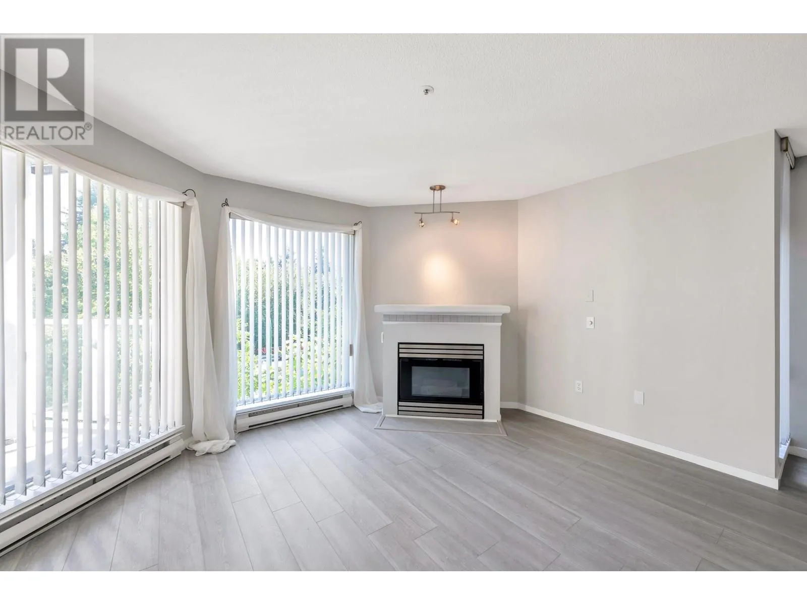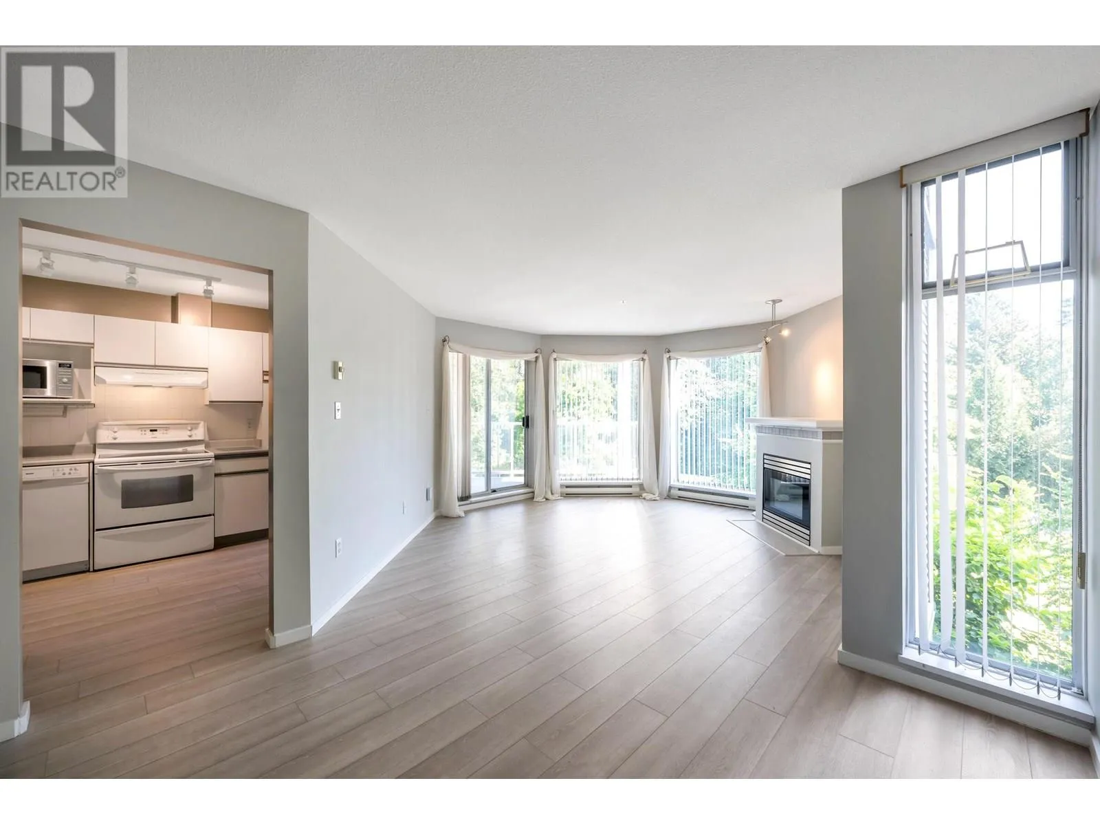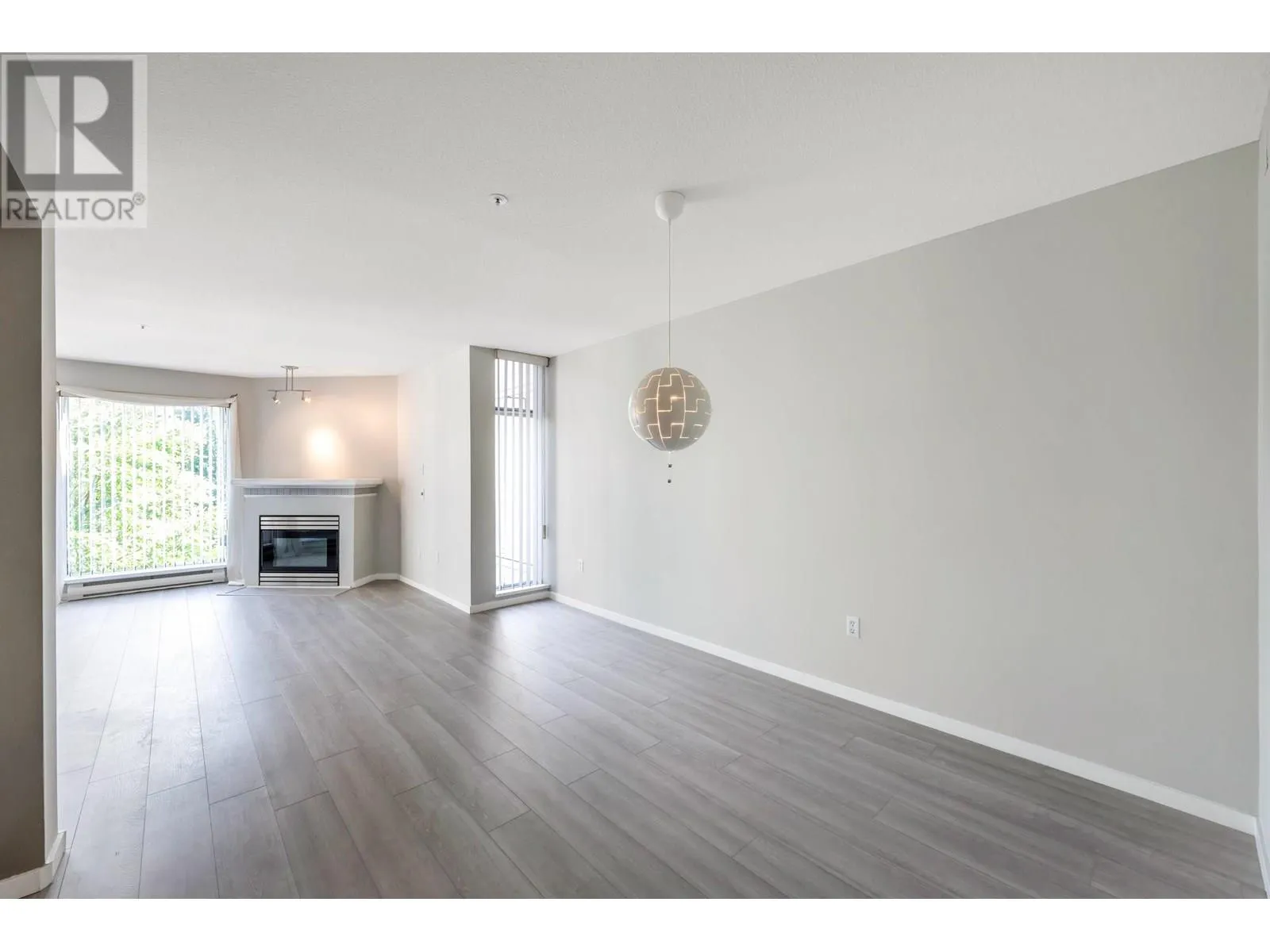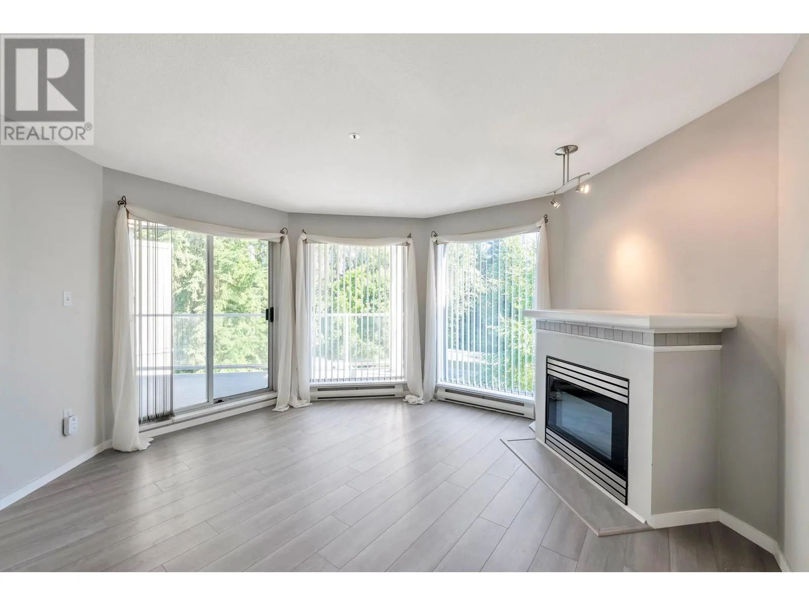 Welcome to Mountainside Place! This 3rd floor corner unit faces south and offers 2 bedrooms, 2 bathrooms, a den/solarium, gas fireplace, and 1103 square ft of well-maintained living space with new laminate flooring. Floor-to-ceiling windows brighten the open-concept living and dining area, which opens to a generous balcony. Both bedrooms have balcony access; the primary features a walk-in closet and 4-piece ensuite. 2 parking spots near the elevator, in suite laundry, storage locker, and ample visitor parking. Walk score of 90! Close to Coquitlam Centre, Lafarge Lake, SkyTrain, Douglas College, Hoy Creek and more. Pet-friendly, rain screened building with gym and amenity room. (id:27476)