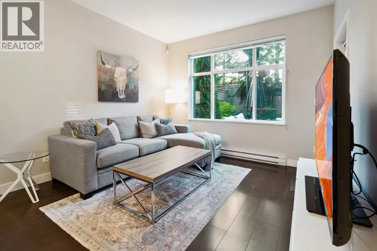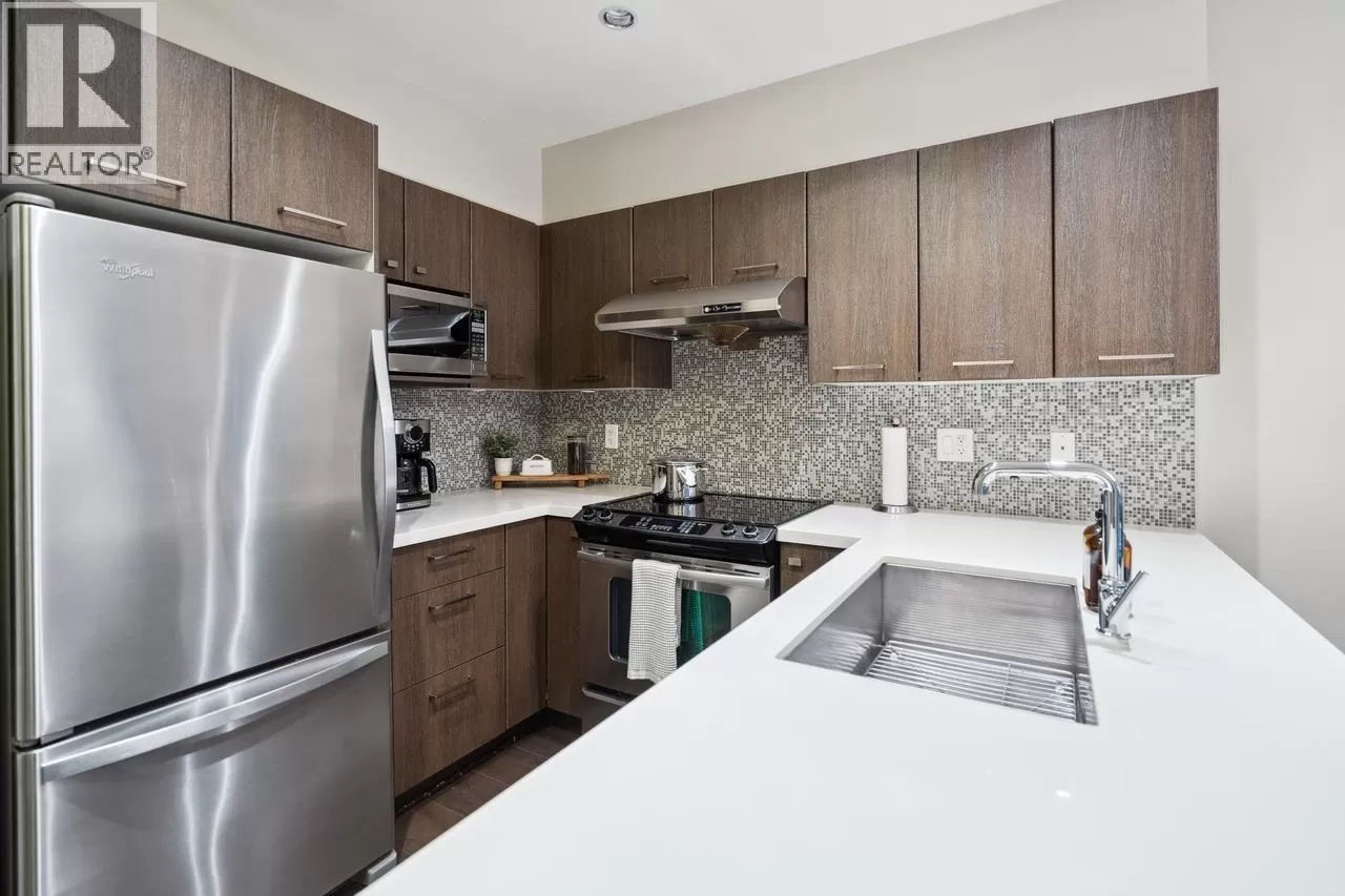 "CHARLAND" by LEDINGHAM MCALLISTER! This is the one you've been waiting for! A stunning 1-bedroom + den/home office with a spacious 232sf private entertaining patio-perfect for summer BBQs, relaxing evenings, or hosting guests. With direct lane access for extra parking, convenience is at your doorstep. This bright and airy home boasts an open-concept layout with a generous living/dining space, laminate floor throughout, in-suite laundry, and high-end finishes, including stainless steel appliances, quartz countertops, tile backsplash, and soft-close cabinetry. Amenities include secured underground parking, a storage locker, an exercise room, bike & kayak storage, and a common rooftop terrace with breathtaking views. Located in the heart of Austin Heights, you're just steps from transit, shopping, dining, Blue Mountain Park, and the Vancouver Golf Club. Pet and rental friendly, this is a fantastic opportunity for homeowners and investors! Immediate possession! (id:27476)