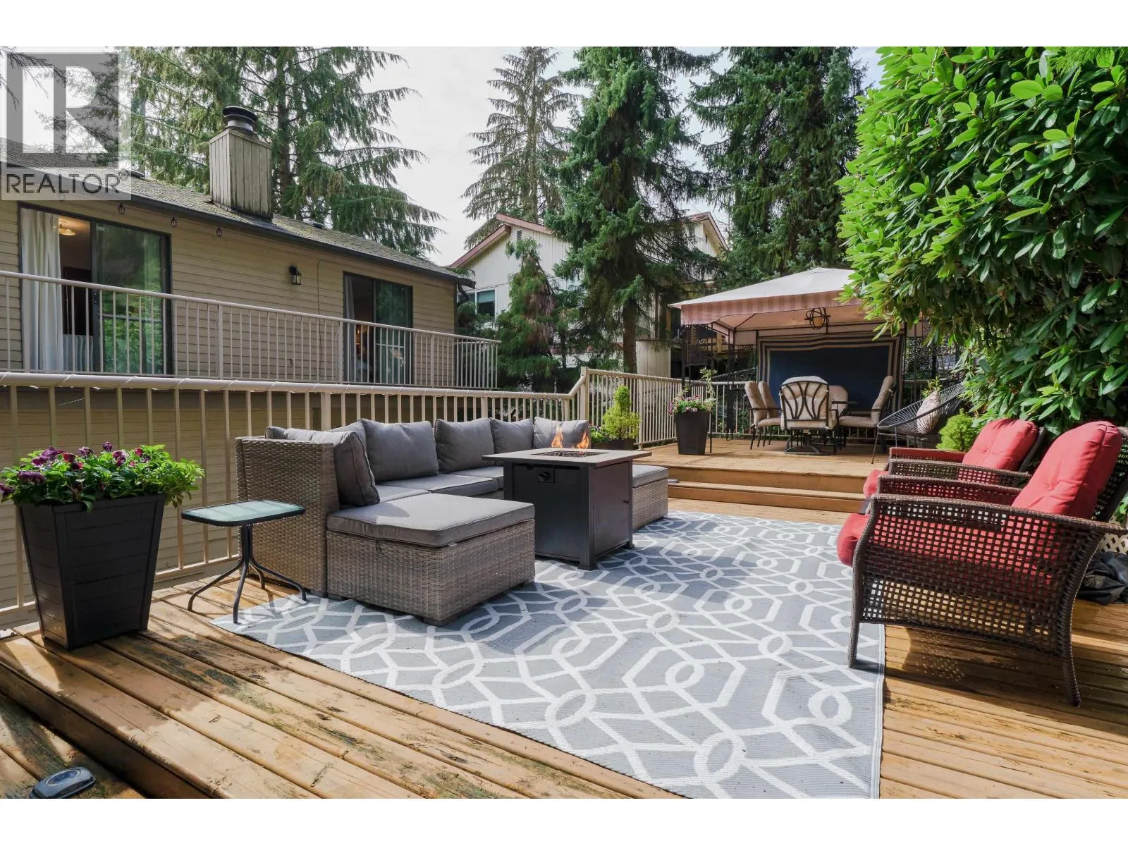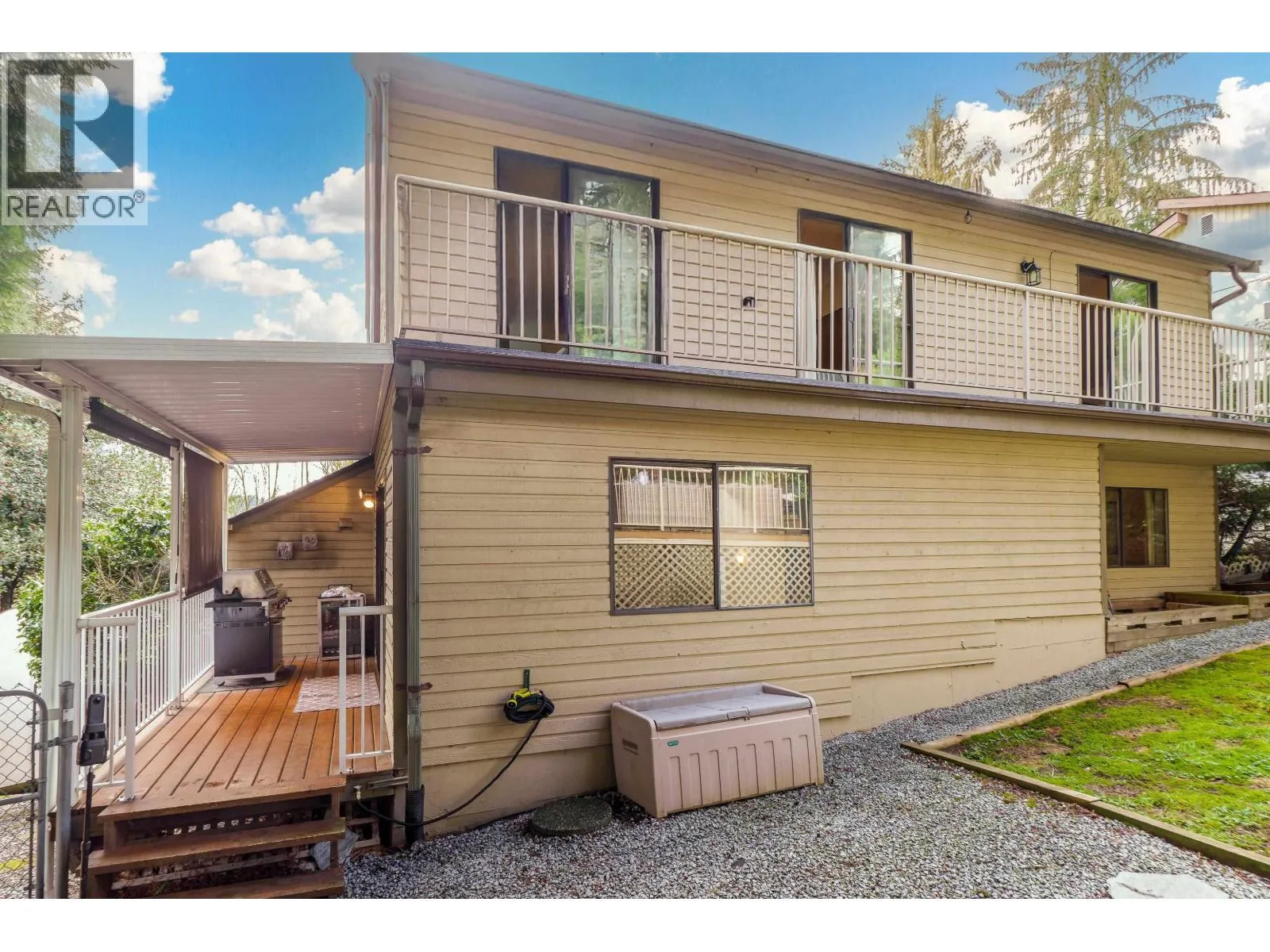 Upper Eagle Ridge: Enjoy the private back yard retreat & oasis with serene setting & custom 530 square feet multi-level deck great for entertaining! Semi-Custom west coast architectural style. 4 bed, 3 bath featuring vaulted ceilings & huge skylight. Main floor features kitchen with plenty of cupboard space, large dining room & oversized family room with VIEW & beautiful wood burning feature fireplace & slider to fully fenced backyard. Enjoy the lower-level living room with private deck. Upper floor with primary bed featuring walk in closet, 3 pc ensuite & slider to private balcony. The 3 other bdrms are a good size. 2 car garage and storage shed. Pride of ownership truly shows. Walk to all levels of schooling including Douglas College, transit, recreation and shopping. (id:27476)