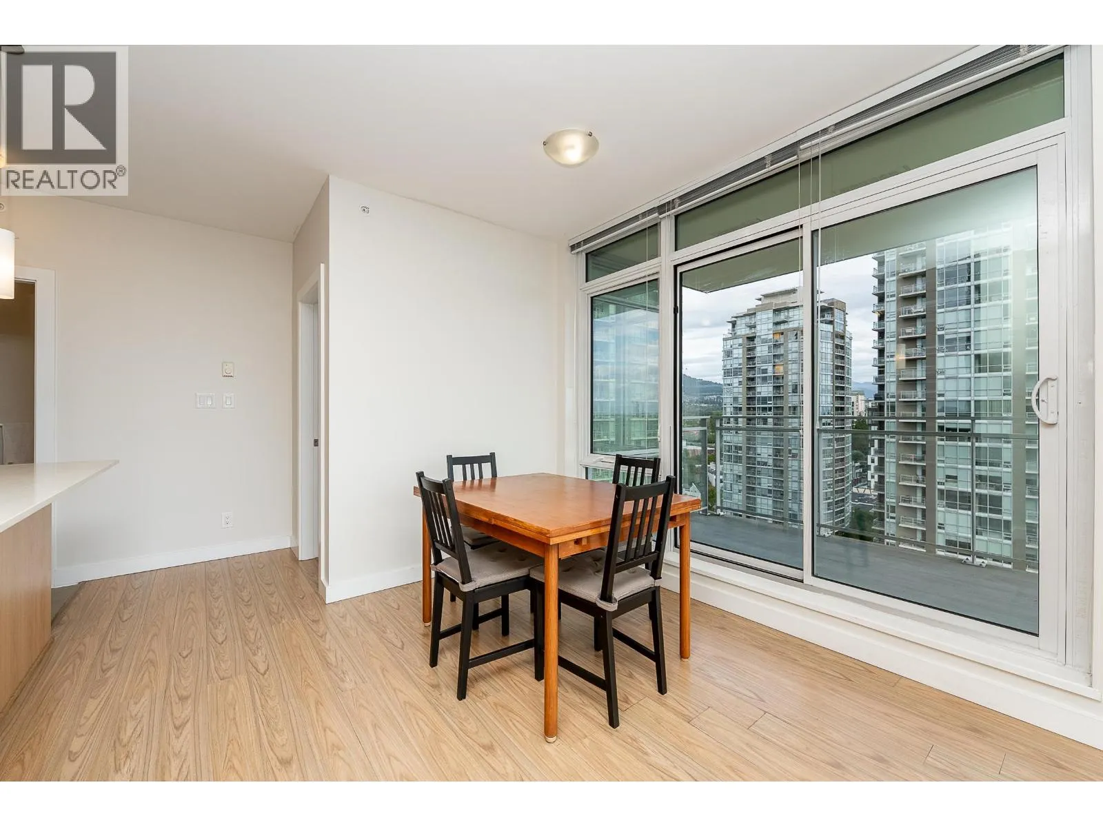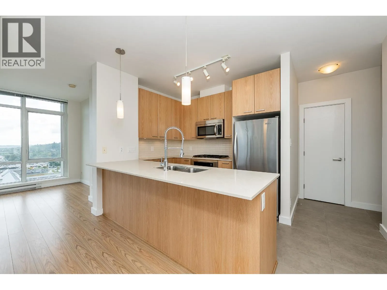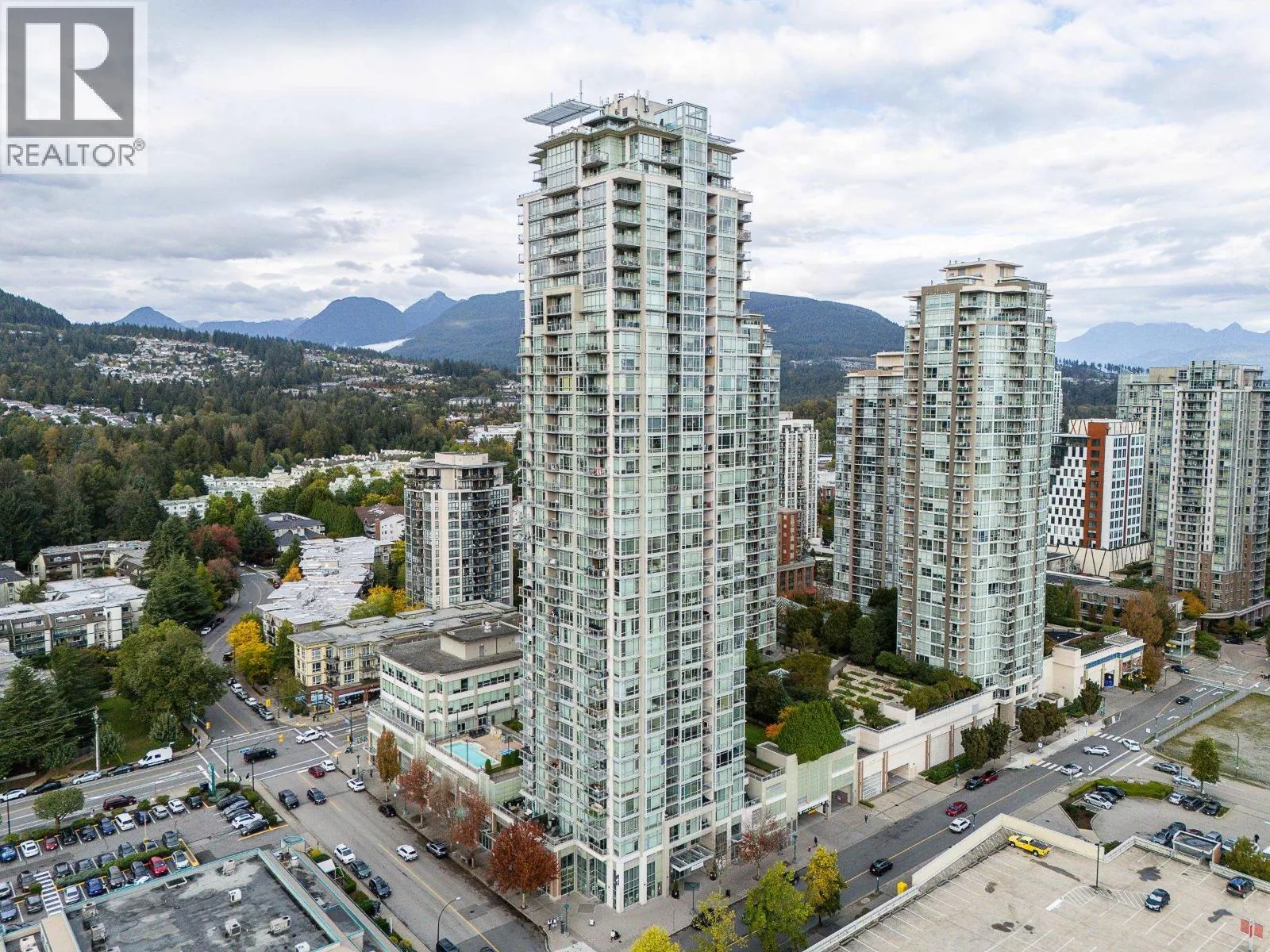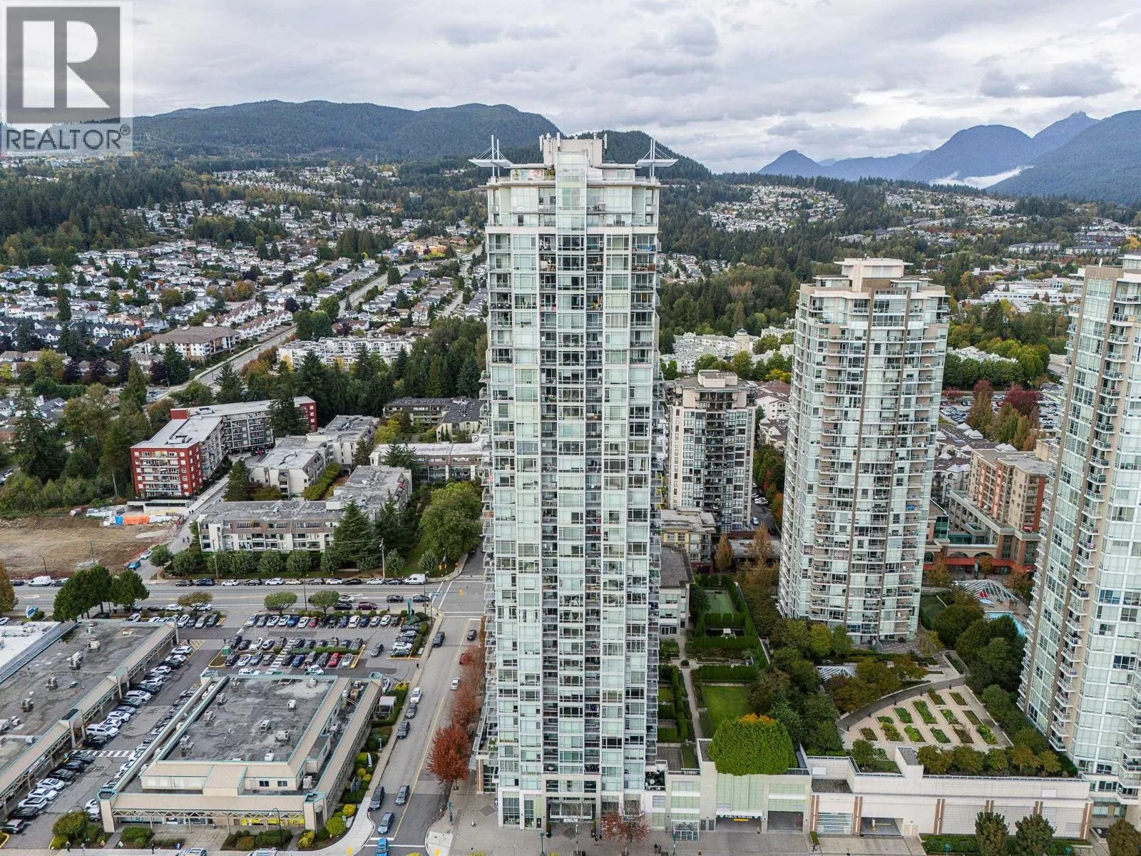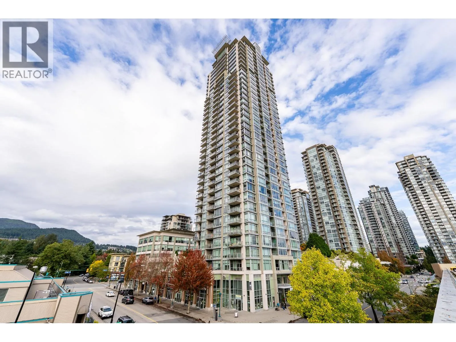 Welcome to this modern and bright 2 bed, 2 bath, 825 square ft corner unit, w/South and East-facing exposure. This well designed home is filled with natural light, offering an open and efficient layout with city and mountain views! Enjoy a dedicated foyer with a hallway that leads to a kitchen equipped with S/S appliances, gas cooktop, built-in microwave, and peninsula w/counter seating. The spacious living and dining seamlessly connect with access to a private, covered balcony. Floor to ceiling windows in all rooms that flood in natural light! The primary bed has double closets and ensuite. A second bedroom and full bath provide added flexibility. Conveniently located in the heart of North Coquitlam, walking distance to Coquitlam Centre, all levels of transit, trails, shopping, and parks. (id:27476)