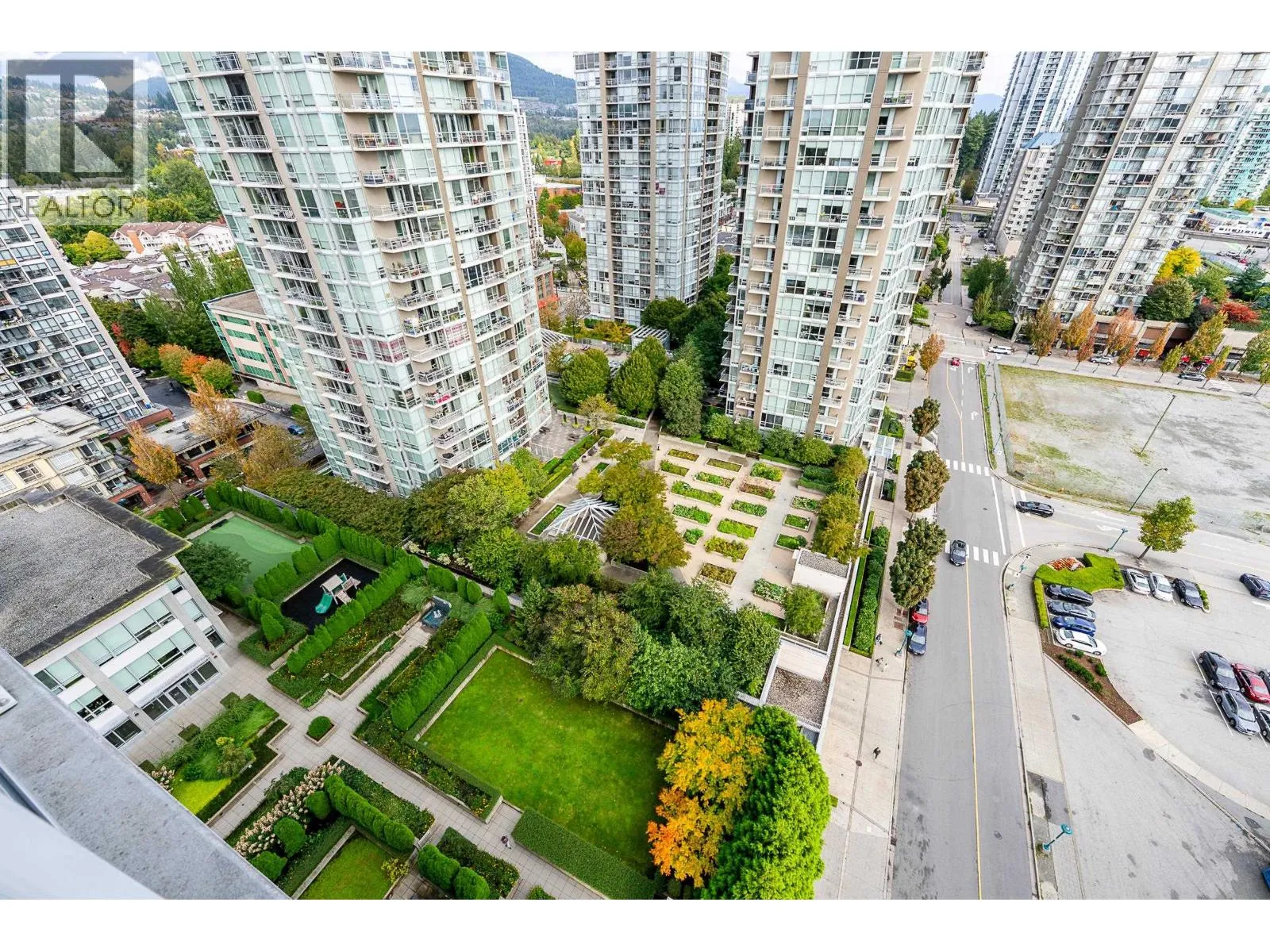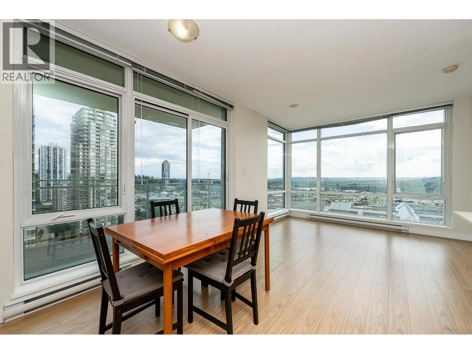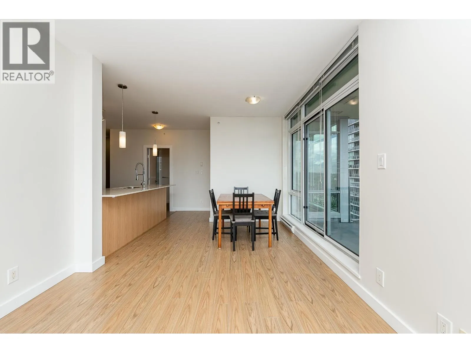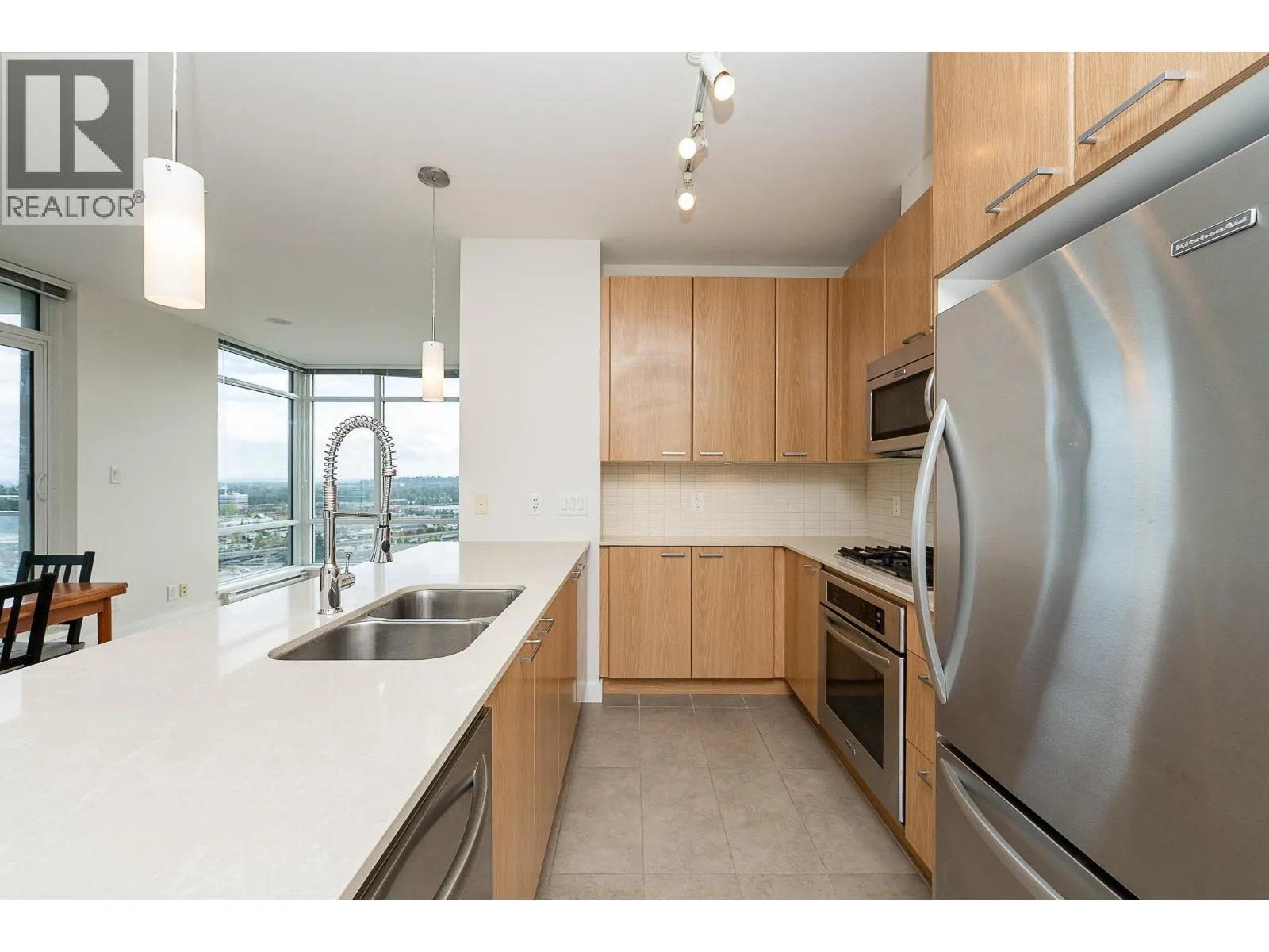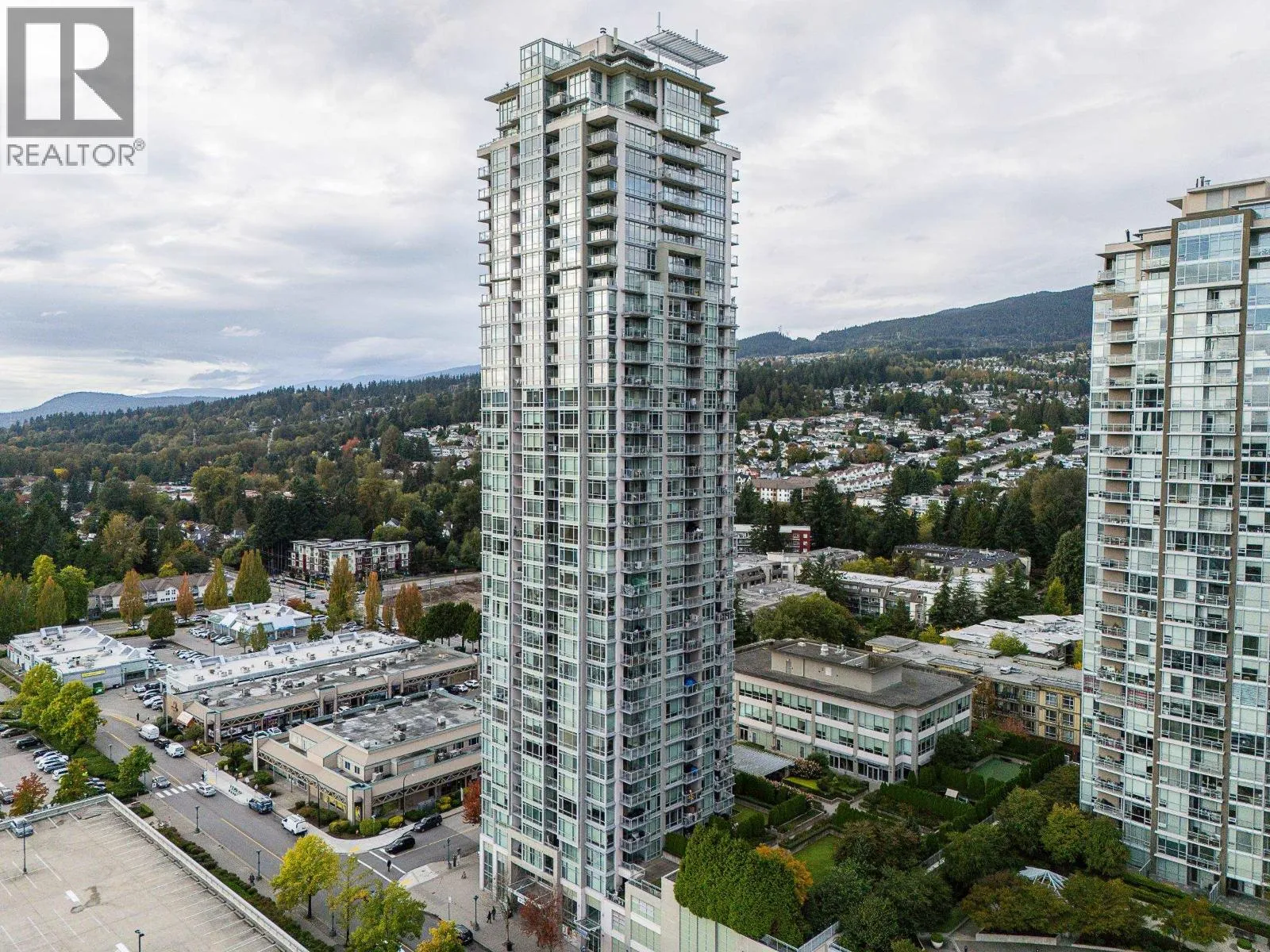 Welcome to this modern and bright 2 bed, 2 bath, 825 square ft corner unit, w/South and East-facing exposure. This well designed home is filled with natural light, offering an open and efficient layout with city and mountain views! Enjoy a dedicated foyer with a hallway that leads to a kitchen equipped with S/S appliances, gas cooktop, built-in microwave, and peninsula w/counter seating. The spacious living and dining seamlessly connect with access to a private, covered balcony. Floor to ceiling windows in all rooms that flood in natural light! The primary bed has double closets and ensuite. A second bedroom and full bath provide added flexibility. Conveniently located in the heart of North Coquitlam, walking distance to Coquitlam Centre, all levels of transit, trails, shopping, and parks. (id:27476)