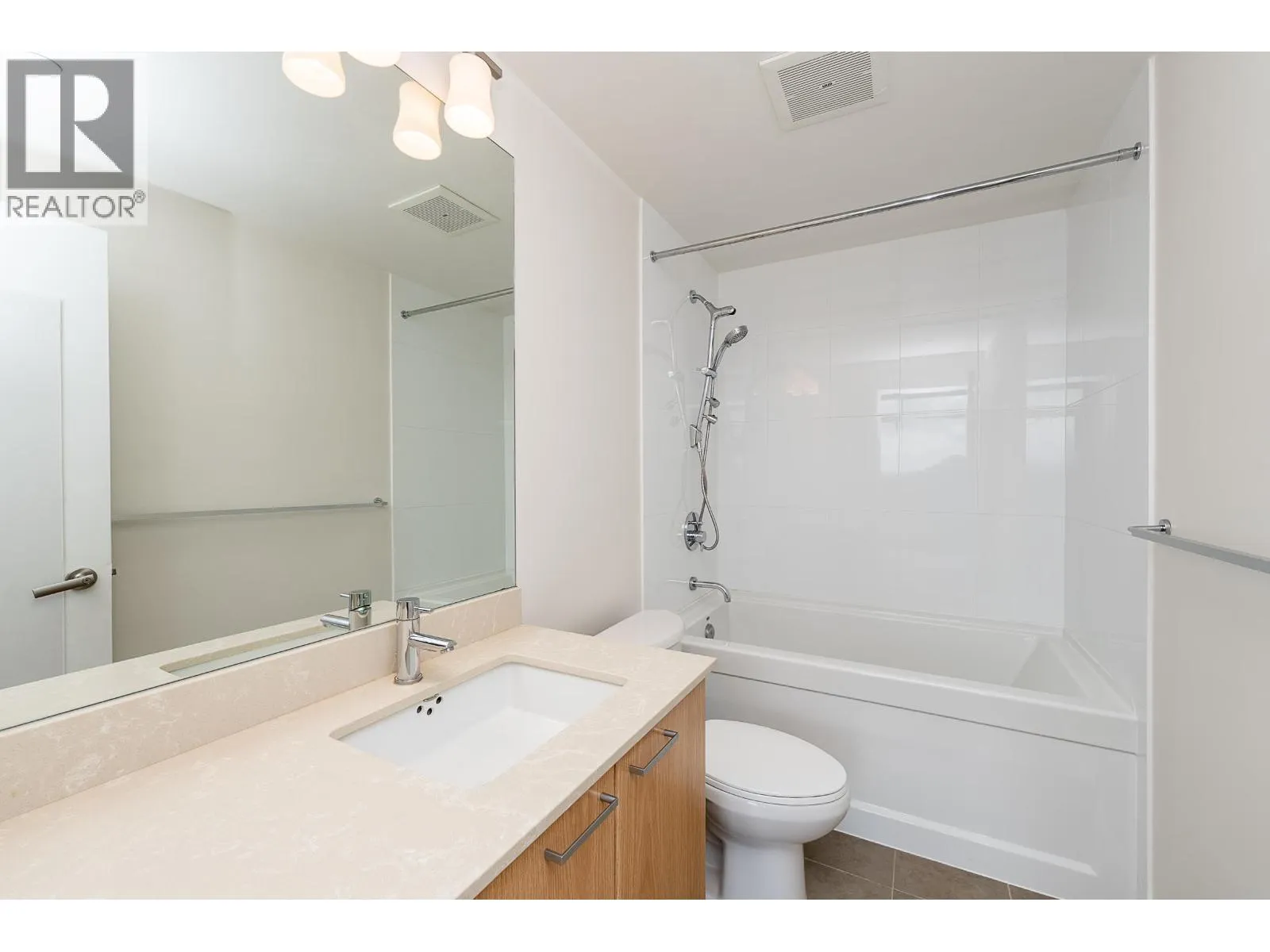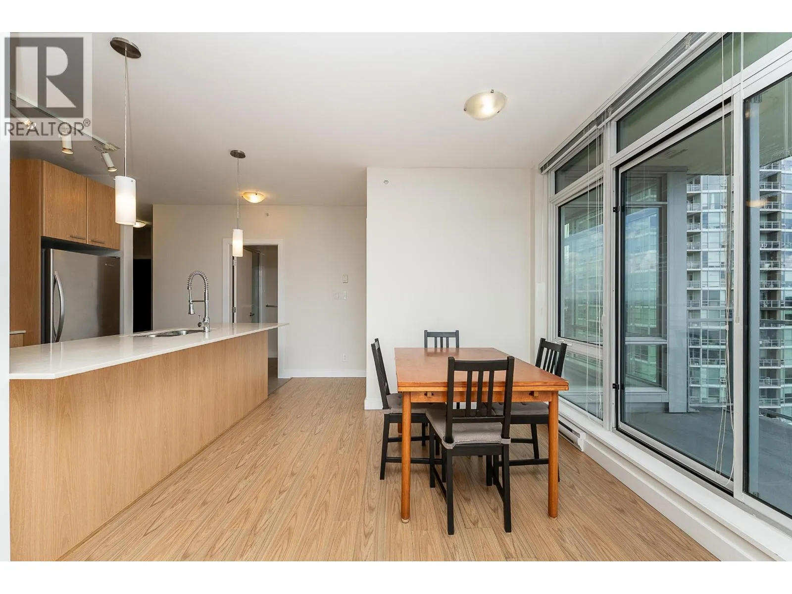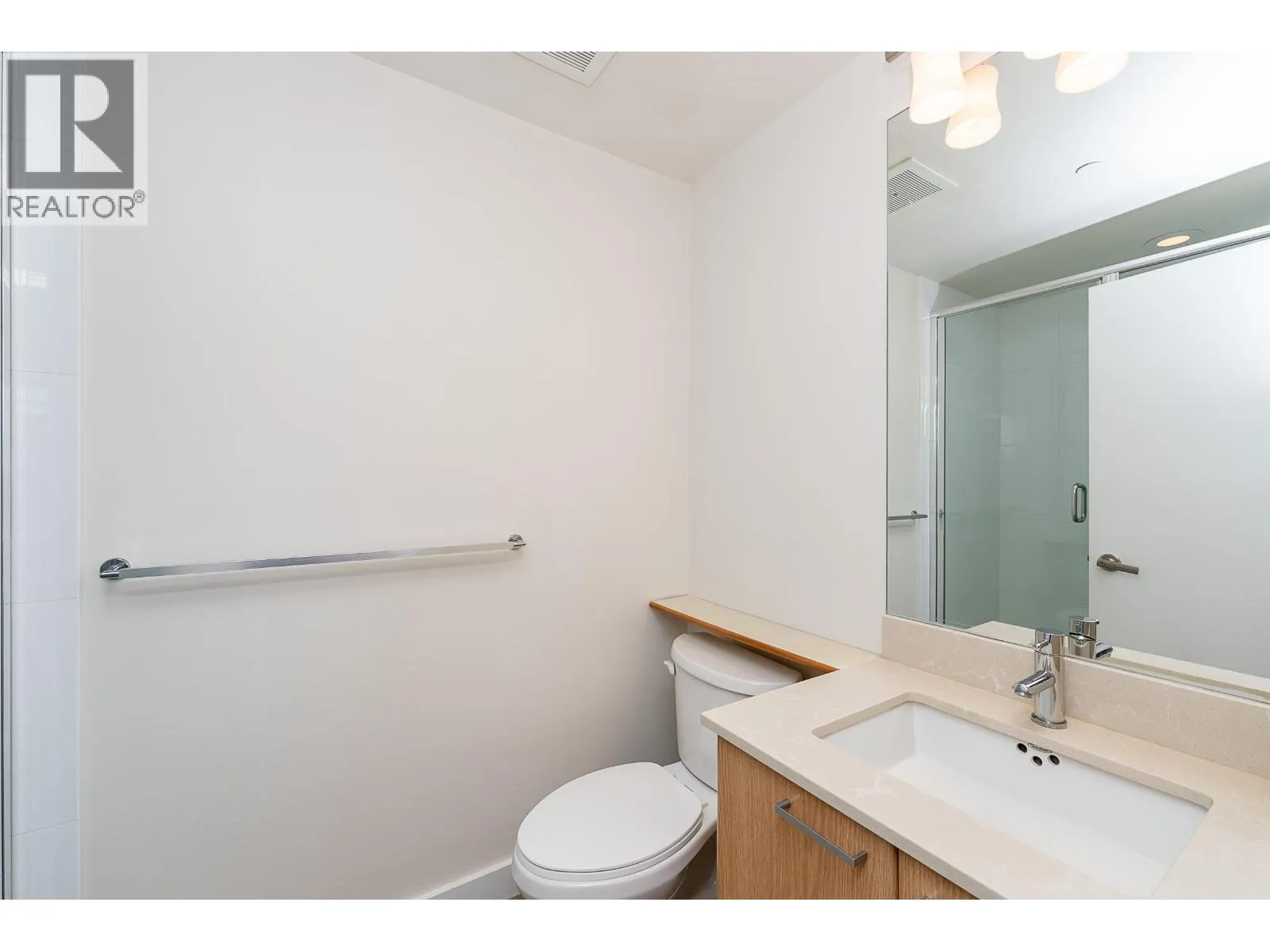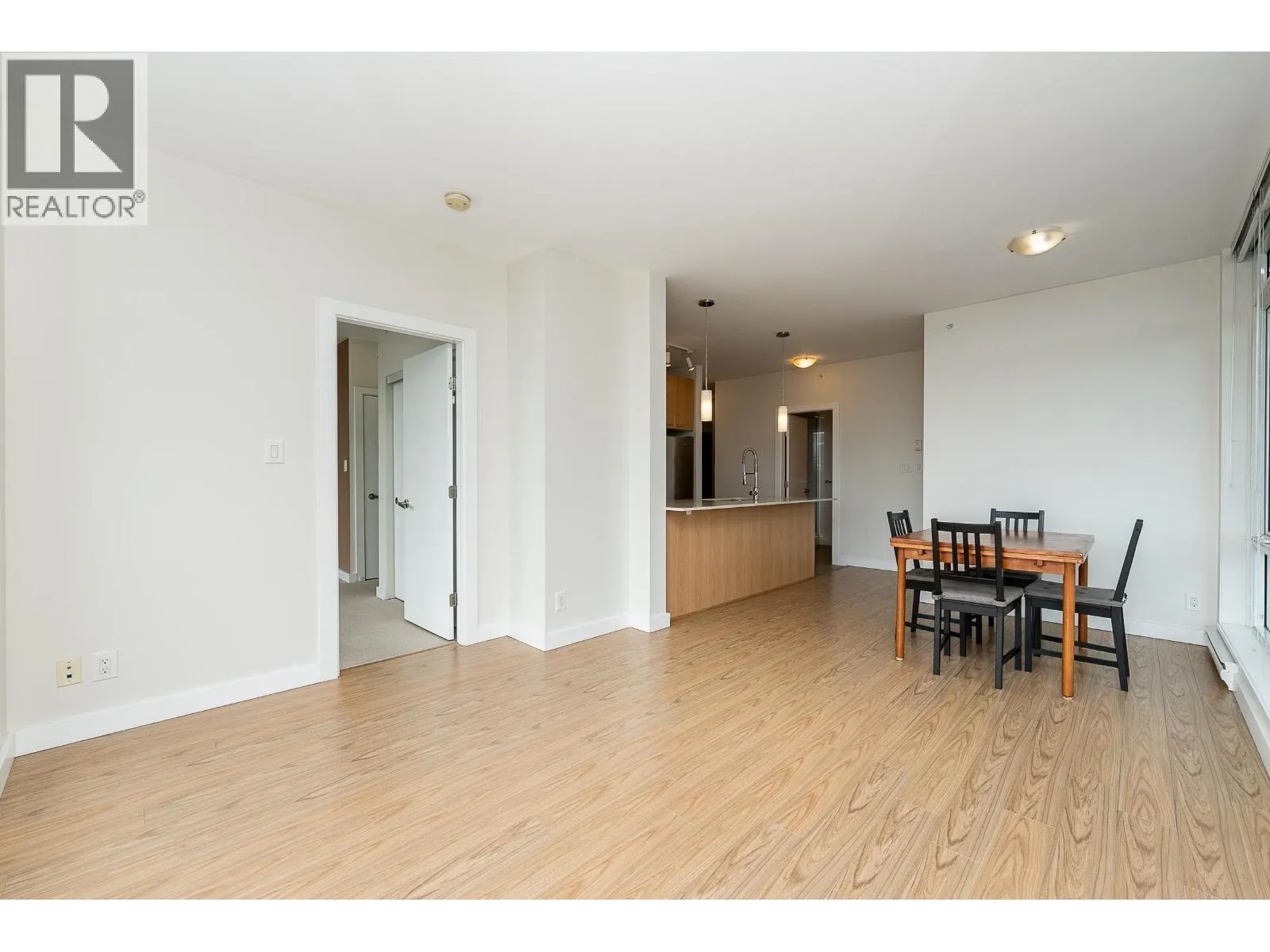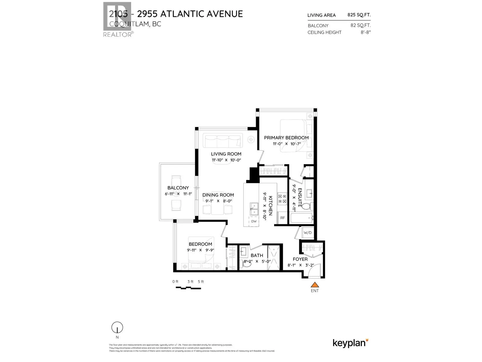 Welcome to this modern and bright 2 bed, 2 bath, 825 square ft corner unit, w/South and East-facing exposure. This well designed home is filled with natural light, offering an open and efficient layout with city and mountain views! Enjoy a dedicated foyer with a hallway that leads to a kitchen equipped with S/S appliances, gas cooktop, built-in microwave, and peninsula w/counter seating. The spacious living and dining seamlessly connect with access to a private, covered balcony. Floor to ceiling windows in all rooms that flood in natural light! The primary bed has double closets and ensuite. A second bedroom and full bath provide added flexibility. Conveniently located in the heart of North Coquitlam, walking distance to Coquitlam Centre, all levels of transit, trails, shopping, and parks. (id:27476)