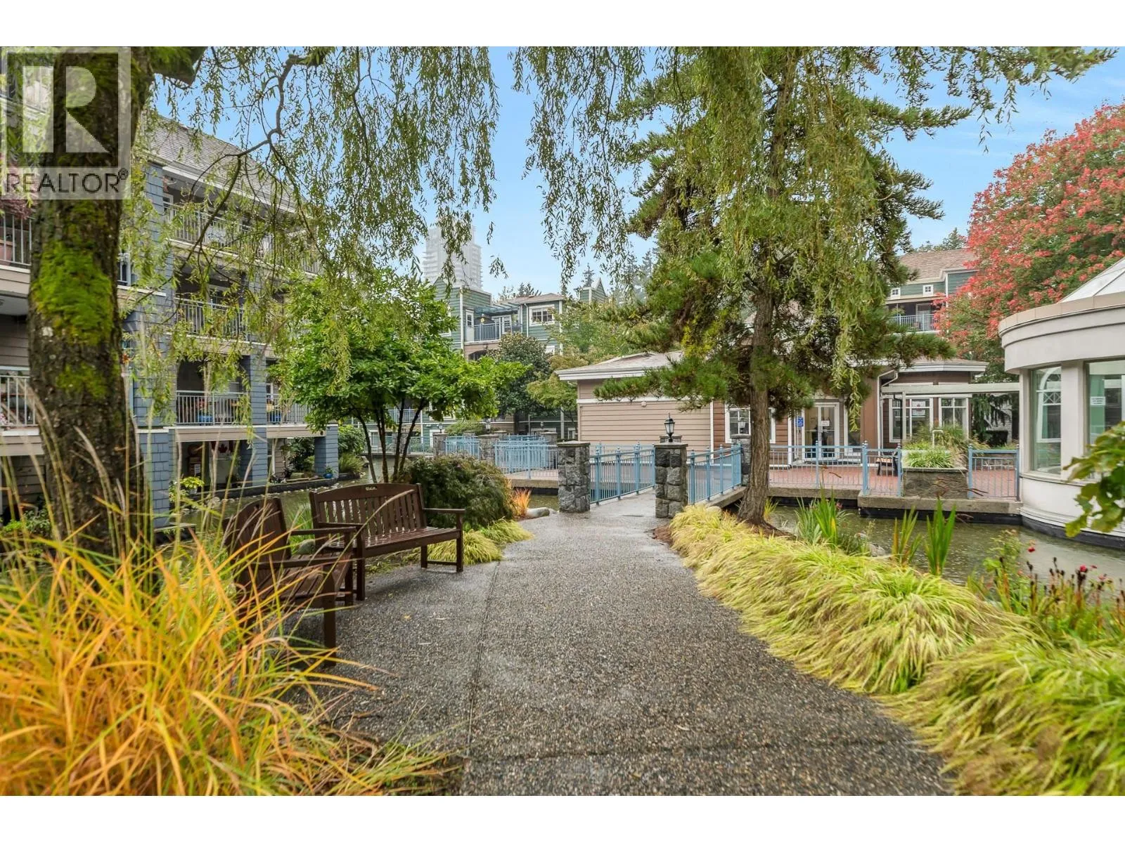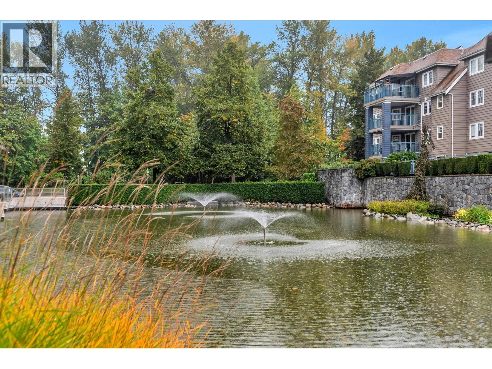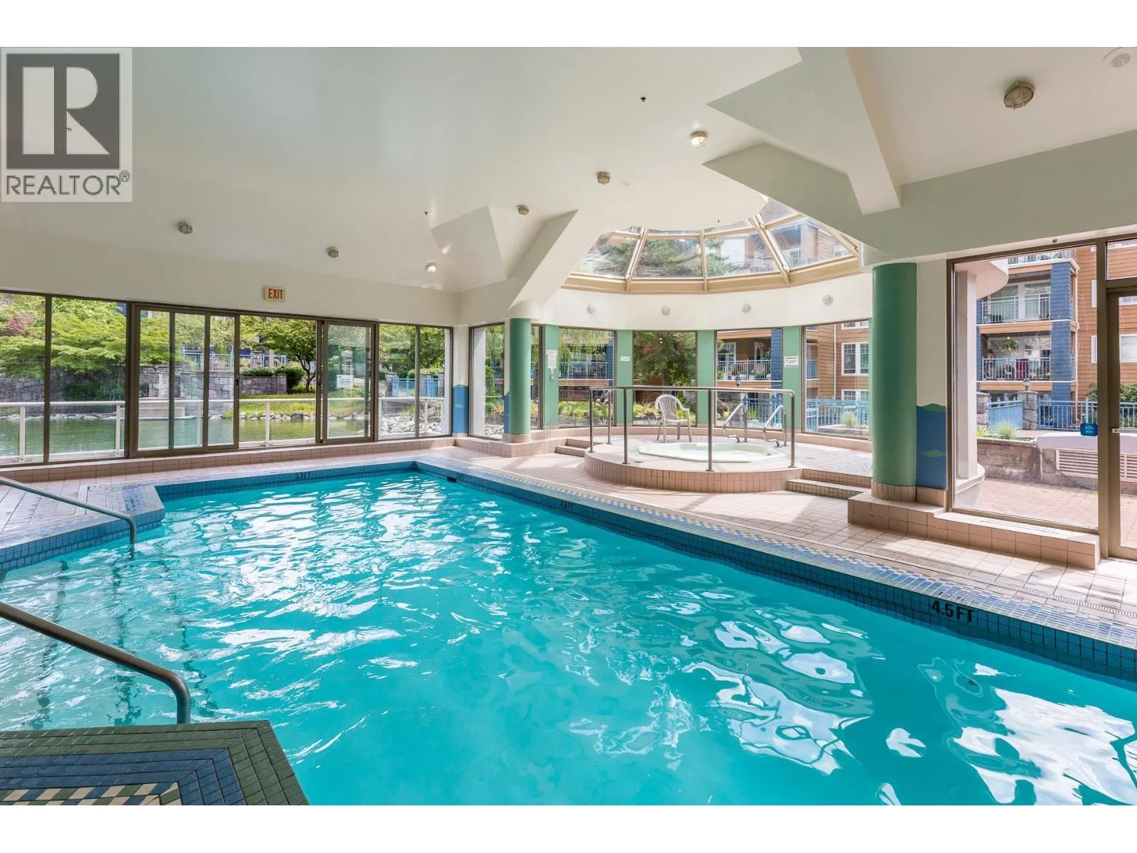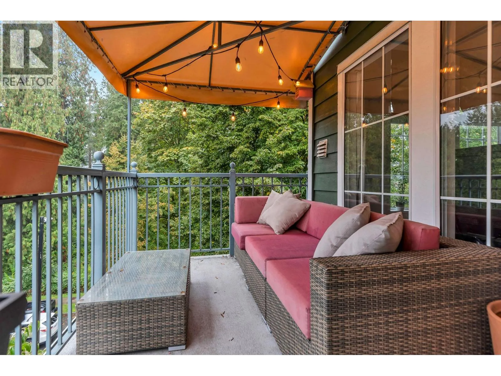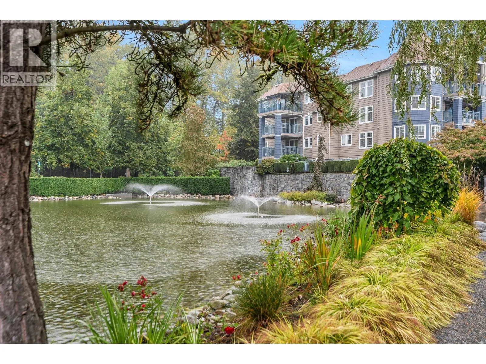 Top-floor comer gem at Lakeside Terrace! This bright and inviting 2-bed, 2-bath home impresses with soaring 13' vaulted ceilings and rare East, South and West exposures with an abundance of light. Relax on your expansive, sunlit covered deck overlooking lush greenery-perfect for year-round enjoyment. The open, airy layout features a bright kitchen, cozy gas fireplace (gas included in strata fees), and a generous primary suite with walk-through closets and a spa-inspired ensuite. Includes parking and storage. Set amid tranquil water features and gardens, this well maintained resort-style community offers an indoor pool, two hot tubs, saunas, gym, party room, guest suite-just steps from Lafarge Lake, SkyTrain, parks, and Coquitlam Centre. Discover your sanctuary at the heart of Coquitlam. (id:27476)