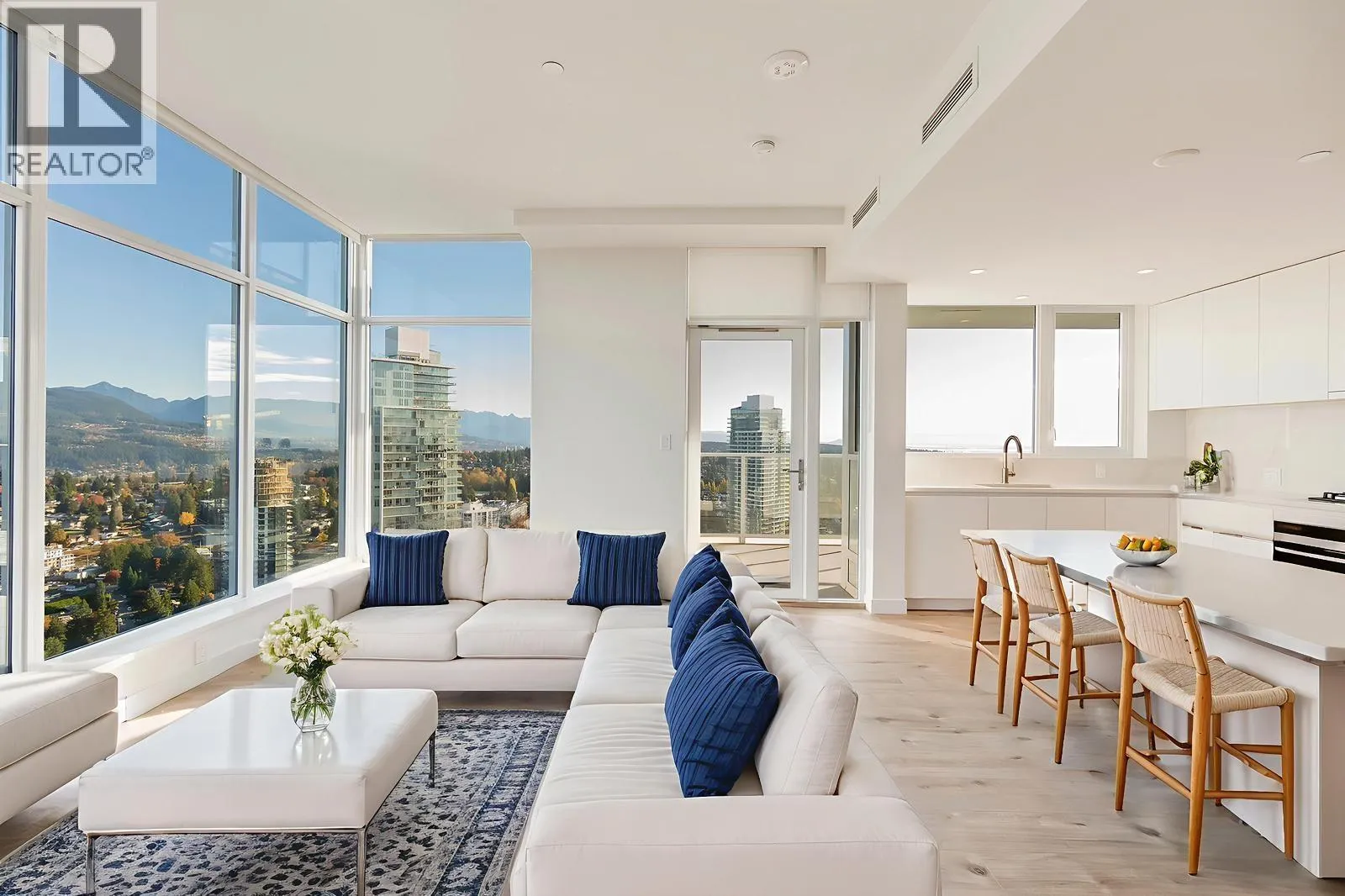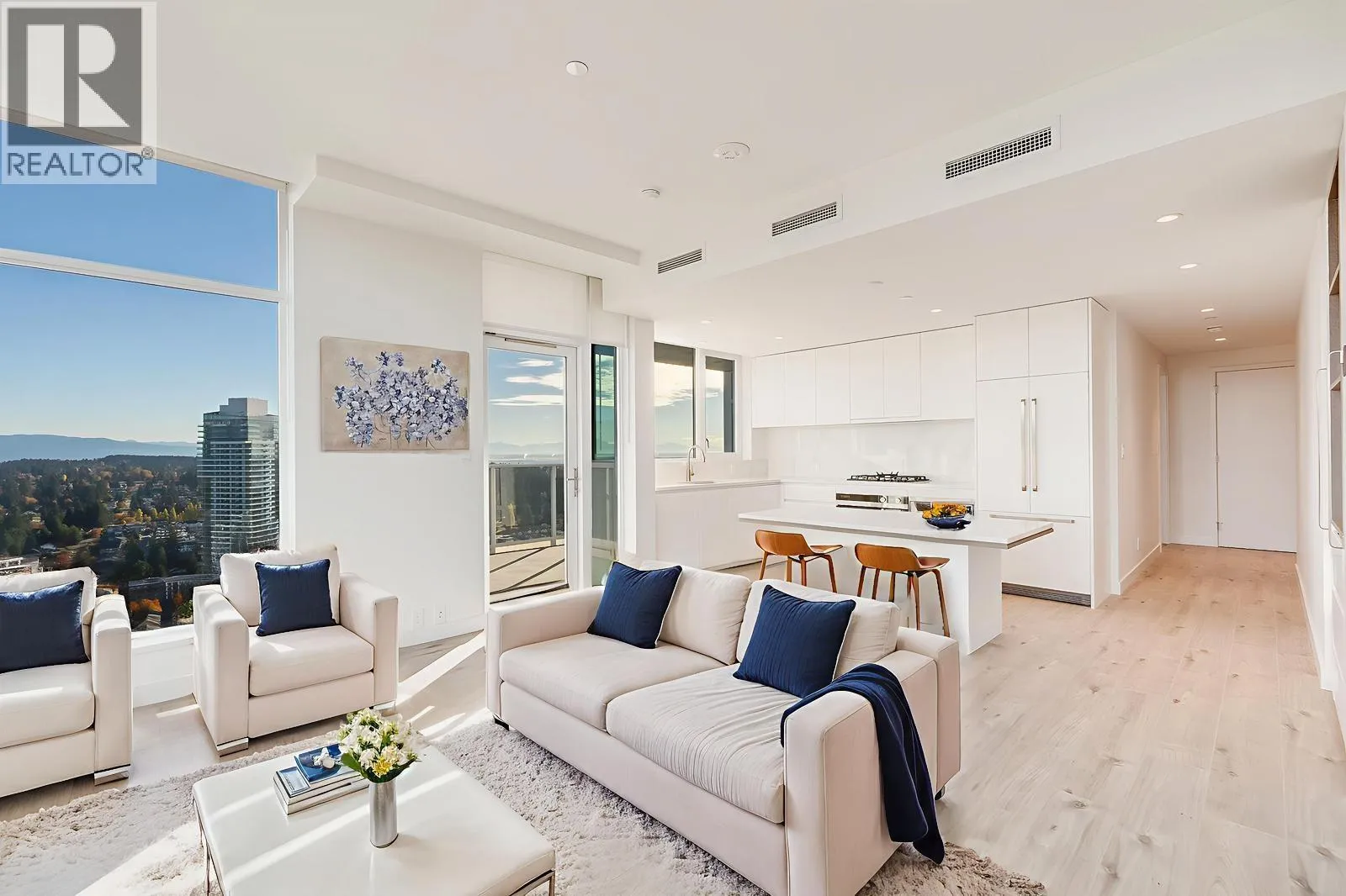 Experience elevated living in this stunning Sub-Penthouse at Smith & Farrow by Boffo. This corner 2 bed, 2 bath home offers 936 square ft of refined space on the 44th floor, showcasing panoramic city, mountain, and water views. The open layout features a large kitchen island, generous dining area, and plenty of storage. Enjoy sophisticated interiors, premium finishes, and floor-to-ceiling windows that fill the home with natural light. Residents have access to world-class amenities including a fitness centre, outdoor pool, concierge, and elegant social lounges. Perfectly located steps from SkyTrain, shopping, and parks - this is luxury living at its finest in Burquitlam. (id:27476)