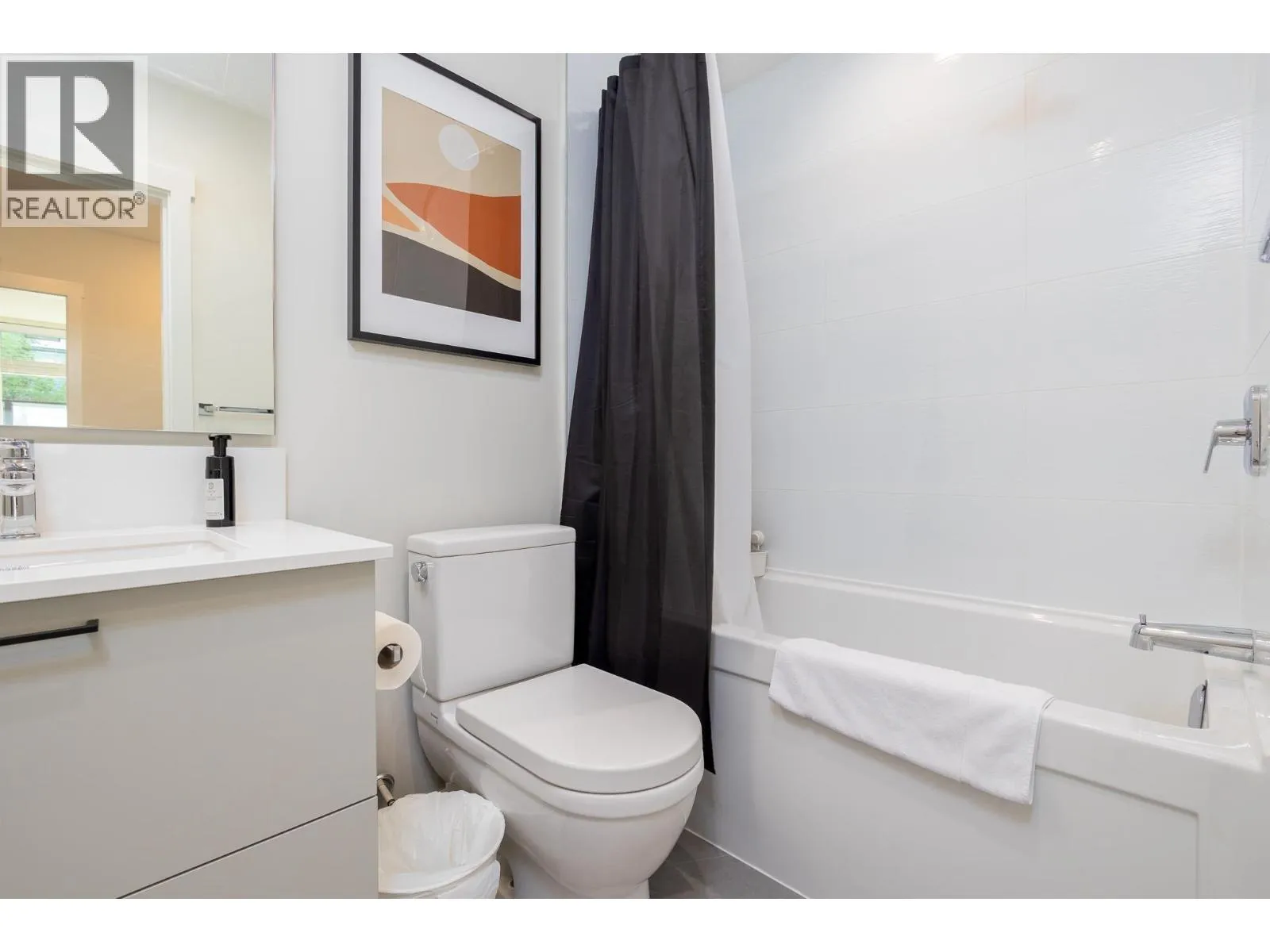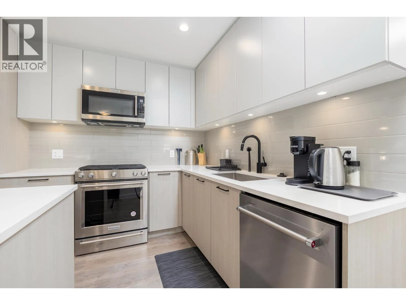 Duet II City Townhome! Super Bright, south facing corner unit with 300sqft patio for outdoor entertainment. This spacious ground level 2 bed 1 bath home has a functional layout. Open gourmet kitchen, large living room, dining room, and both bedrooms all on the same floor. Large floor-to-ceiling windows, in suite laundry, plus a custom built full wall cabinet in the master bedroom. 1 Parking and 2 Lockers. Walking Distance to Skytrain Station, shopping and Parks. Call now for details! (id:27476)