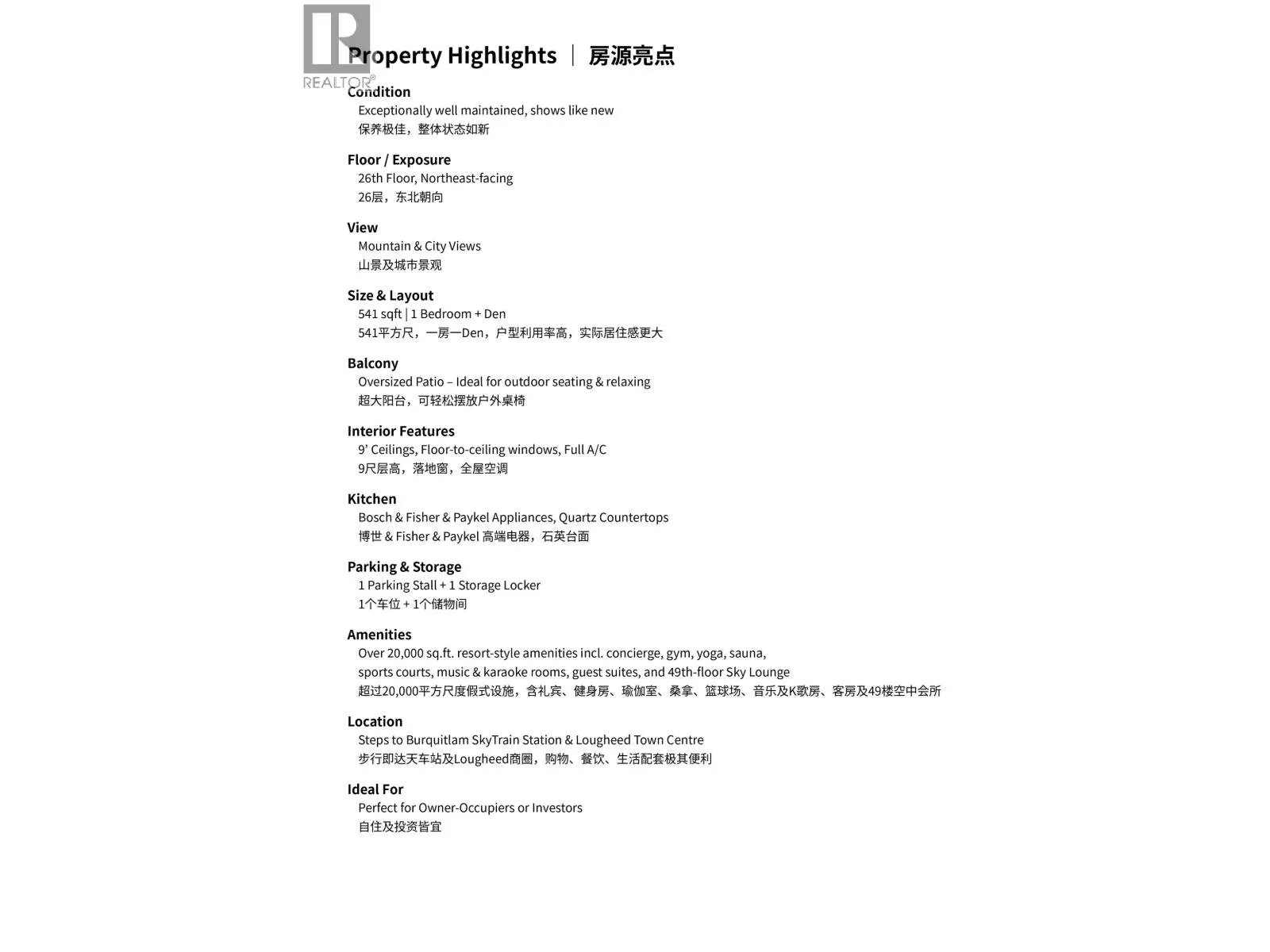 567 Clarke + Como by Marcon. Well maintained and shows like new. 1 Bed + Den on the NE-facing side with mountain and city views. Features 9´ ceilings, full A/C, and floor-to-ceiling windows. Gourmet kitchen with Bosch & Fisher & Paykel appliances, quartz counters, and sleek cabinetry. Spa-inspired bathroom, oversized patio, 1 parking, and 1 storage locker. Over 20,000 sq.ft. amenities incl. concierge, fitness centre, sauna, sports courts, music & karaoke rooms, guest suites, and a 49th-floor Sky Lounge. Steps to Burquitlam SkyTrain Station, shops & dining. Open House: 2-4pm, Jan.31, Sat. (id:27476)