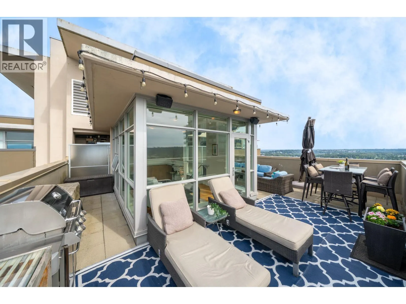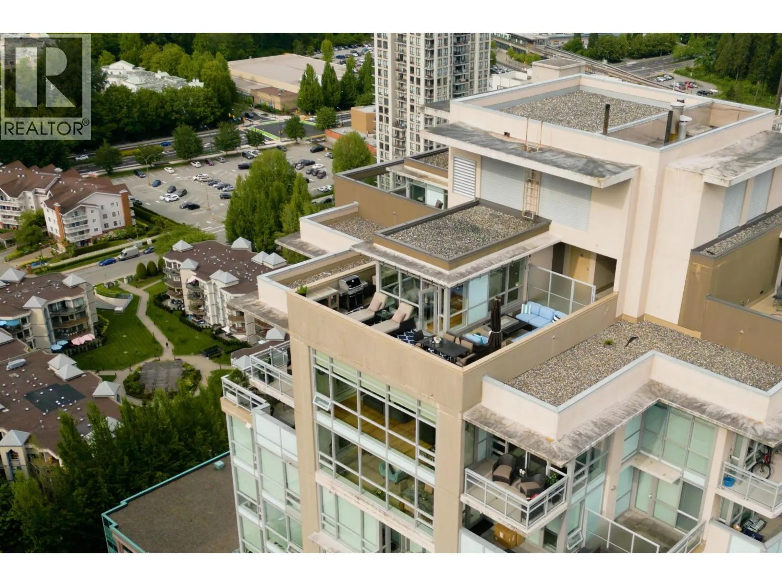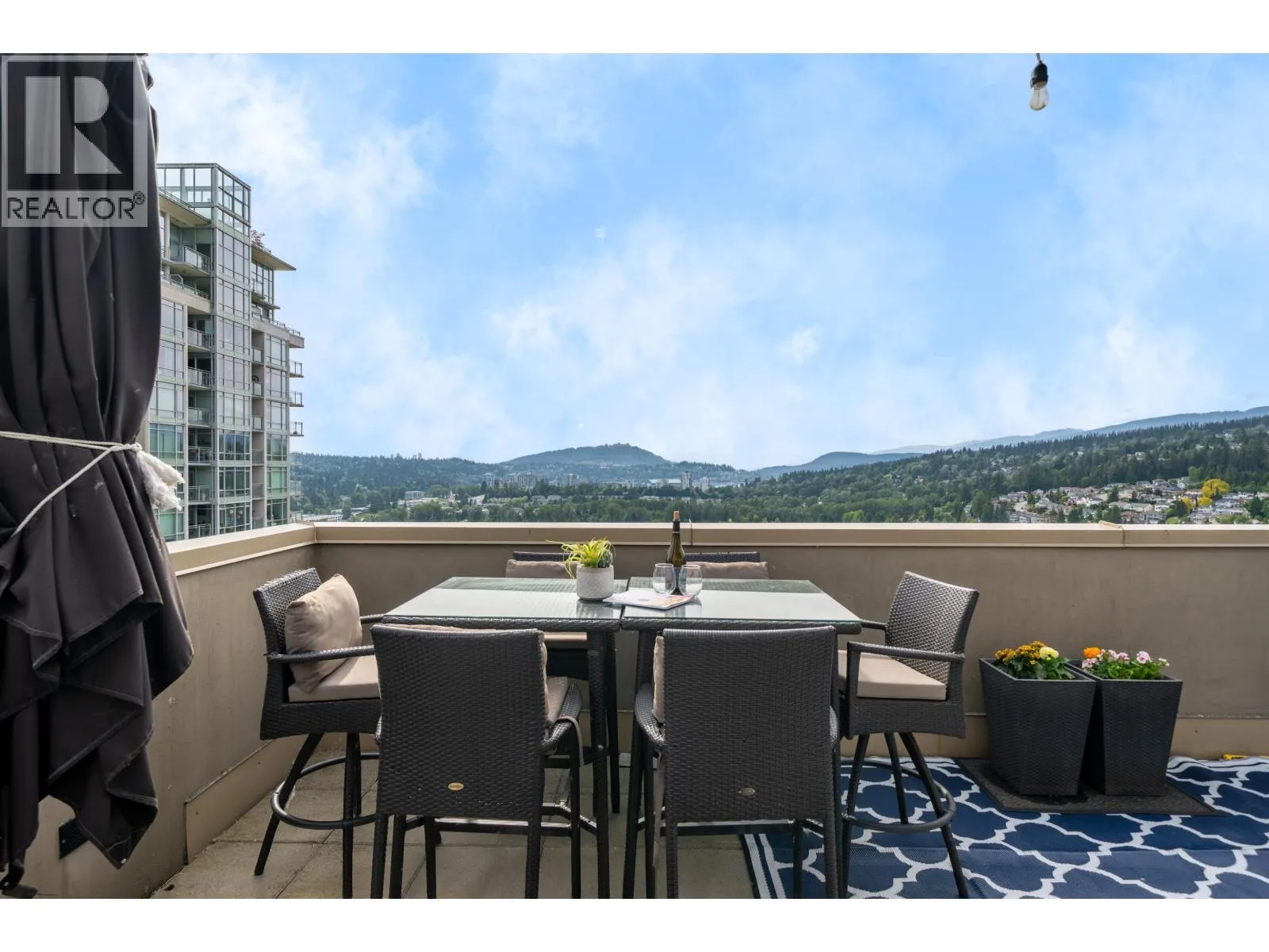 Elevate your lifestyle in this signature two-storey penthouse soaring above the heart of Coquitlam. Walls of glass showcase cinematic views of Westwood Plateau, Burrard Inlet, and the city skyline, while rich hardwood and refined designer finishes create a striking, modern ambiance. Entertain at the dramatic 12-ft kitchen island with wine fridge, unwind in the renovated spa-inspired ensuite, and enjoy smart luxury with Sonos, powered blinds, and integrated lighting. Bedrooms are privately separated with their own patios, plus a spectacular 484 sq.ft. rooftop terrace in the sky. Steps to SkyTrain, Lafarge Lake, Coquitlam Centre, shops and dining. In-suite laundry, storage locker, two parking; pets and rentals allowed. Showings by Appointment only. (id:27476)