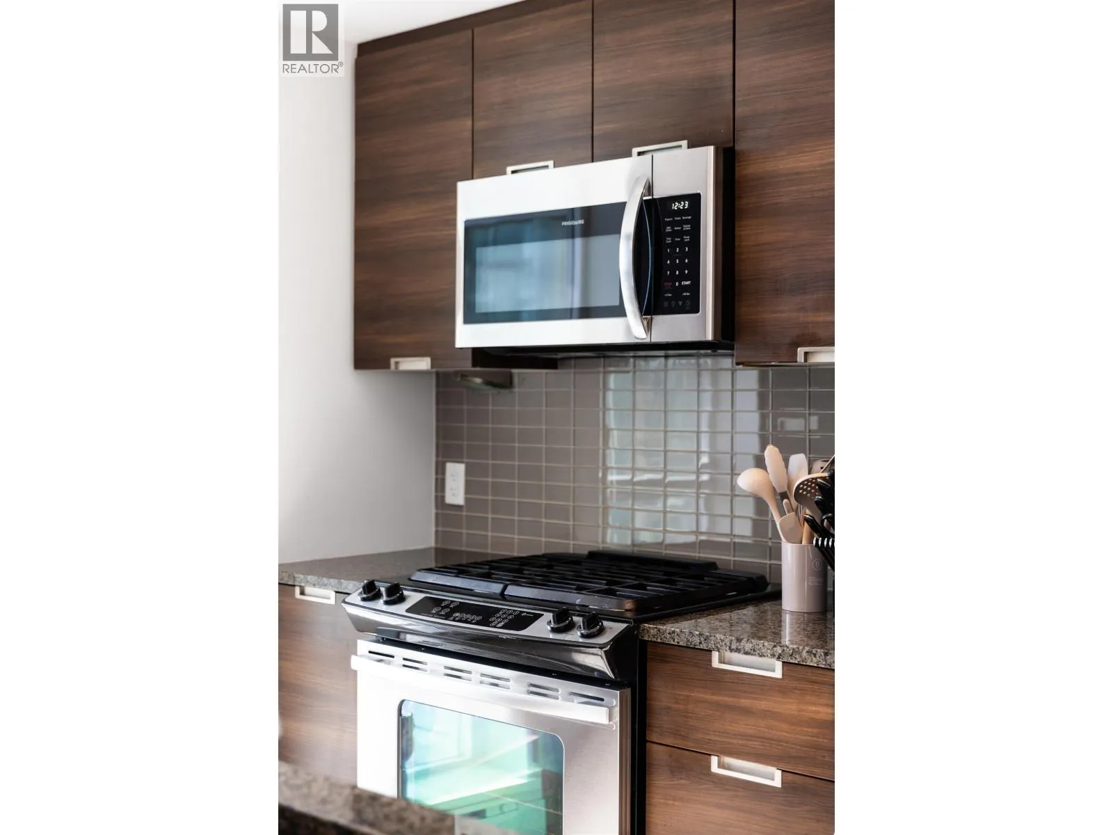 Over $10,000 in upgrades. Freshly painted & tastefully updated w/brand-new LG washer & dryer, Frigidaire range hood & microwave, an updated Riobel kitchen faucet, & other thoughtful improvements. This SW facing corner home offers a functional 850 sf layout w/2 bdrms, 2 baths, 1 parking stall & 1 standard-size locker. Floor-to-ceiling windows & private balcony capture beautiful mountain & city views. The chef-inspired kitchen features a gas stove, granite countertops, and an open-concept design filled with natural light. The spacious primary bdrm includes an ensuite w/walk-in shower & exceptional Burnaby Mtn views. Located in solid concrete bldg w/resort-style amenities, steps to SkyTrain, Coquitlam Centre, schools, nature trails, & easy access to Hwy 1. (id:27476)
