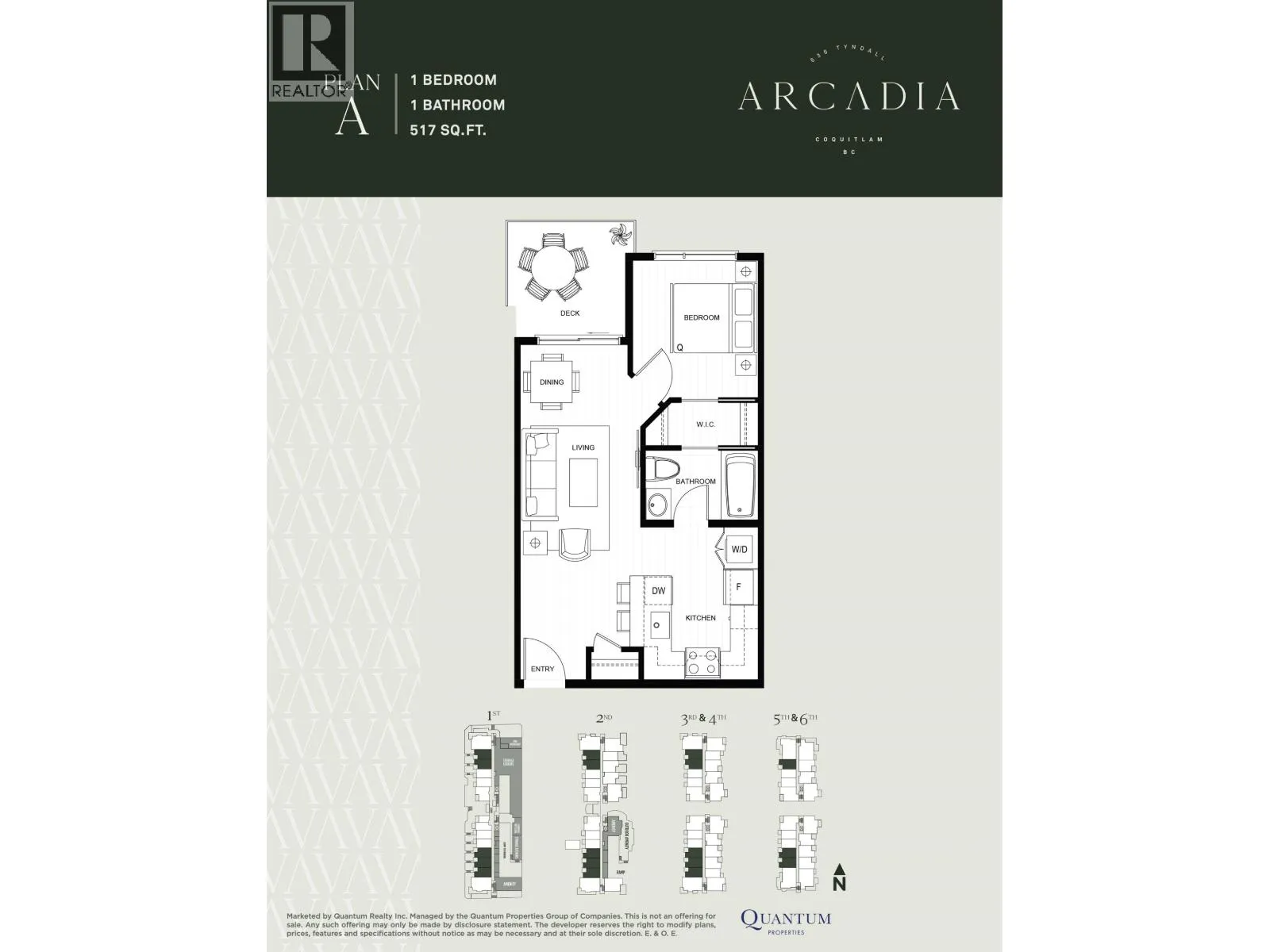 Welcome to Arcadia in Coquitlam West. This well-designed 1 bedroom, 1 bathroom home offers 517 sq. ft. of contemporary living with a functional open-concept layout & one secured underground parking stall included. Bright living & dining areas feature 9´ ceilings, laminate flooring, & central air conditioning. The modern kitchen is finished with quartz countertops, two-tone cabinetry, stainless steel appliances, & soft-close drawers. The bedroom features a walk-in closet & a spa-inspired bathroom with porcelain tile, matte black fixtures, & an undermount sink. Enjoy a private balcony plus amenities including a fitness centre, clubhouse, bike room, playground, & storage. Steps to SkyTrain, parks, & shopping. Only 5% deposit required to secure a home. Presentation Centre: 4 - 555 Clarke Road, Coquitlam. Pets & rentals allowed. (id:27476)