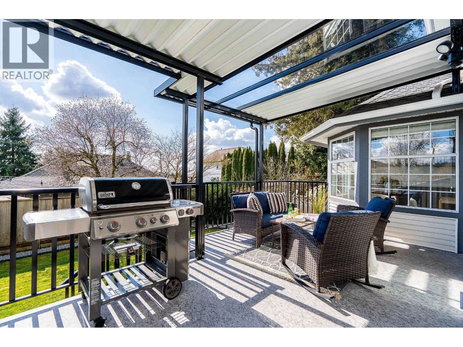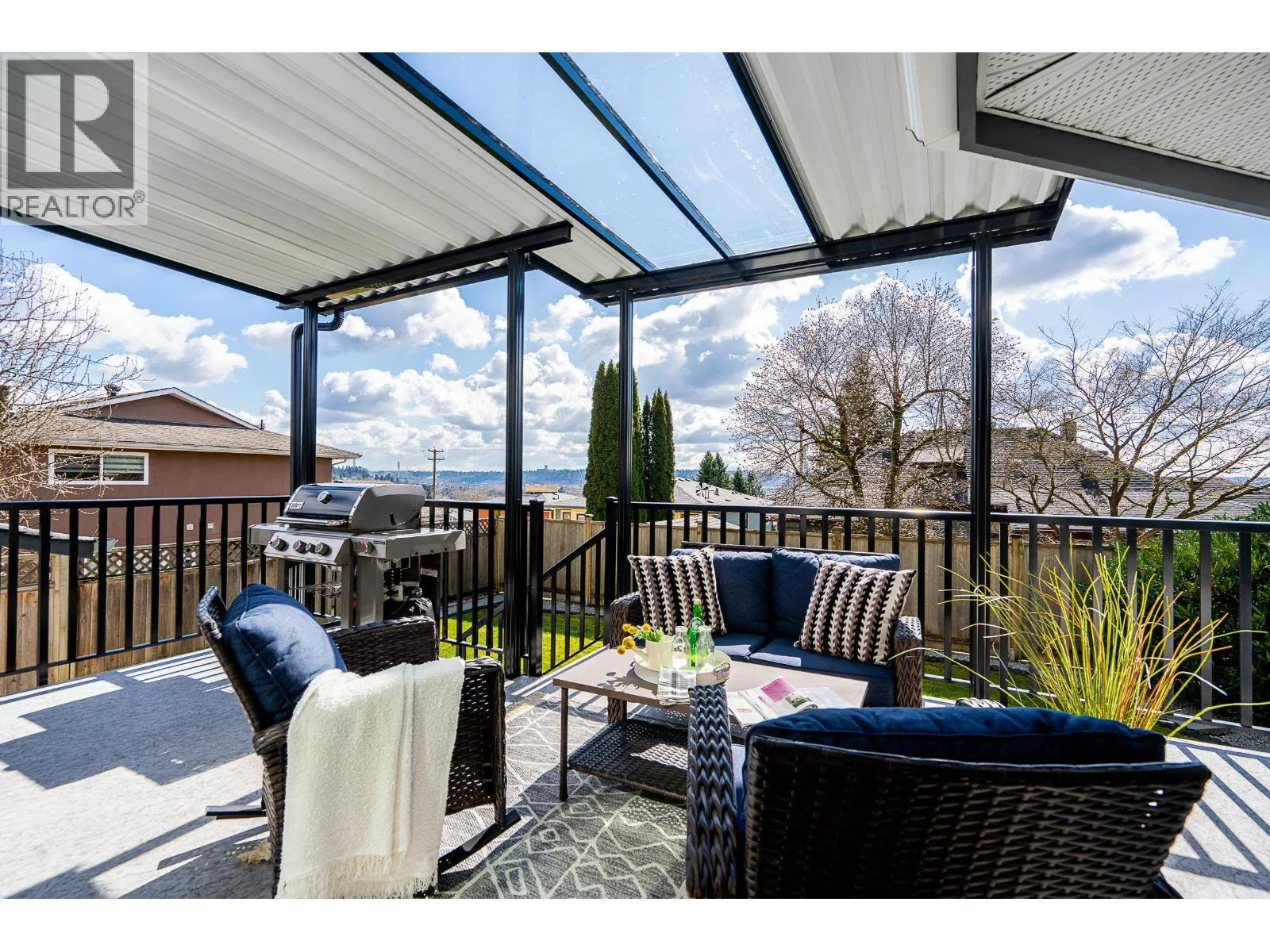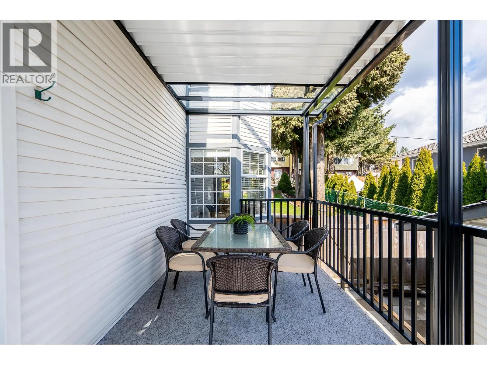 Duplex home with a single family home feel! This bright and airy 3 bed, 3 bath home offers gorgeous, updated living space with an impressive, private, sun-filled backyard! On the main is a generous living room with a cozy gas fireplace. Dining seamlessly connects to an updated kitchen w/quartz countertops, white cabinetry, gas cooktop, custom cabinetry, shelving and a breakfast nook framed by windows. Step off the dining room onto a large, wrap around, deck with awning and take in South views! Up the primary bed offers mountain and river views and a private ensuite. Two additional beds are well-sized and enjoy beautiful views. Heat pump, furnace, hot water tank 2023. Situated on a quiet street with quick access to the Highways, IKEA, Lougheed SkyTrain, amenities and shopping. (id:27476)