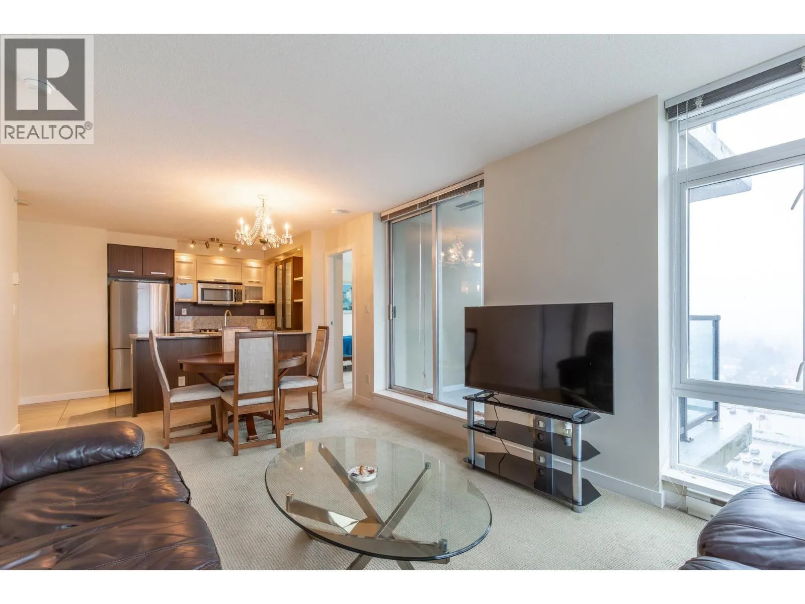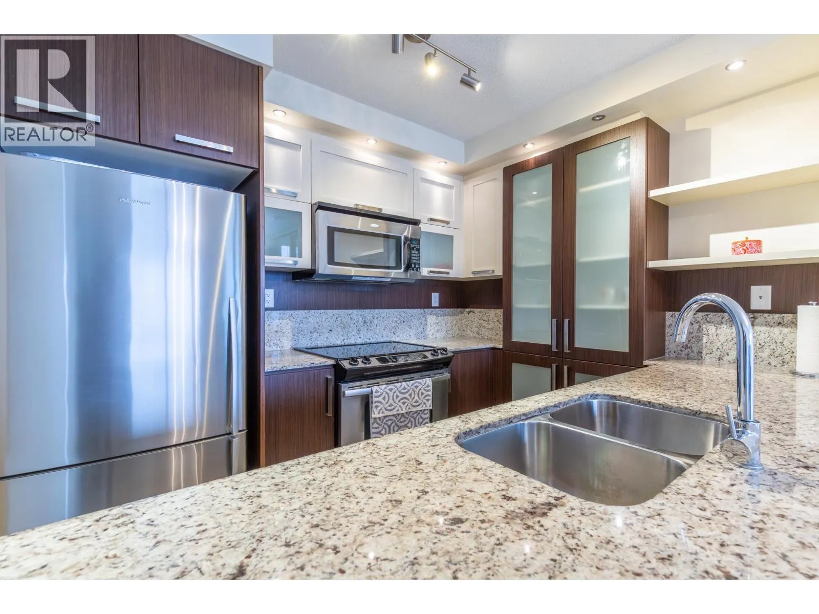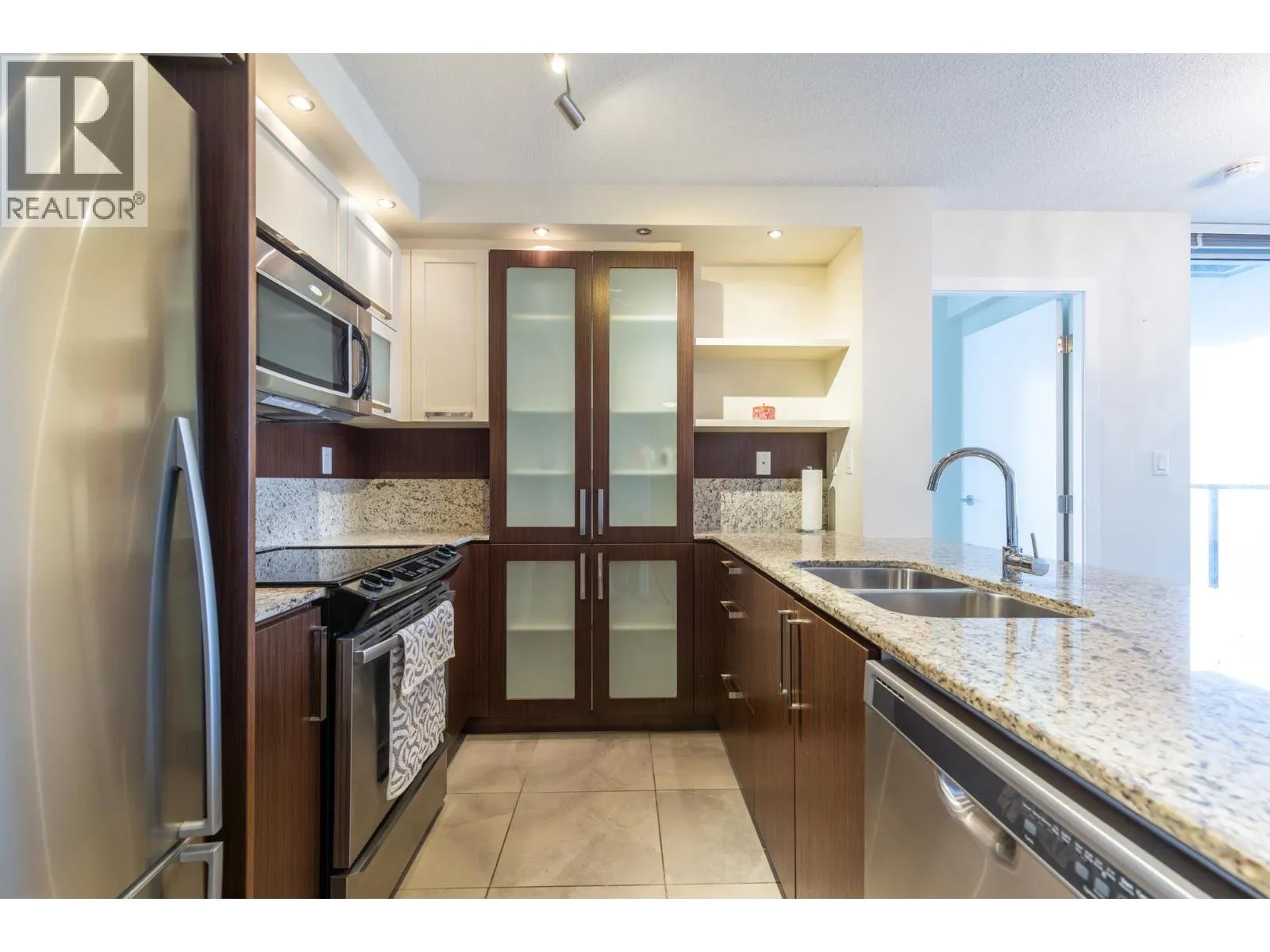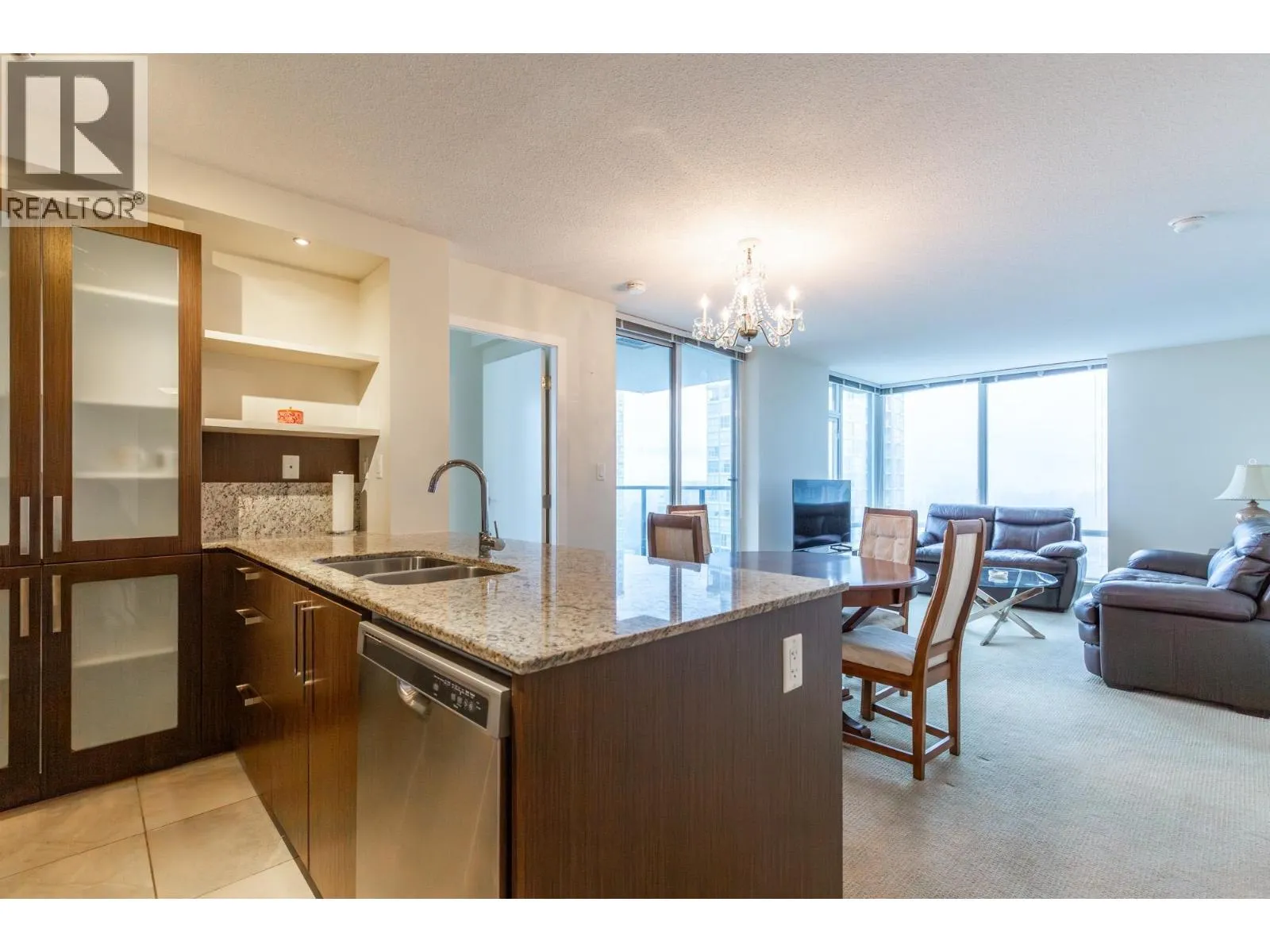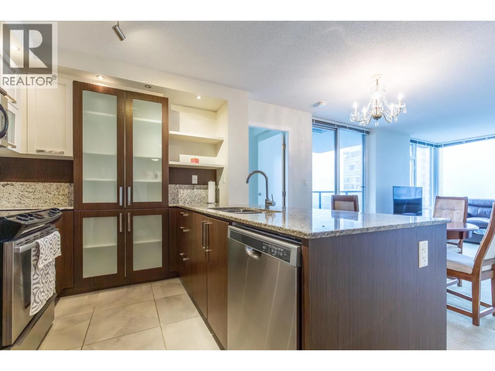 Lovingly maintained "Corner Unit" with great views. Excellent open floor plan with the living area separating the bedrooms for privacy. A private entry with a large storage closet and tile flooring leading to the kitchen and living area. The kitchen is open to the living area with lots of cabinets including a pantry and wonderful granite counters and backsplash. Stainless steel appliances. Floor to ceiling windows which allows fabulous natural light! A spacious open living and dining room. Both bedrooms are a generous size. The primary has his and hers closets with a lovely en-suite complete with a soaker tub and separate shower. The 2nd bedroom would make a great office / den or guest room. There is also another full bathroom with a shower. Secured parking and an additional storage locker (id:27476)