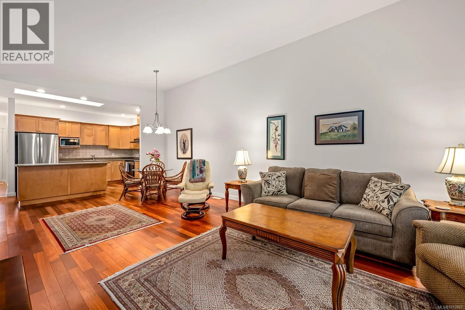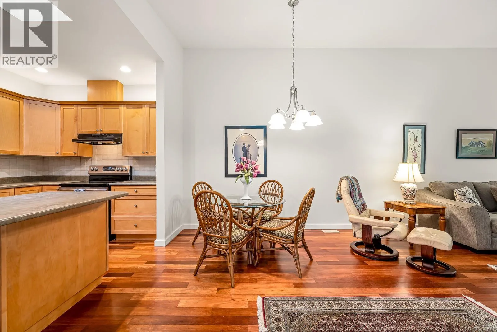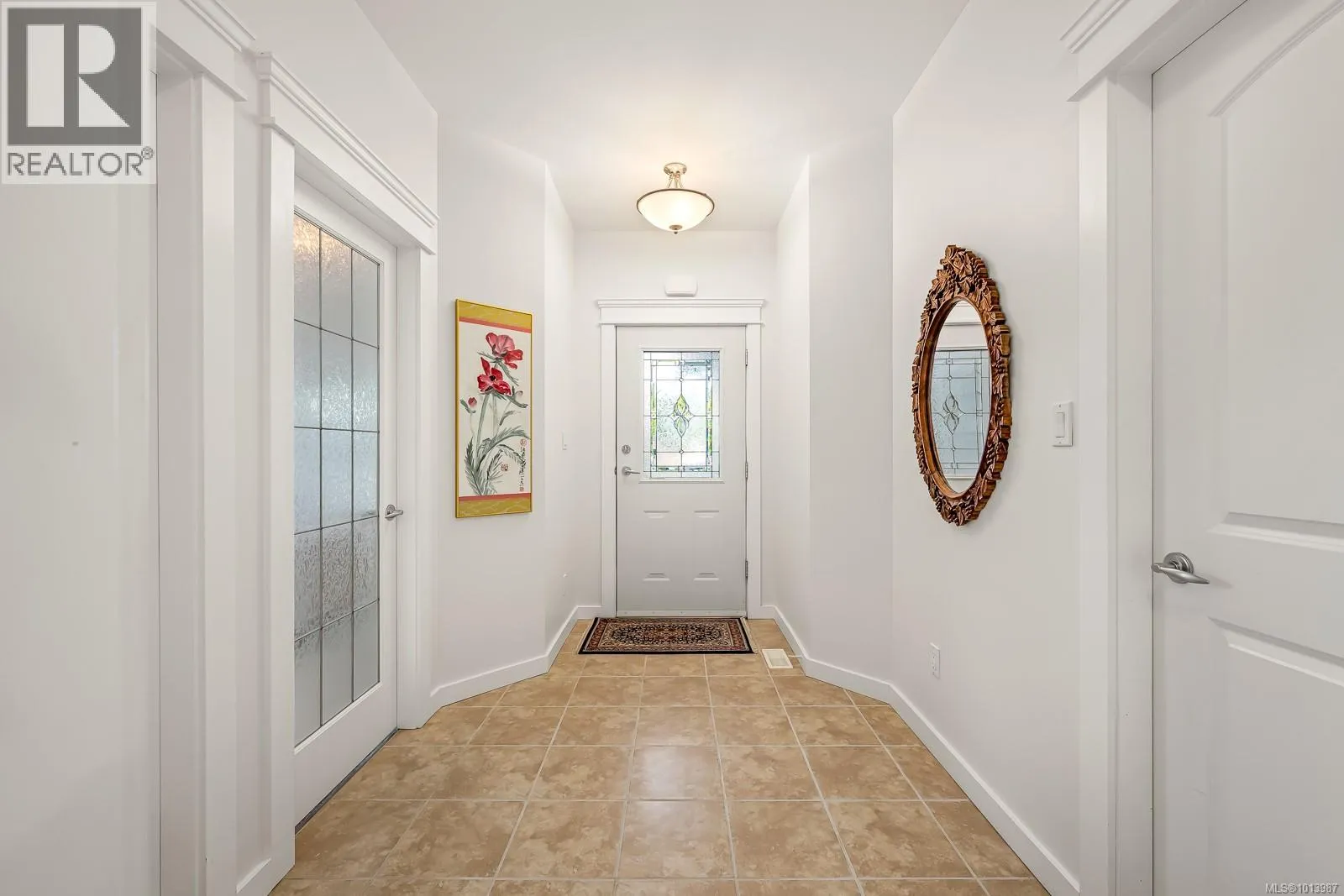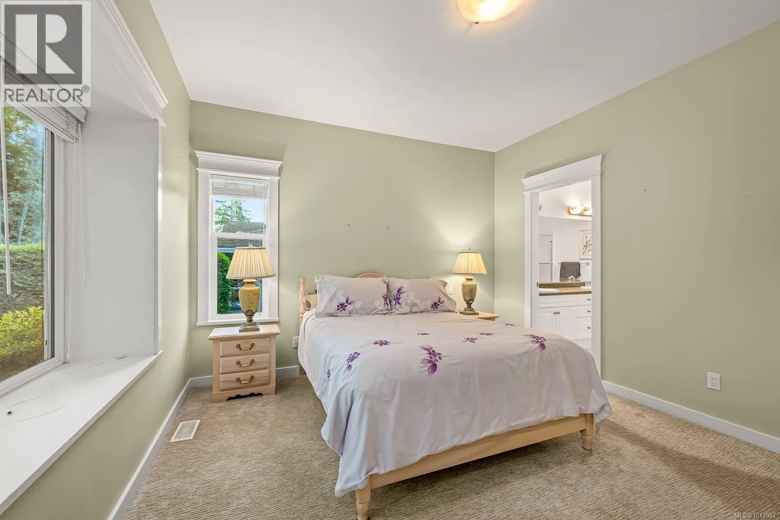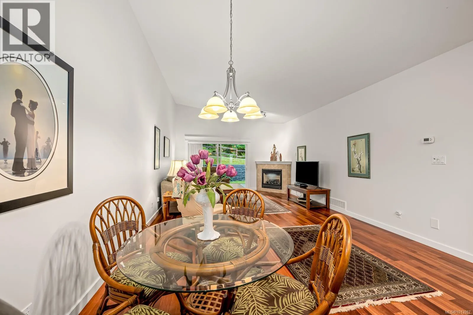 Welcome to Woodlands, a sought-after patio home community offering peace, privacy, and effortless living. This spacious 3-bedroom, 2-bathroom home backs directly onto Lerwick Park, with wooded trails just steps from your patio .Inside, youâll find 9-foot ceilings, engineered hardwood floors, and a bright open layout anchored by a cozy gas fireplace. The kitchen and living areas flow seamlessly for everyday comfort and entertaining. The primary suite is a true retreat, featuring a 5-piece ensuite with dual vanity, soaker tub, and walk-in shower. Enjoy year-round comfort with a heat pump and air conditioning. Outside, the Hardie Plank exterior, single garage, and two additional driveway parking spots add convenience with no exterior maintenance to worry about.This pet-friendly community is ideally located on the Comox border, close to shopping, services, and all amenitiesâyet tucked away in a quiet, park-like setting. A perfect blend of nature, comfort, and convenience. (id:27476)
