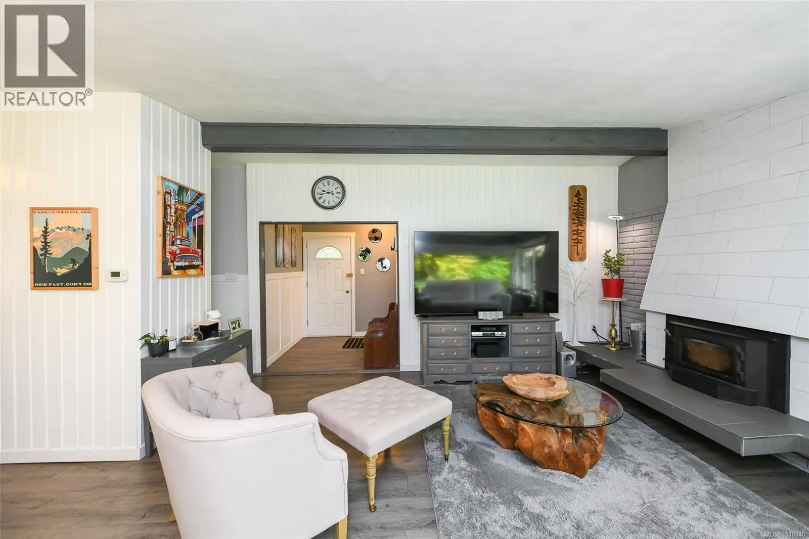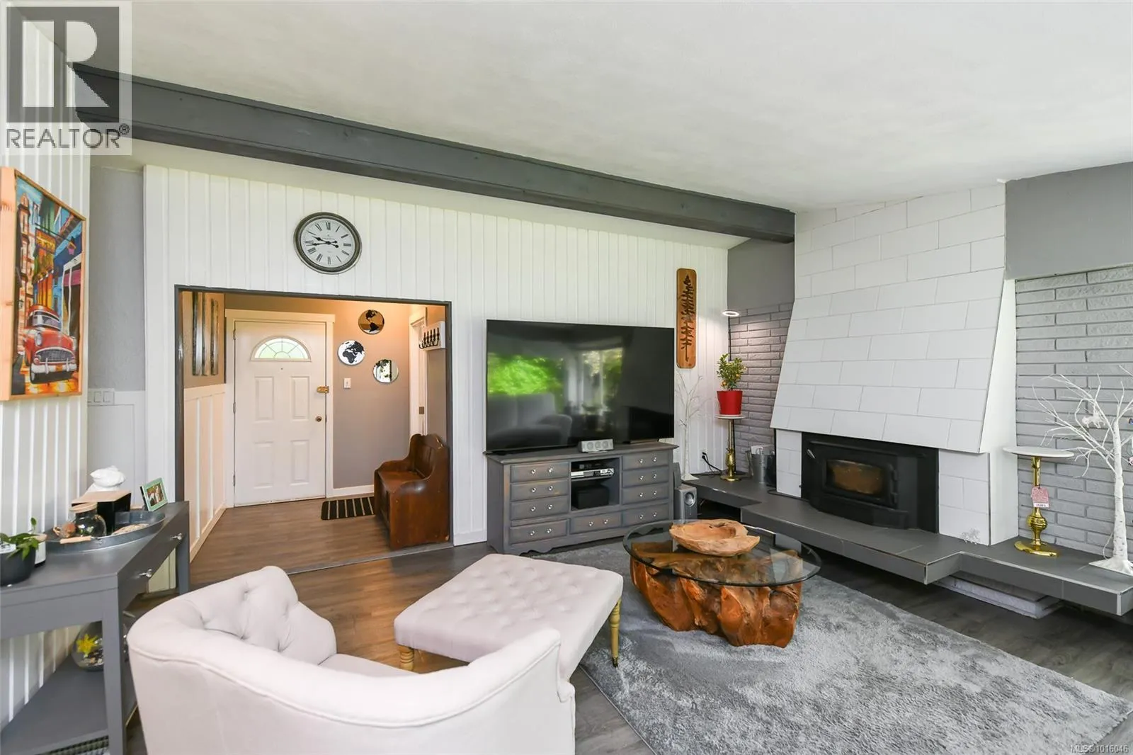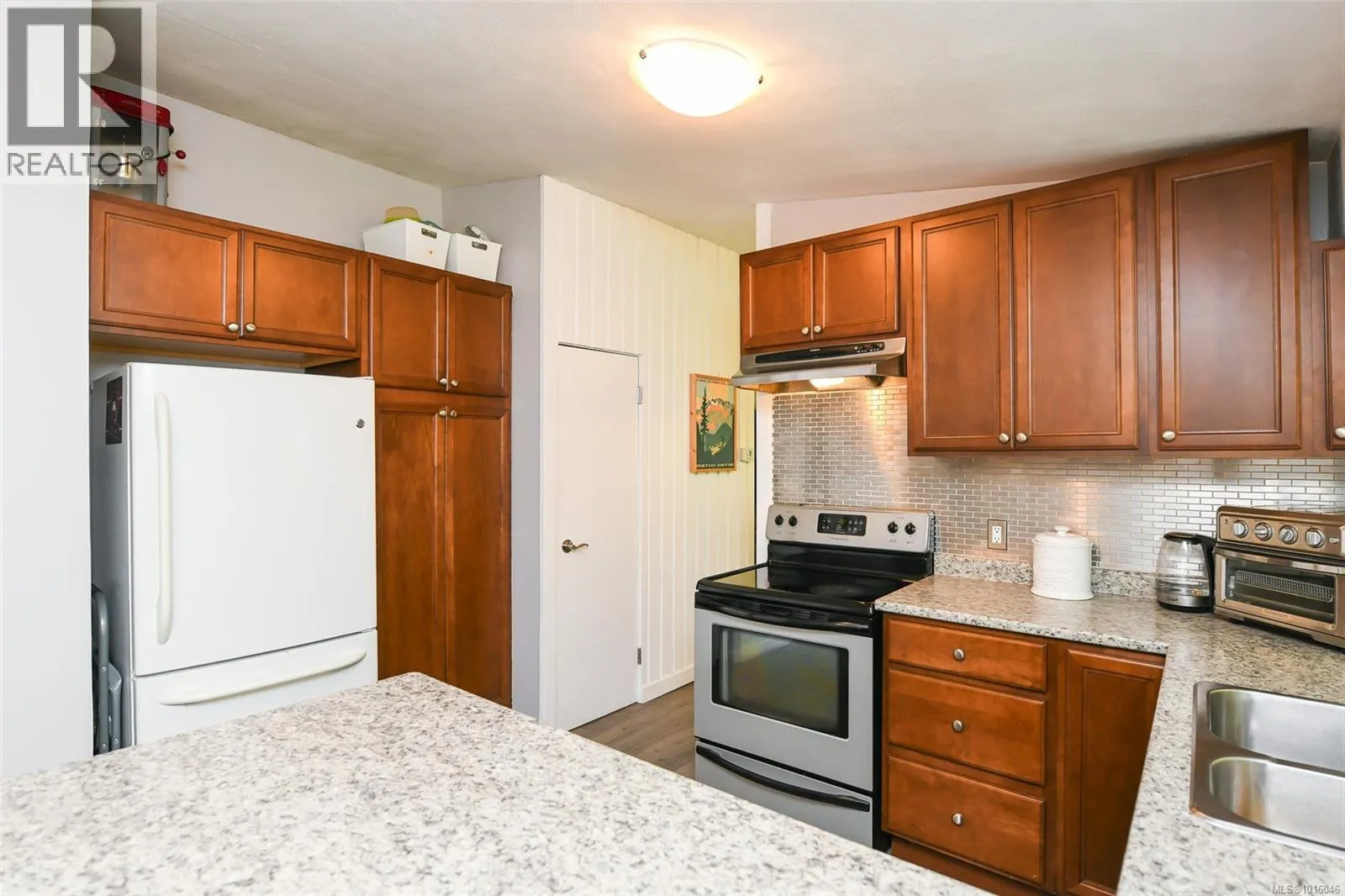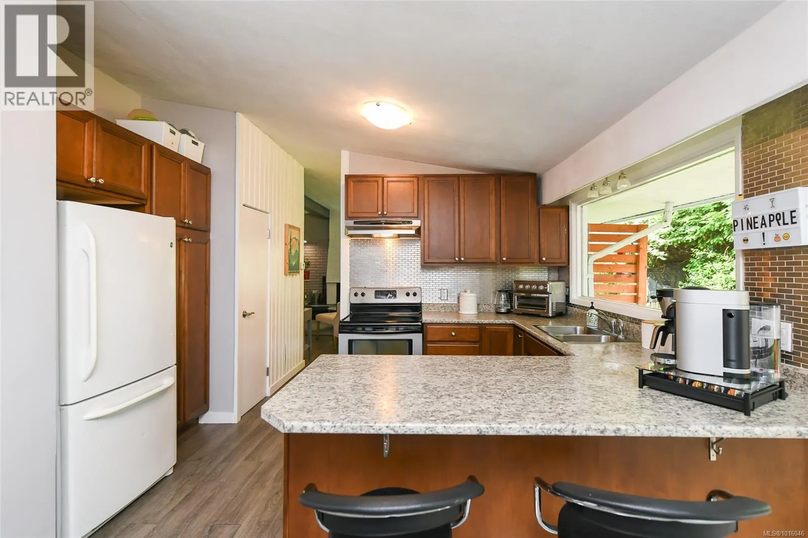 Mid-Century Modern Rancher on Oversized Lot in Courtenay Just minutes north of downtown Courtenay, this charming mid-century modern rancher sits on a spacious 0.34-acre lot with dual frontage on Island Hwy and Oakridge Drive. There's plenty of room to park your RV, boat, or other toys. Inside, you'll love the vaulted ceilings and vinyl floors that add warmth and character to the living room, complete with a woodstove insert for cozy, efficient heating in the winter. The updated kitchen features tile backsplash, modern cabinetry, and a convenient peninsula for extra prep space. Offering 3 bedrooms, 1 full bathroom, and a generous utility/storage room. Step outside into a beautifully private yard dotted with Garry oaks â ideal for entertaining, gardening, or simply enjoying the outdoors. With new R-SSMUH zoning, explore the potential to add a secondary suite, carriage house, granny flat, or even investigate subdivision options (verify with the City of Courtenay) (id:27476)