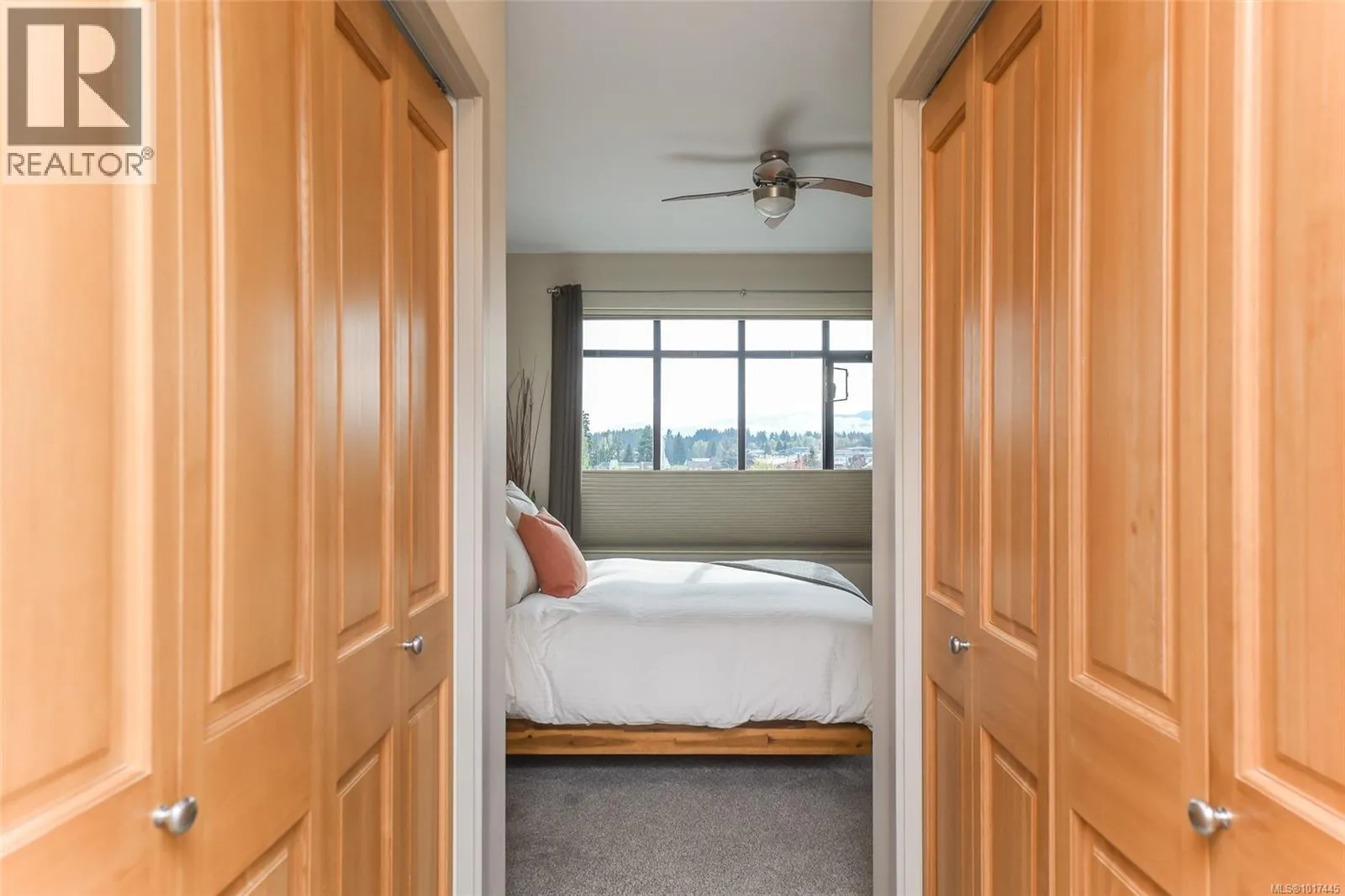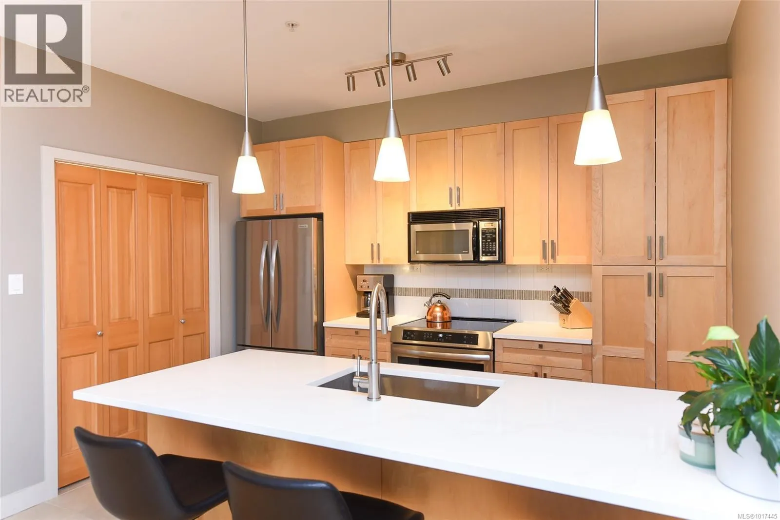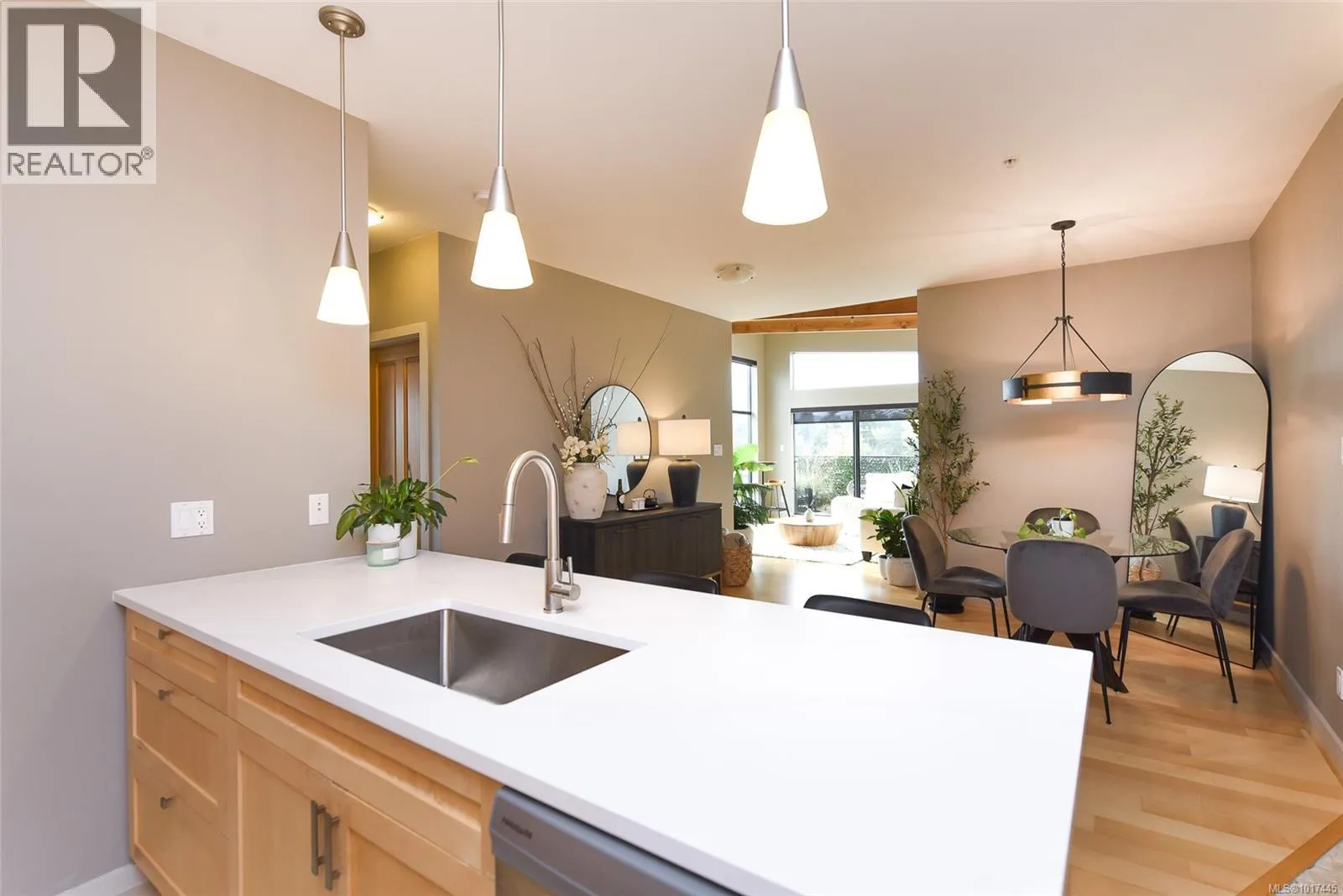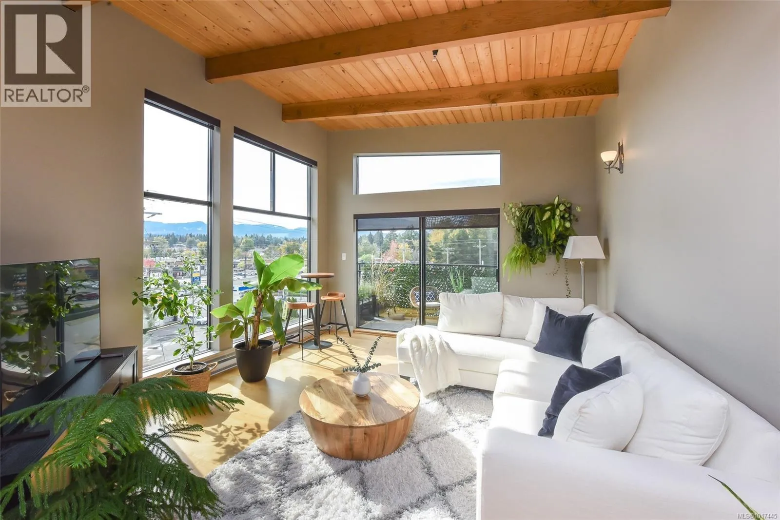 Experience luxury coastal living in this stunning top-floor residence in Building 1 of Trumpeterâs Landing. This bright and airy condo features 9-foot vaulted ceilings in the living room, and expansive windows that frame breathtaking mountain and ocean views. Thoughtfully updated with quartz countertops, new stainless steel appliances, and a sleek, modern aesthetic, this home offers a seamless blend of comfort and style. The open-concept layout is ideal for entertaining, while the balcony is the perfect place to relax and enjoy the west coast views. Located just steps from the Courtenay Riverway/Airpark, the marina, downtown shops, and cafes, this condo combines convenience with tranquility in a vibrant, walkable community. Part of a well-run and maintained strata, the building is pet-friendly â allowing up to one dog and one cat, or two cats. This is a rare opportunity to own a move-in ready, luxury condo in one of the Comox Valleyâs most desirable locations. (id:27476)