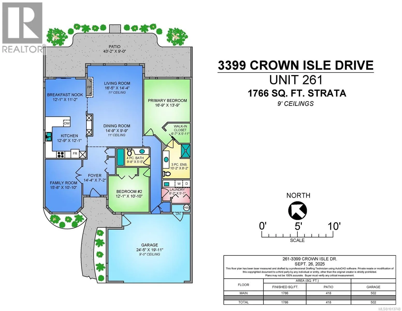 Welcome to Britannia Place, an elegant gated community in the Crown Isle neighbourhood. This spacious 2-bedroom plus den 1766 sq/ft patio home offers refined comfort and an effortless lifestyle. The open-concept design showcases 11â ceilings in the great room, a cozy gas fireplace, and abundant windows that bathe the home in natural light from its desirable northeast exposure. The kitchen features quality appliances, a breakfast nook, and direct access to the landscaped patioâperfect for morning coffee or evening relaxation. The large primary suite includes a walk-in closet and a 3-piece ensuite. The bright den/library with southern exposure provides an ideal space for work or quiet reading and a additional bedroom for guests. A new 50 year composite rubber roof system and newer pump ensures year-round comfort. With a double garage, golf cart area, along with proximity to Crown Isle Shopping Centre, the hospital, Costco, this is the ideal combination of comfort and location. Listed by The Courtney & Anglin Real Estate Group - The Name Friends Recommend! (id:27476)