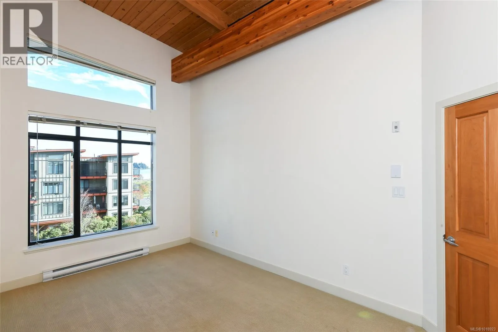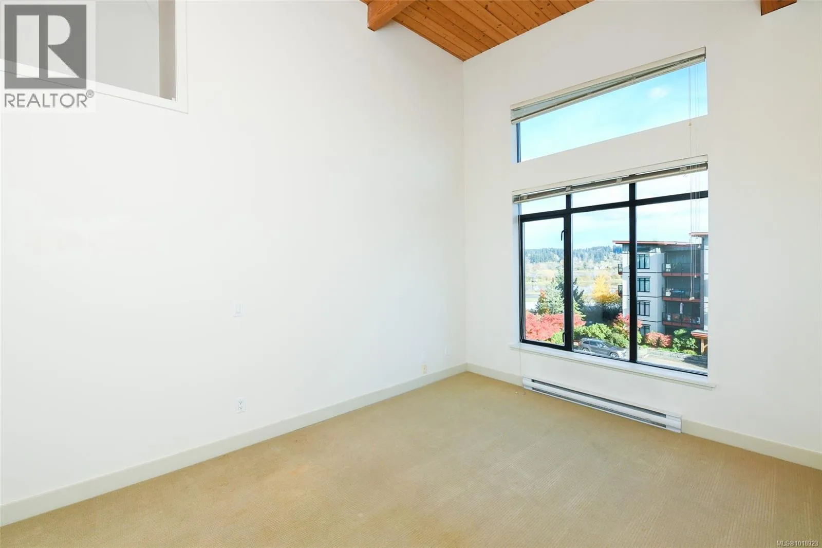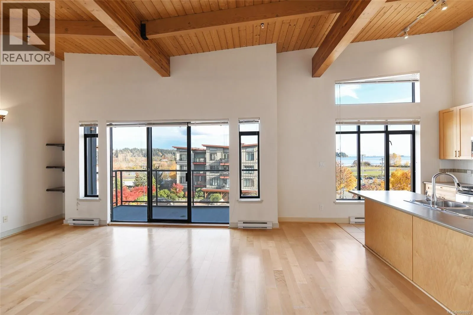 This top floor 2 bedroom, 2 bath condo at Trumpeterâs Landing boasts an ideal front and center location with stunning ocean and mountain views from the main living areas and bedrooms. Featuring beautiful over height wood beam ceilings and abundant windows, the home is filled with natural light throughout. The kitchen offers stainless steel appliances and an eat up bar for two, while the spacious primary bedroom includes a full ensuite and ample closet space. Additional highlights include a separate laundry/storage room and a large balcony perfect for enjoying the scenery. Just steps from the ocean, air park, and walking paths and close to all amenities, this home offers a central, coastal lifestyle. The pet friendly building features secured entry, a modern welcoming foyer, elevator, guest suite, underground parking, and a storage locker. (id:27476)