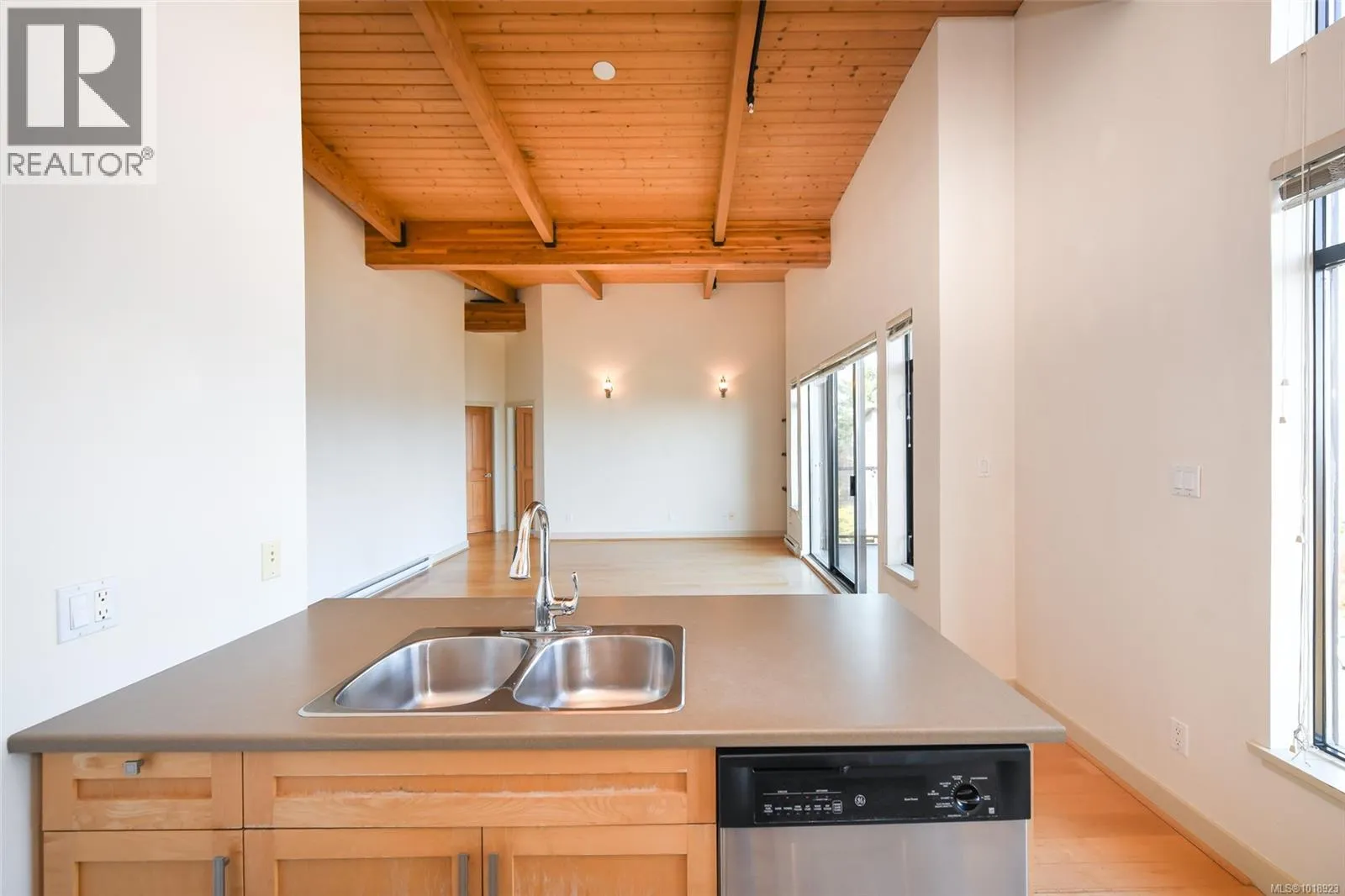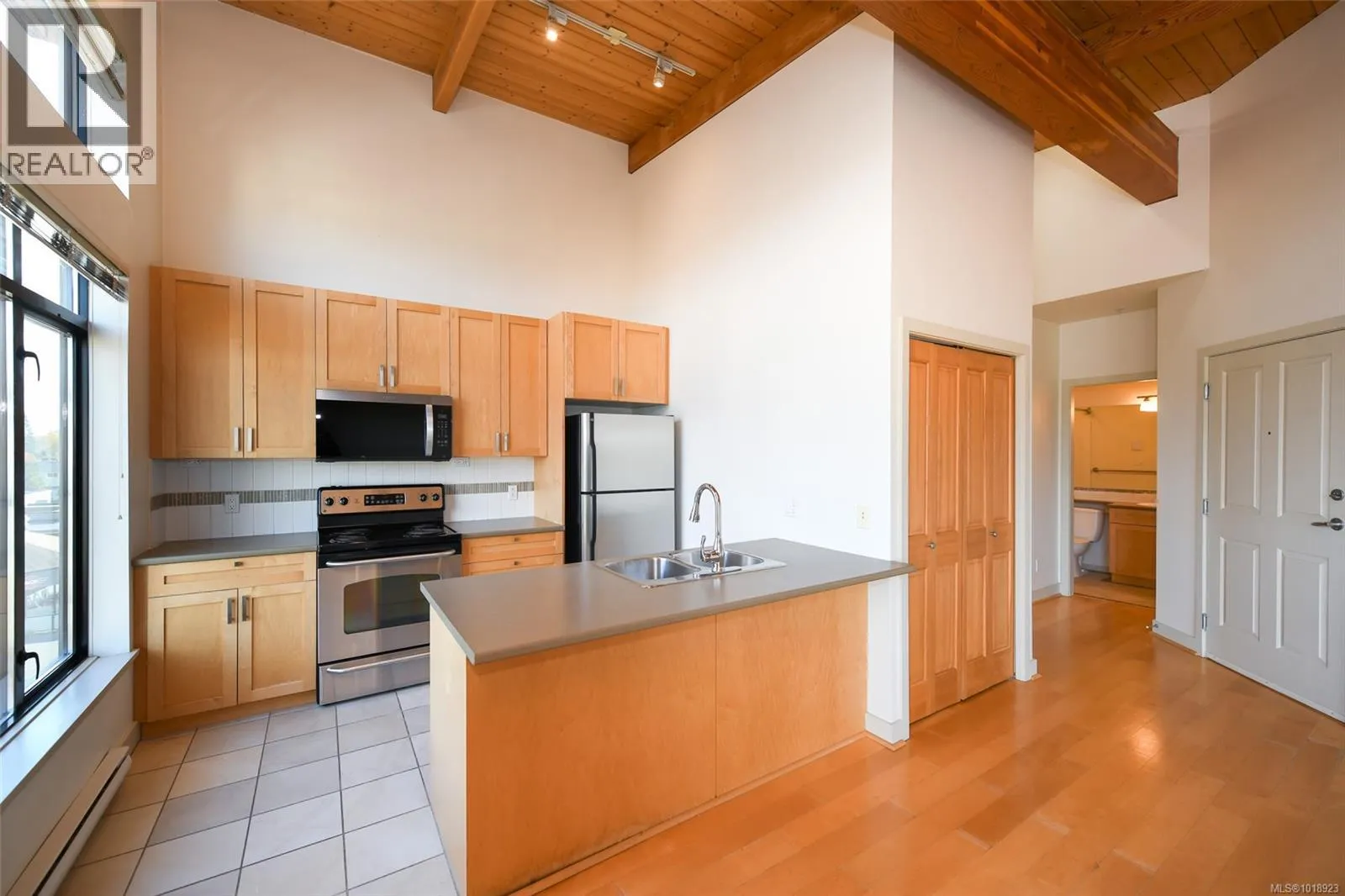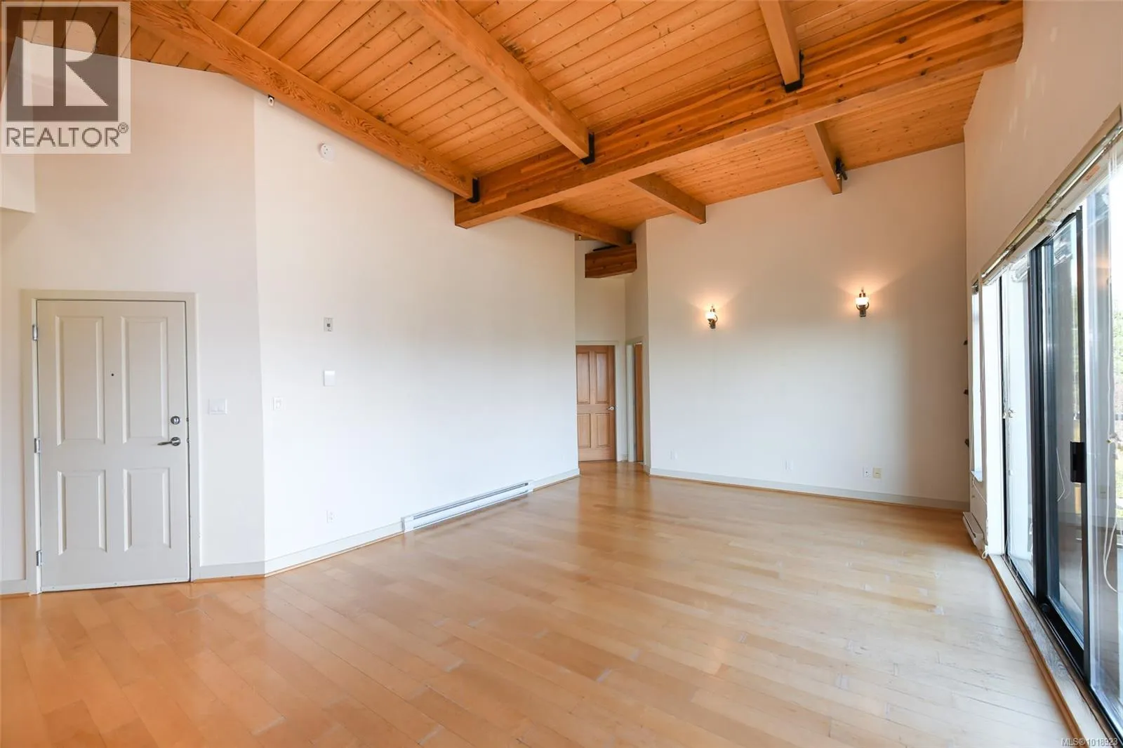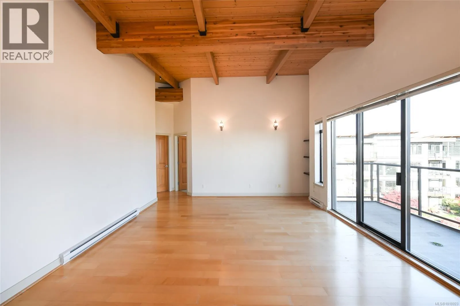 This top floor 2 bedroom, 2 bath condo at Trumpeterâs Landing boasts an ideal front and center location with stunning ocean and mountain views from the main living areas and bedrooms. Featuring beautiful over height wood beam ceilings and abundant windows, the home is filled with natural light throughout. The kitchen offers stainless steel appliances and an eat up bar for two, while the spacious primary bedroom includes a full ensuite and ample closet space. Additional highlights include a separate laundry/storage room and a large balcony perfect for enjoying the scenery. Just steps from the ocean, air park, and walking paths and close to all amenities, this home offers a central, coastal lifestyle. The pet friendly building features secured entry, a modern welcoming foyer, elevator, guest suite, underground parking, and a storage locker. (id:27476)