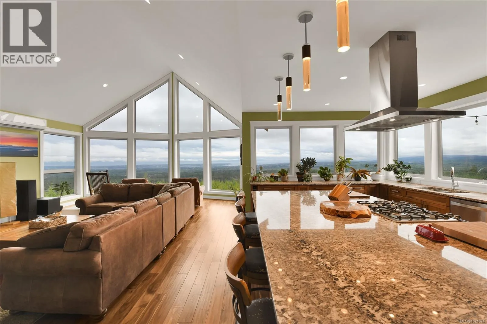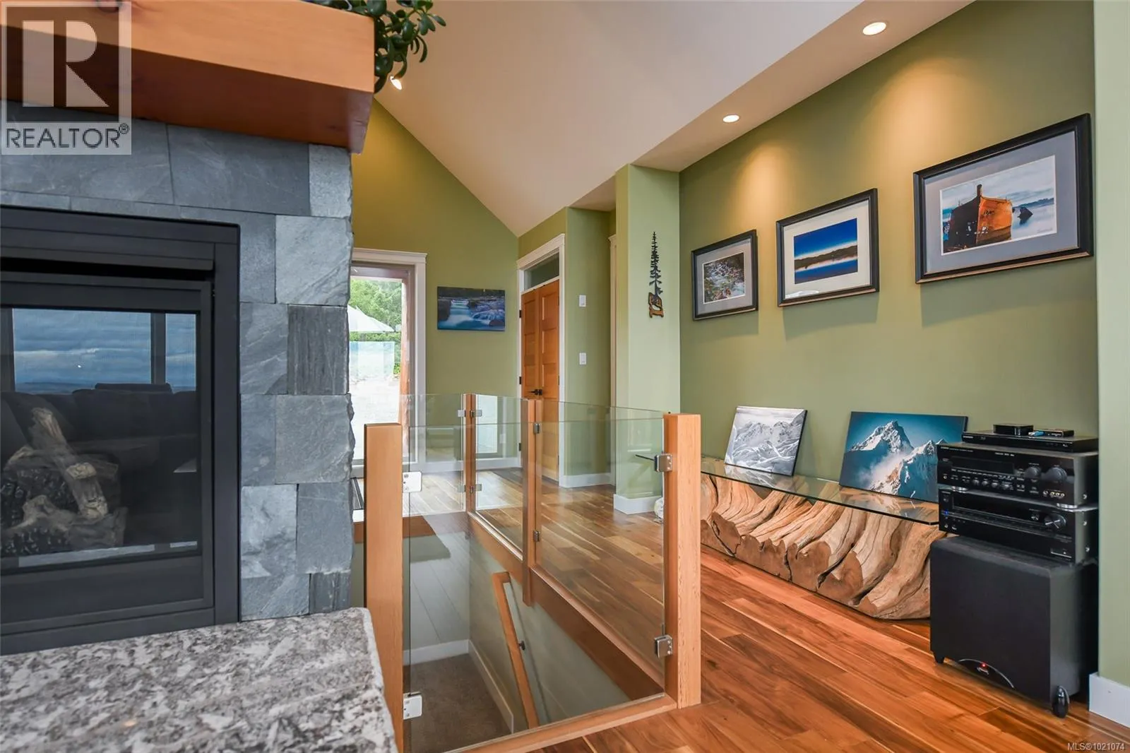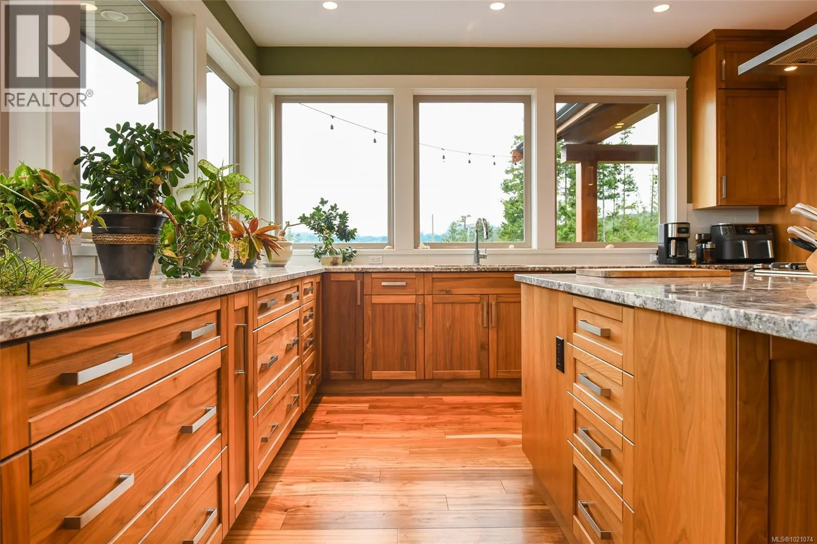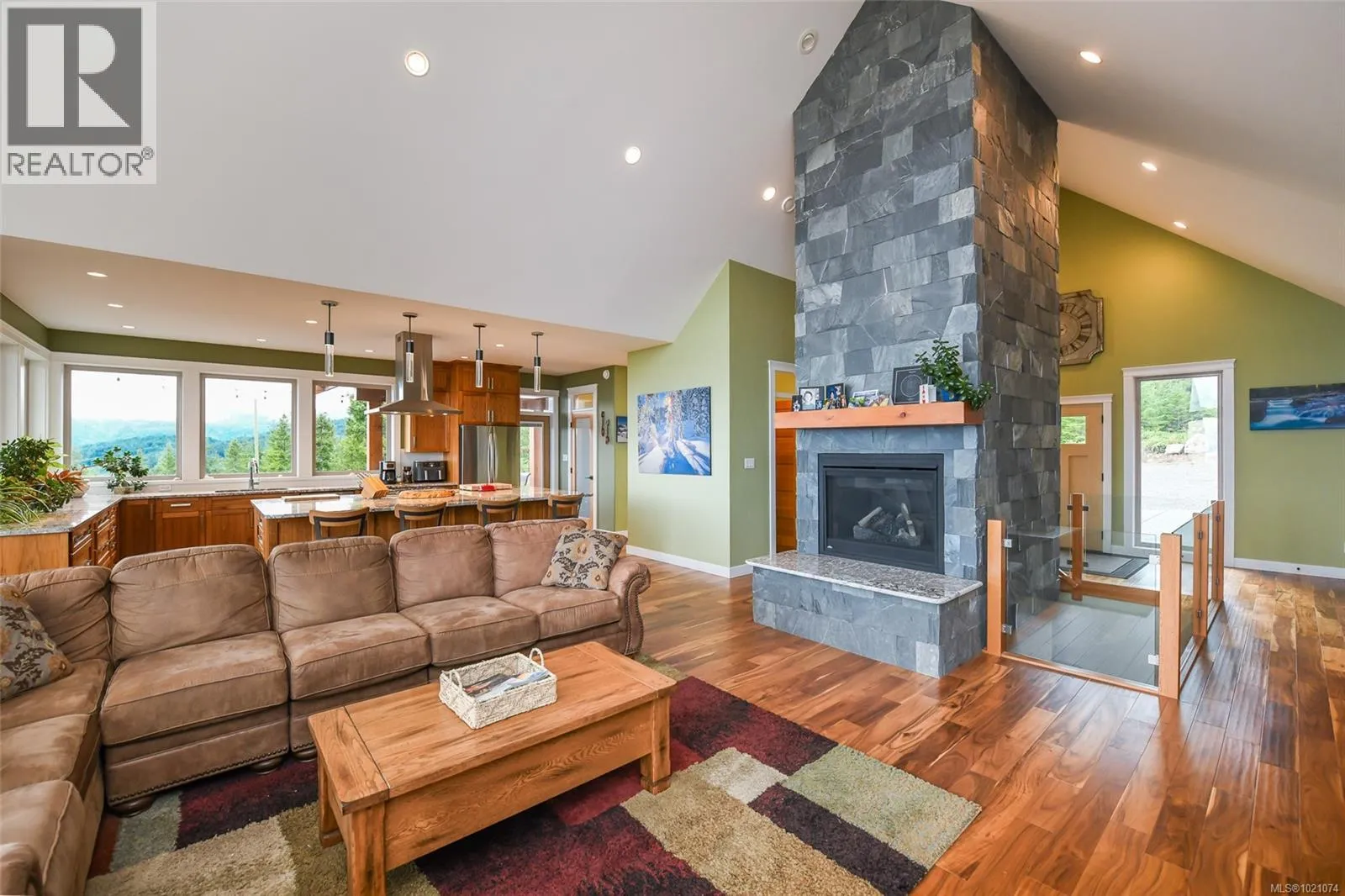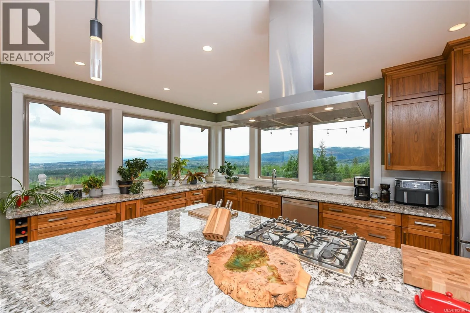 This custom-designed estate sits commandingly atop Mystic Cove on 40 pristine acres, offering an unparalleled living experience continually bathed in natural light. Secured by a private gate and encompassing extensive walking trails, the property ensures complete privacy and seamless immersion in nature. Every window frames a breathtaking panorama, capturing the serene expanse of Georgia Strait, the distant, captivating outlines of Denman and Hornby Islands, the curve of Comox Bay. The residence is a masterpiece of luxury and scale, designed for both comfortable living and grand-scale entertainment, boasting ample space to host crowds of any size. It features five spacious bedrooms, including primary suites designed with opulent touches like large, spa-like walk-in showers. The heart of the home is a large kitchen appointed with exquisite custom cabinetry. The main living space is warm and inviting, centered around a striking, huge stonre fireplace. Outdoor living revolves around a dazzling pool, while evenings culminate at a dramatic fire pit specifically positioned to overlook the twinkling lights of the entire Comox Valley. Utility and sustainability are paramount, supported solar power, silent in-ground radiant heat, and supplemental heat pumps for efficient, year-round climate control. Finally, a versatile four-car garageâcleverly split with two bays on the main level and two additional bays belowârealizes the car collector's dream. This is more than a home; it is a meticulously engineered, self-sustaining, and visually stunning elevated retreat where luxury, nature, and engineering converge. (id:27476)