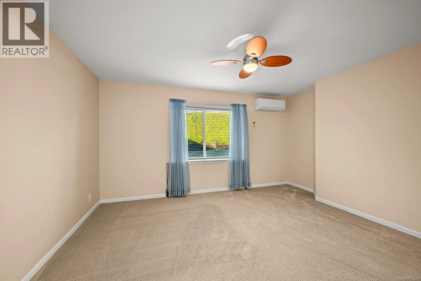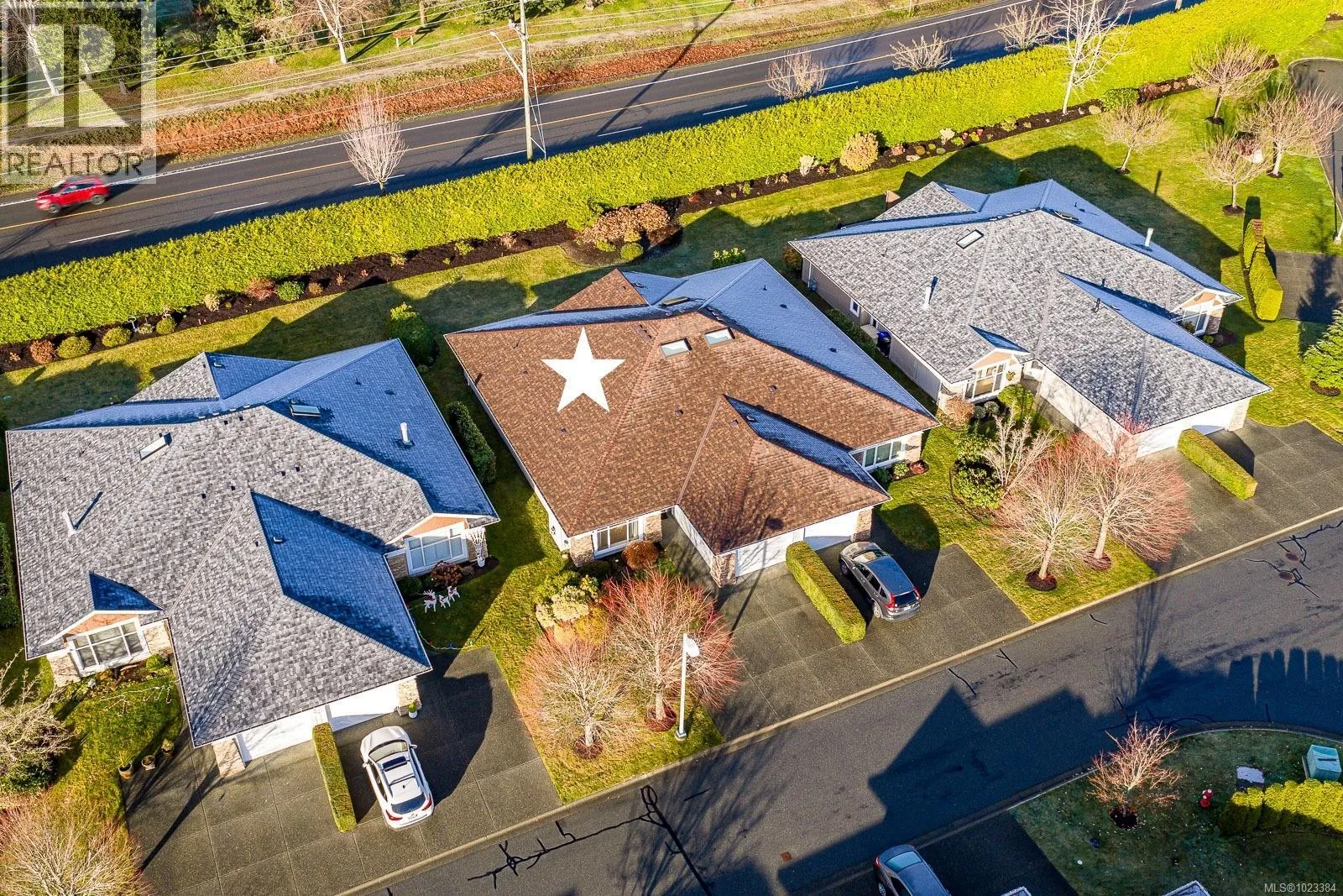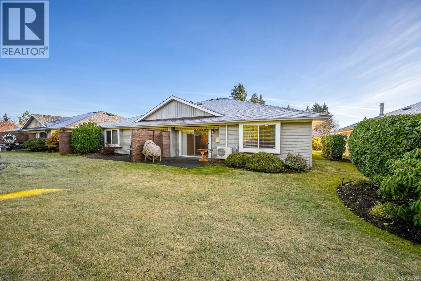 Immaculate patio home located on a quiet cul-de-sac in the desirable Heather Glen gated community. Radiant in-floor heating throughout, plus 2 split pumps for heating and A/C in this 1,370 sq ft, 2 bedrooms plus a den & 2 baths. Spacious entry with beveled, leaded glass door to the front room/den with cozy gas fireplace. Bright open plan includes well designed kitchen w/ water filtration, island w/ seating, skylight overhead, and vaulted ceiling throughout the dining and living rooms. Another cozy gas fireplace and sliding door access to the west facing covered patio with electric awning & gas BBQ hook up. Large master suite offers 4 pce ensuite with double sinks and spacious shower. Guest bedroom, 4 pce main bath, laundry room w/ stacking washer/dryer, sink & large storage room. Well managed complex, beautiful landscaping, private back yard, gated entry, 1 car garage, double width driveway, visitor parking. Close to all amenities, shopping, Costco, Aquatic Centre & Hospital. (id:27476)