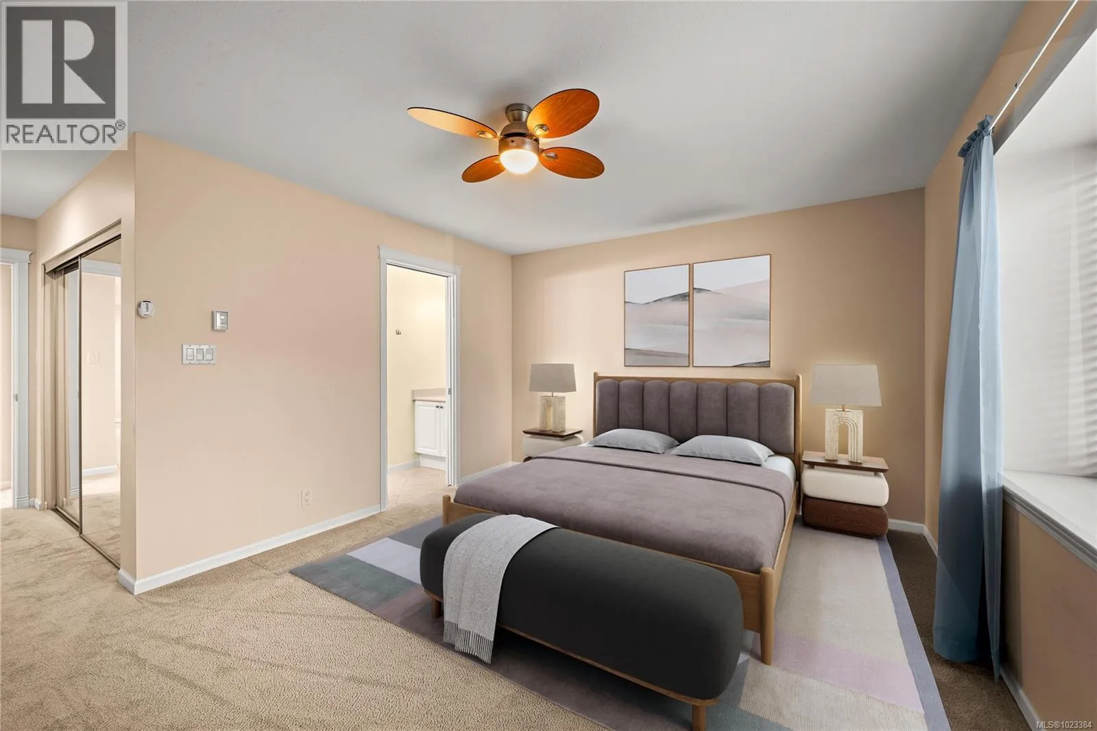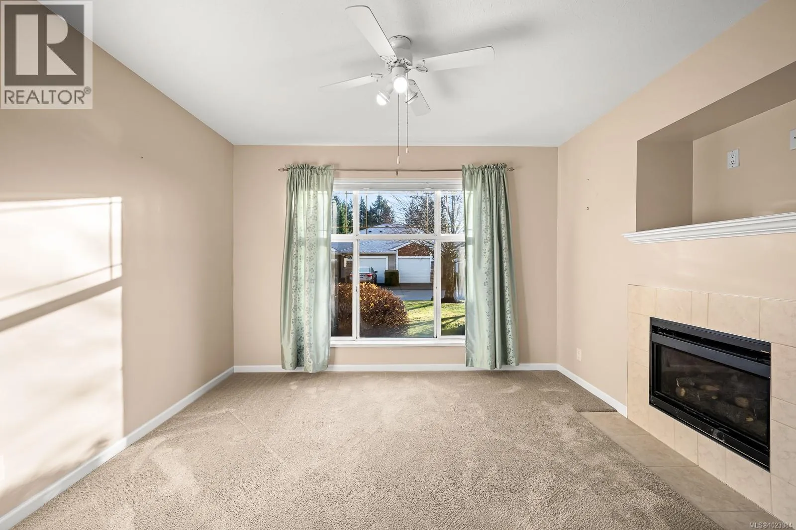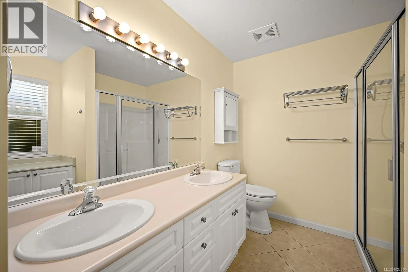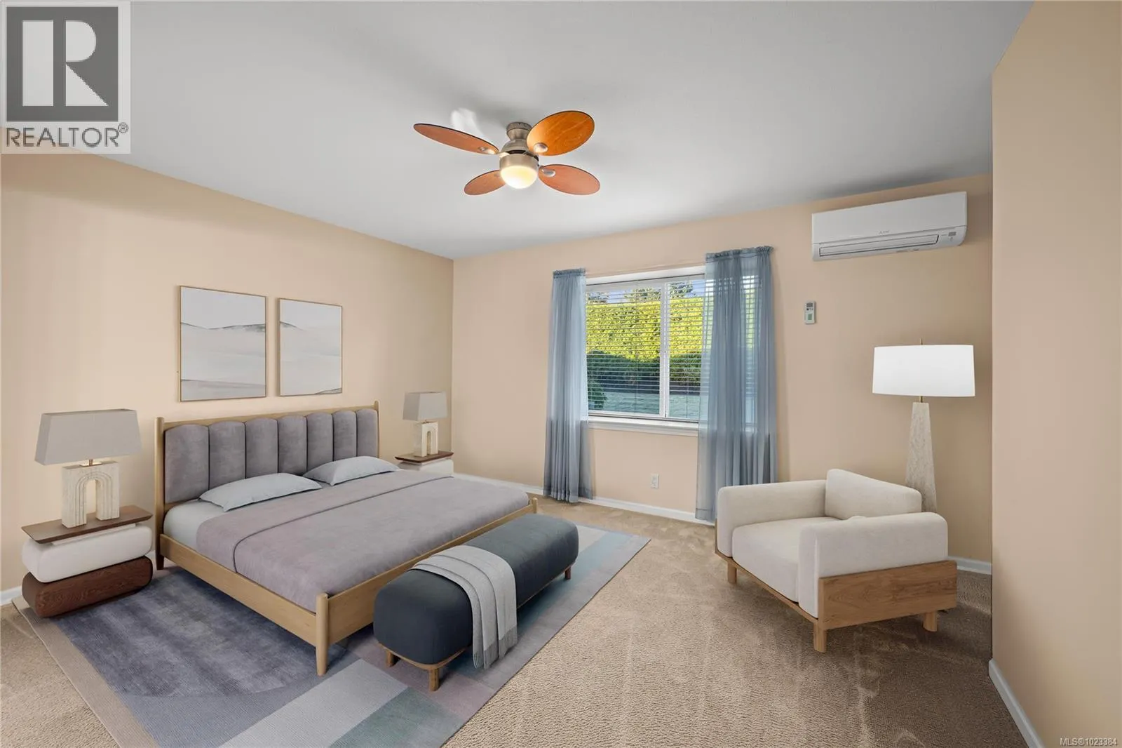Immaculate patio home located on a quiet cul-de-sac in the desirable Heather Glen gated community. Radiant in-floor heating throughout, plus 2 split pumps for heating and A/C in this 1,370 sq ft, 2 bedrooms plus a den & 2 baths. Spacious entry with beveled, leaded glass door to the front room/den with cozy gas fireplace. Bright open plan includes well designed kitchen w/ water filtration, island w/ seating, skylight overhead, and vaulted ceiling throughout the dining and living rooms. Another cozy gas fireplace and sliding door access to the west facing covered patio with electric awning & gas BBQ hook up. Large master suite offers 4 pce ensuite with double sinks and spacious shower. Guest bedroom, 4 pce main bath, laundry room w/ stacking washer/dryer, sink & large storage room. Well managed complex, beautiful landscaping, private back yard, gated entry, 1 car garage, double width driveway, visitor parking. Close to all amenities, shopping, Costco, Aquatic Centre & Hospital. (id:27476)