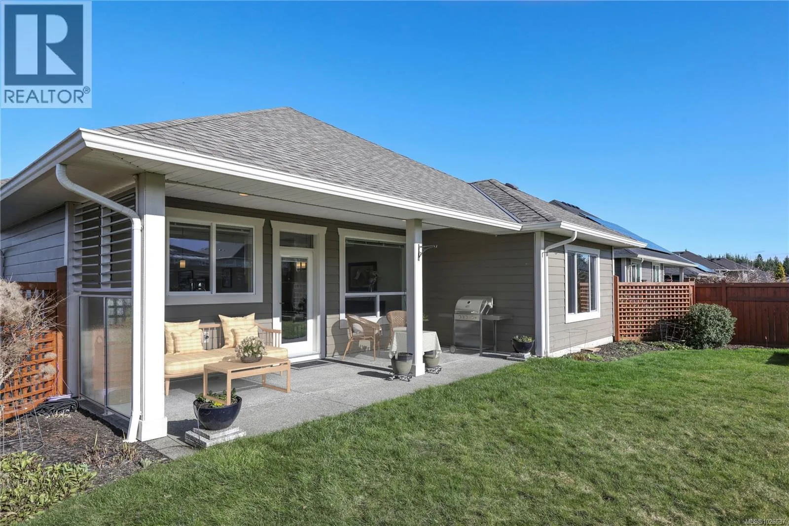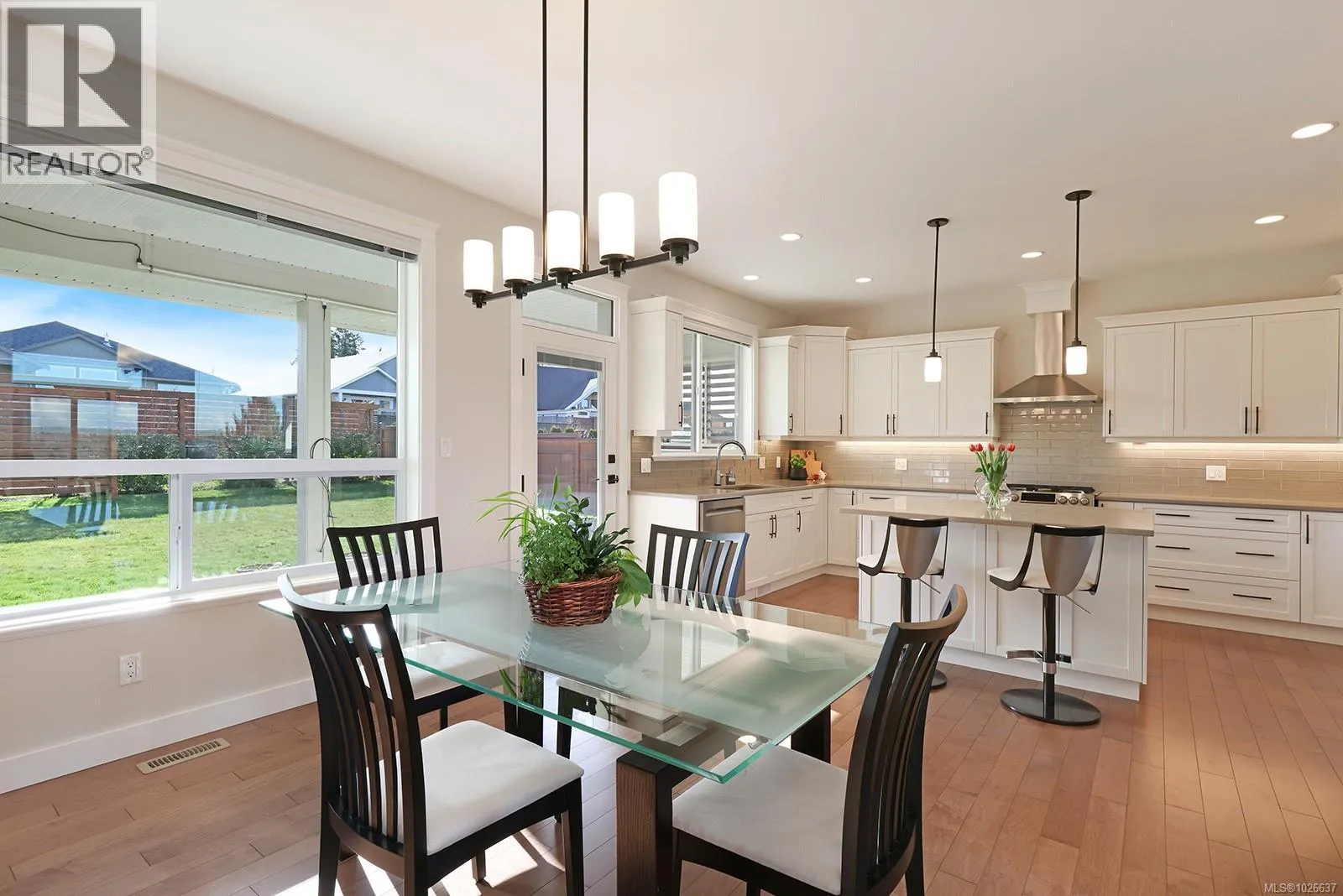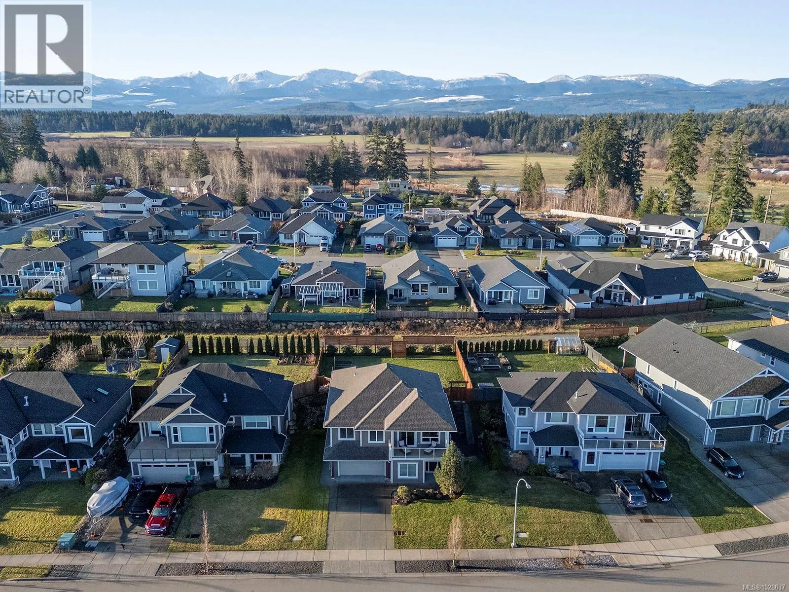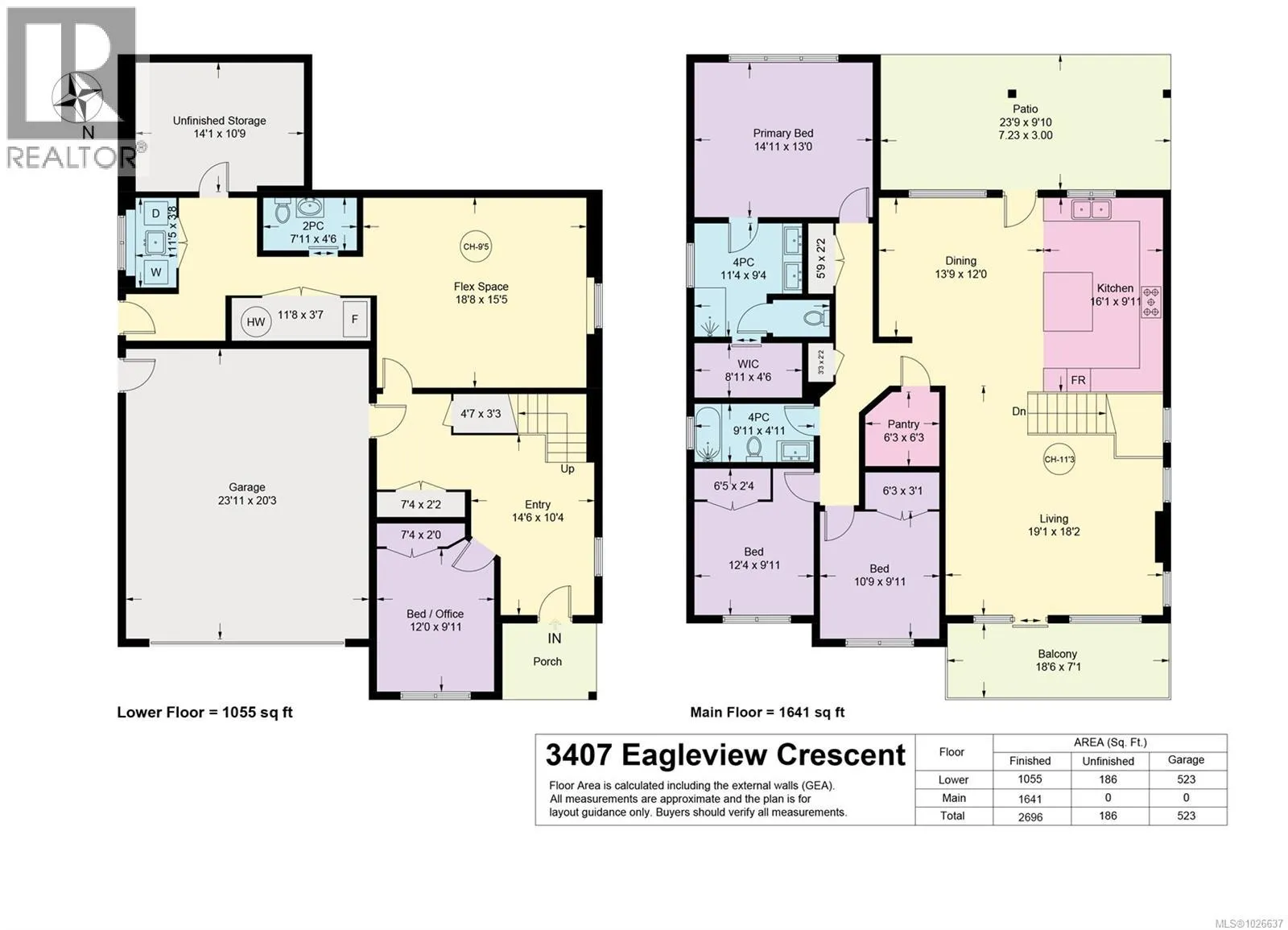 Welcome to 3407 Eagleview Crescent, ideally located in the sought-after Ridge neighbourhoodâsteps to walking trails, minutes to shopping, and surrounded by coastal mountain views. This meticulous custom-built home blends refined living with everyday functionality, offering 4 bedrooms and 3 bathrooms in a thoughtfully designed layout. The bright, open-concept main level is the heart of the home, ft 11-foot ceilings and expansive windows that flood the space with natural light. A cozy gas fireplace anchors the living room, while sliding glass doors open to a covered deck for seamless indoor-outdoor living. The kitchen is designed for entertaining and daily life, showcasing quartz countertops, a contemporary tile backsplash, SS appliances, generous cabinetry, a walk-in pantry, and large island for gathering. The adjoining dining area opens to a private southwest-facing backyard with natural gas hookups for a BBQ and firepit, plus a covered patio for year-round enjoyment. Low-maintenance landscaping includes full irrigation front and back. The primary suite overlooks the backyard and offers a walk-in closet and luxurious ensuite with heated floors, dual vanities, water closet, and a spacious walk-in shower. Two additional bedrooms complemented by a 4-piece bathroom round out the upper level. Downstairs, a versatile flex room provides space for family living, recreation, or guests, along with a fourth bedroom/office and a dedicated laundry area with a separate side entrance for added convenience. Approximately 180 sq ft of partially finished space awaits your creativity, offering potential for a future home gym, wine cellar, workshop, studio, or extended living area. Additional highlights include an oversized double garage, engineered hardwood on the main level, luxury vinyl below, and a high-efficiency heat pump. This well-appointed home delivers versatile living spaces, elevated finishes, and an exceptional setting in one of the areaâs most desirable neighbourhoods. (id:27476)