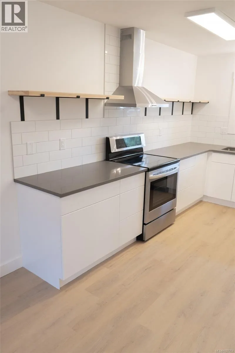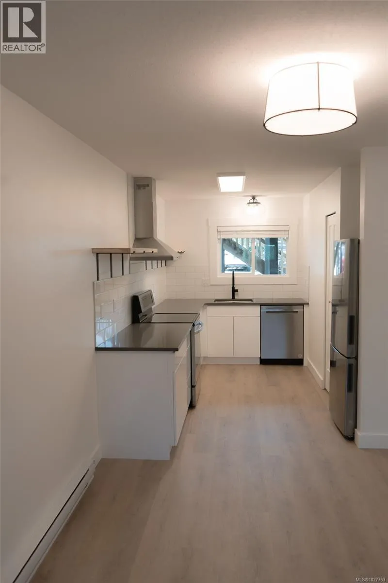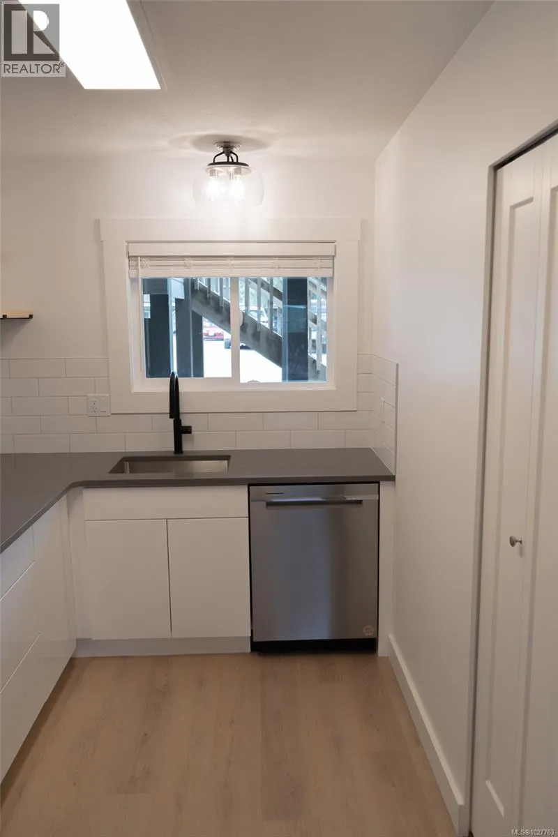 Ground level condo, beautifully renovated in 2024! Blending style, location and value, a fantastic opportunity for investors, first time Buyers, and perfect for downsizing. Ideally located just a short walk to downtown shops, restaurants, pubs, and public transit. A bright, open, and accessible living space of 882 sf, this 2 BD/ 1 BA condo features a spacious storage room with in-suite laundry. A stunning kitchen showcases new cabinetry, quartz countertops, a classic subway tile backsplash, open shelving, s/s appliances (fridge, stove, dishwasher â 2022), and free-standing s/s hood fan. A window over the sink fills the space w/ natural light. Extensive updates including - washer, dryer (2021), H/W tank (2024), new baseboard heating, updated electrical & plumbing (Poly B removed). New lighting, doors, trim, new glued-down vinyl plank flooring. New bathroom vanity, toilet, painted throughout. A well-maintained complex replaced windows in 2023, 1 designated parking stall, 1 dog or 1 cat. (id:27476)