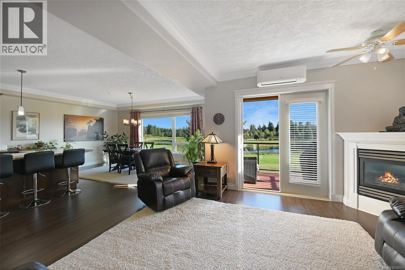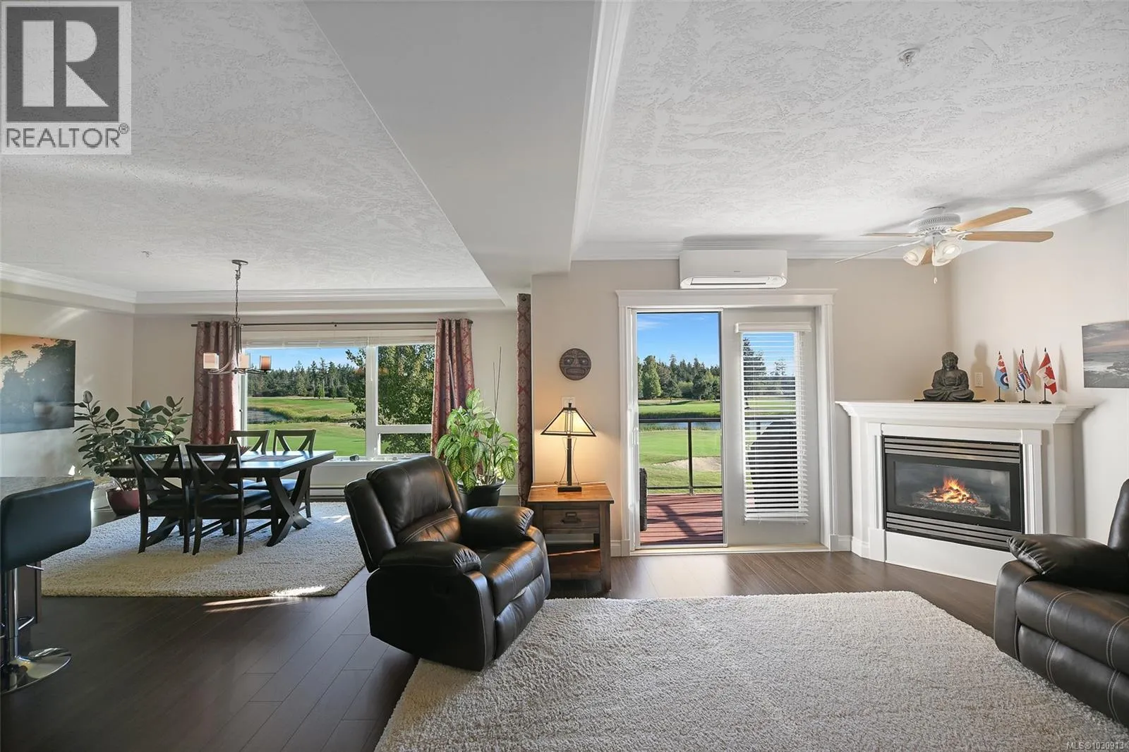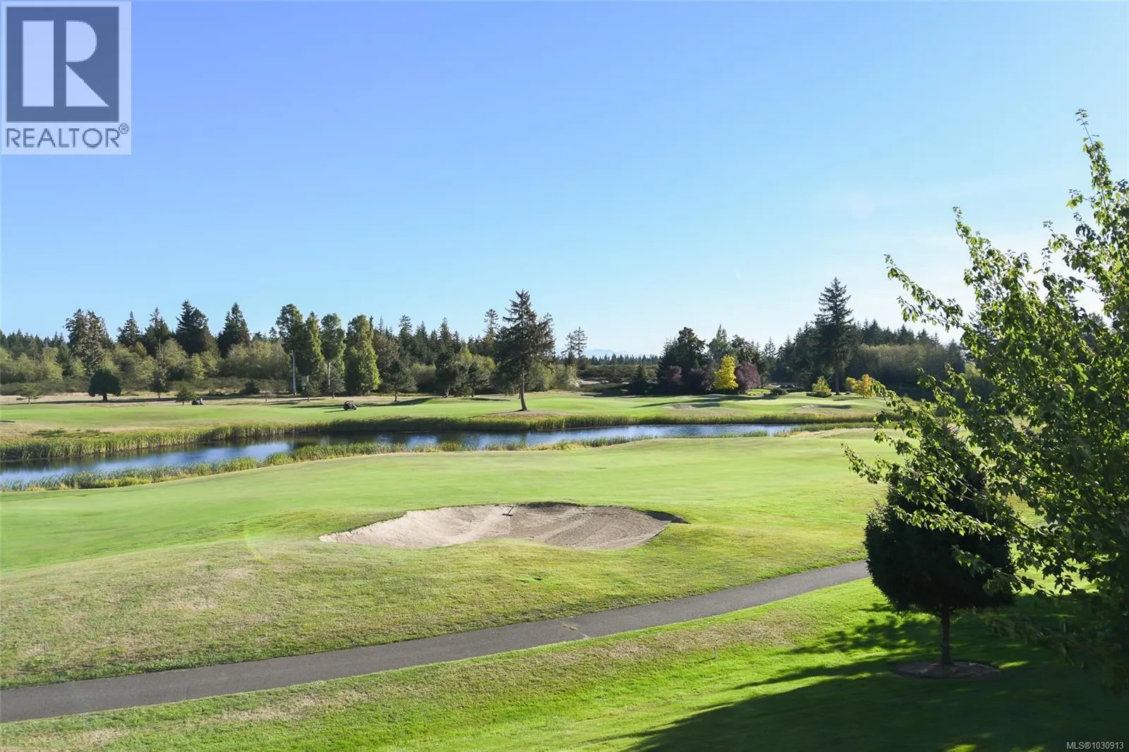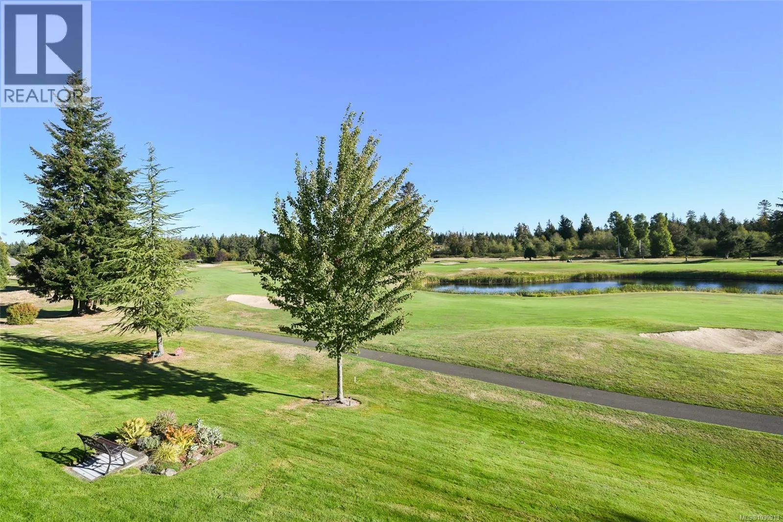 Sunrise views and coastal mountain vistas stretch across the 3rd, 4th and 5th fairways, creating a stunning backdrop for everyday living. Welcome to Corinthia Estates at Crown Isle Golf Resort, where luxury finishes and a relaxed, easy-care lifestyle come together beautifully. This 1753 sq ft corner unit offers 2 bedrooms plus a den and 2 bathrooms, with expansive windows that fill the home with natural light. The thoughtful layout begins with a welcoming entry and a separate den or office, enhanced by glass block detailing that allows light to flow through the spaceâideal for working from home or quiet reading. The wider hallway opens into a bright and inviting great room, where an ambient gas fireplace creates warmth and comfort in the cooler months, while air conditioning ensures year-round comfort. The open-concept design is perfect for entertaining, anchored by a gourmet kitchen featuring stainless steel appliances, rich maple shaker cabinetry, granite countertops, and a large L-shaped island with seating. Step outside to the covered deck to enjoy morning coffee or evening cocktails, complete with a natural gas BBQ hookup and peaceful golf course views. The spacious primary bedroom offers a true retreat, with a large closet with the added convenience of stacking laundry, and a generous ensuite featuring heated slate tile flooring, a tiled shower, and a relaxing multi-jet system. A second bedroom and full bath provide flexibility for guests. Additional features include commercial-grade laminate flooring, crown moulding, and stepped ceilings that add character throughout. Underground parking, storage locker plus bonus golf cart parking! Welcoming to all ages, pets, and rentals (see bylaws for details), making it a great option for both homeowners and investors. Just minutes to shopping, dining, walking trails, and the airport, this home offers the perfect balance of comfort, style, and convenience in the Comox Valleyâs most desirable golf course community. (id:27476)