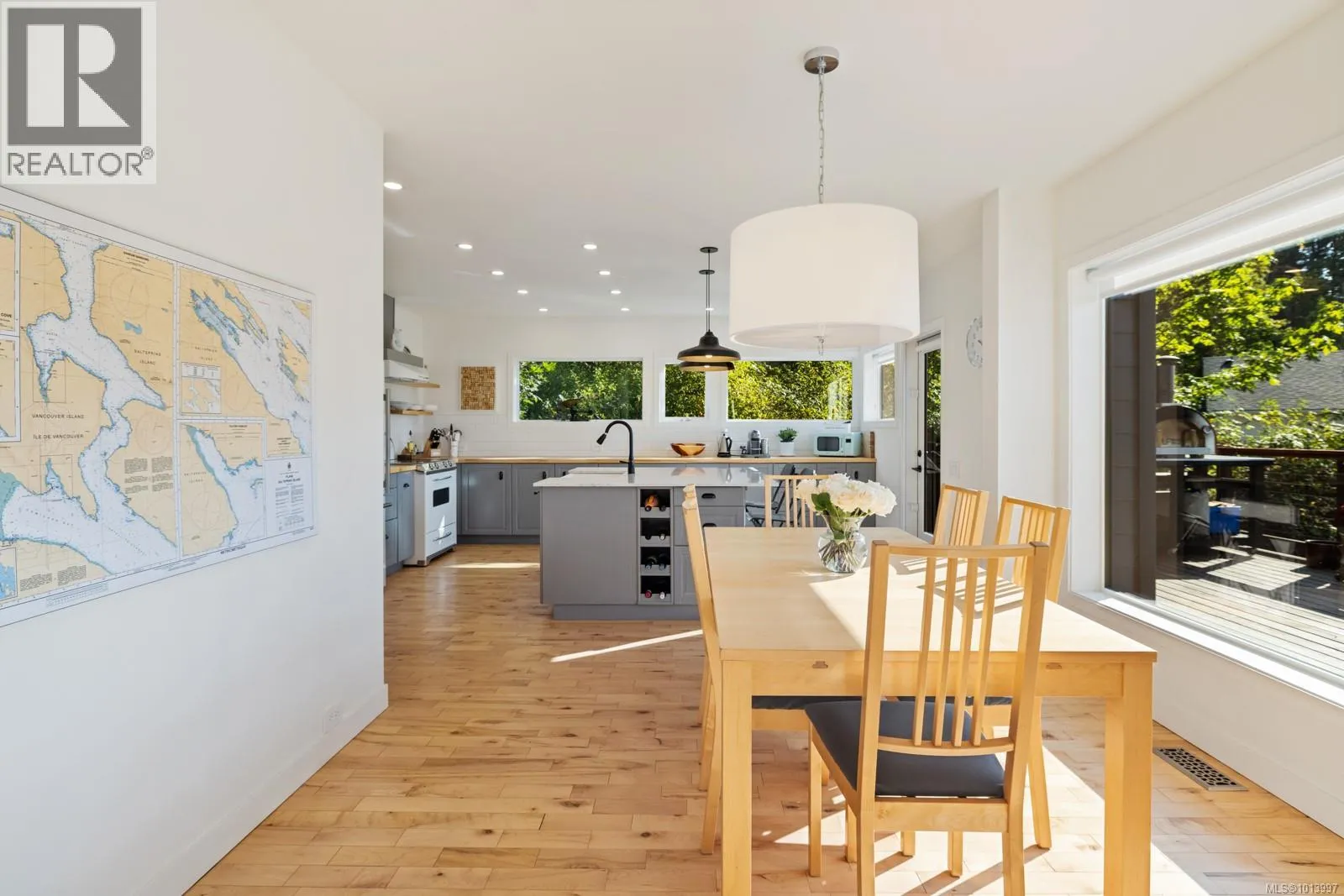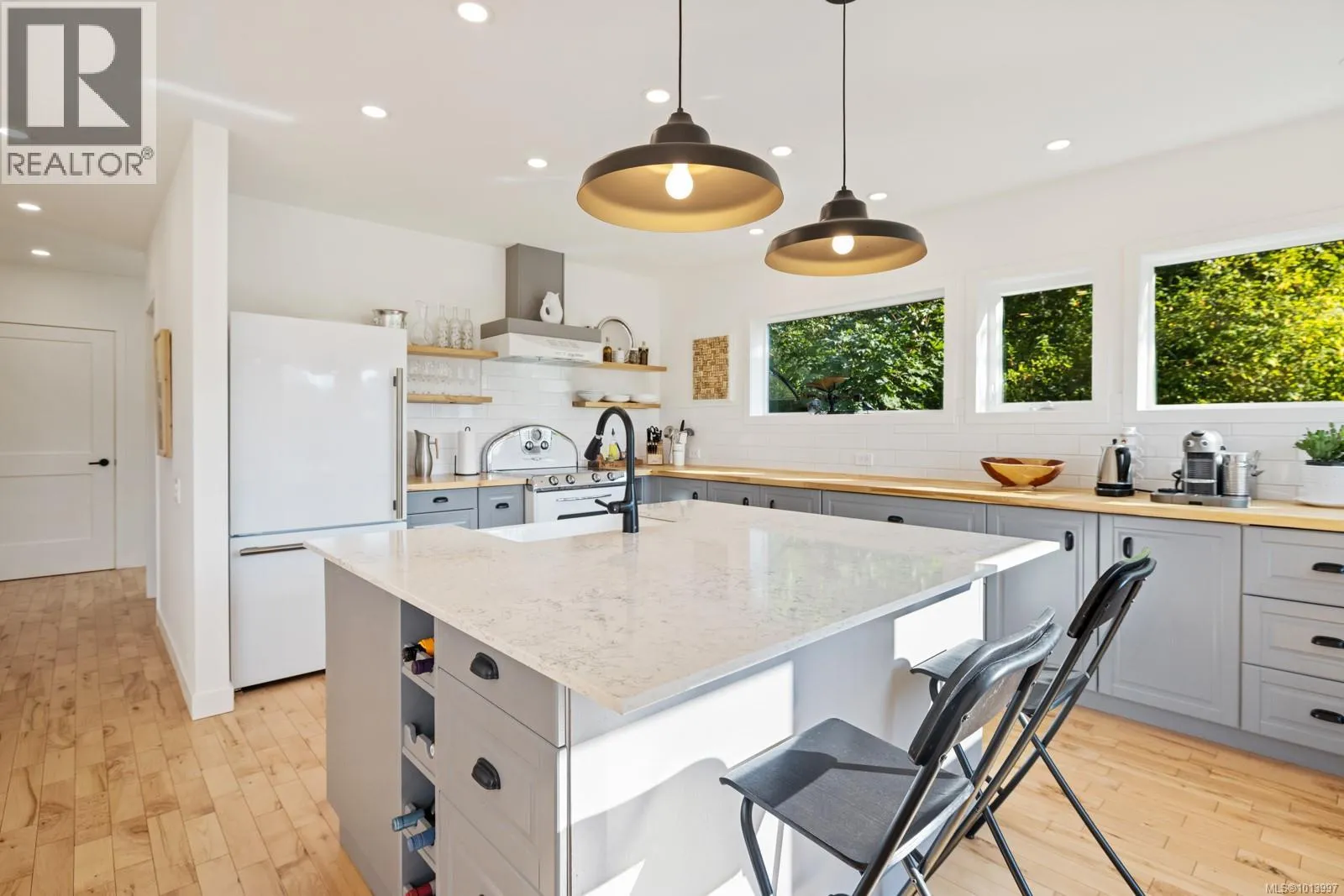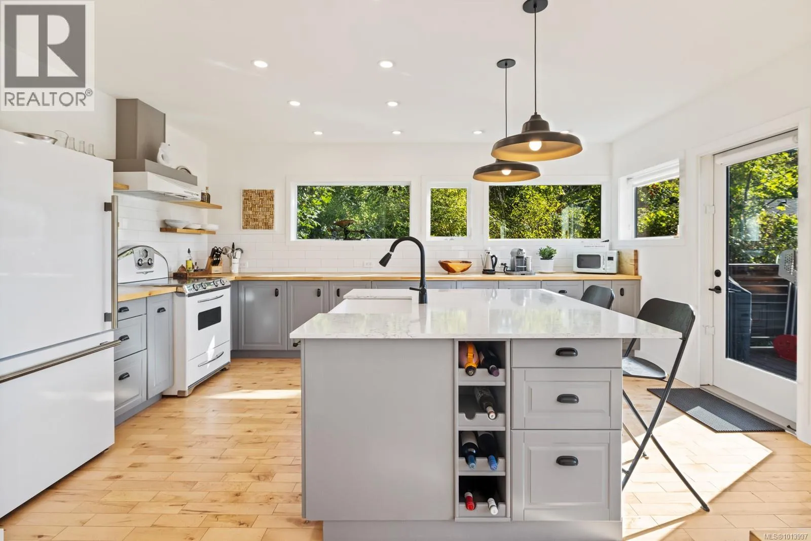 Welcome to 1784 Vee Road, Cowichan Bay. The covered entrance welcomes you into this architecturally designed home. The vaulted living room is filled with natural light that creates a wonderful, welcoming space. Flowing through the dining room, with its huge picture window to the Kitchen, featuring butcher block counters, a large central island and access to the entertainment sized rear patio. This west facing patio overlooks the fully fenced back yard, with fruit trees and very productive garden beds. The spacious primary bedroom is a relaxing space with private roof-top patio, as well as a 4 pcs ensuite and walk-in closet. There are two additional bedrooms on this level, complemented by a 5 pcs bath. Down is a one bed suite with its own entrance, great kitchen & island and a large bedroom with 3pcs ensuite. This is an excellent home in a highly desirable Cowichan Bay neighbourhood. (id:27476)