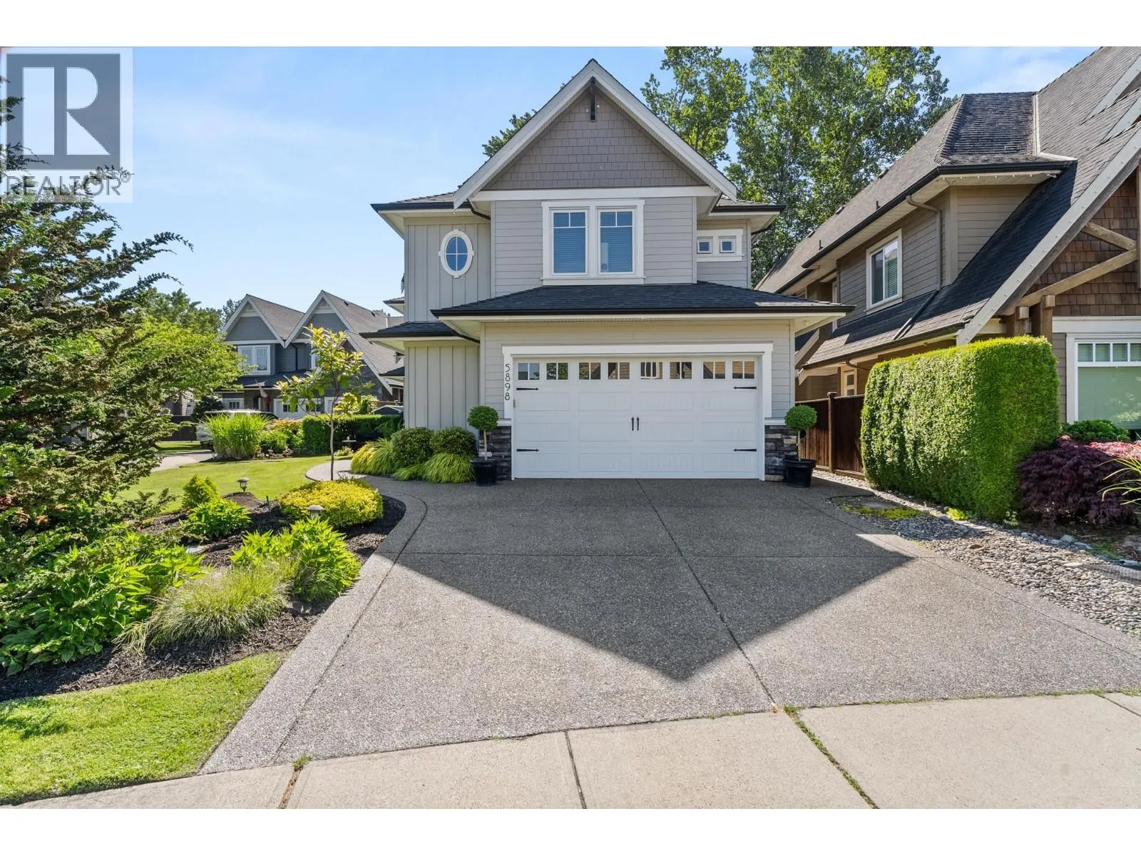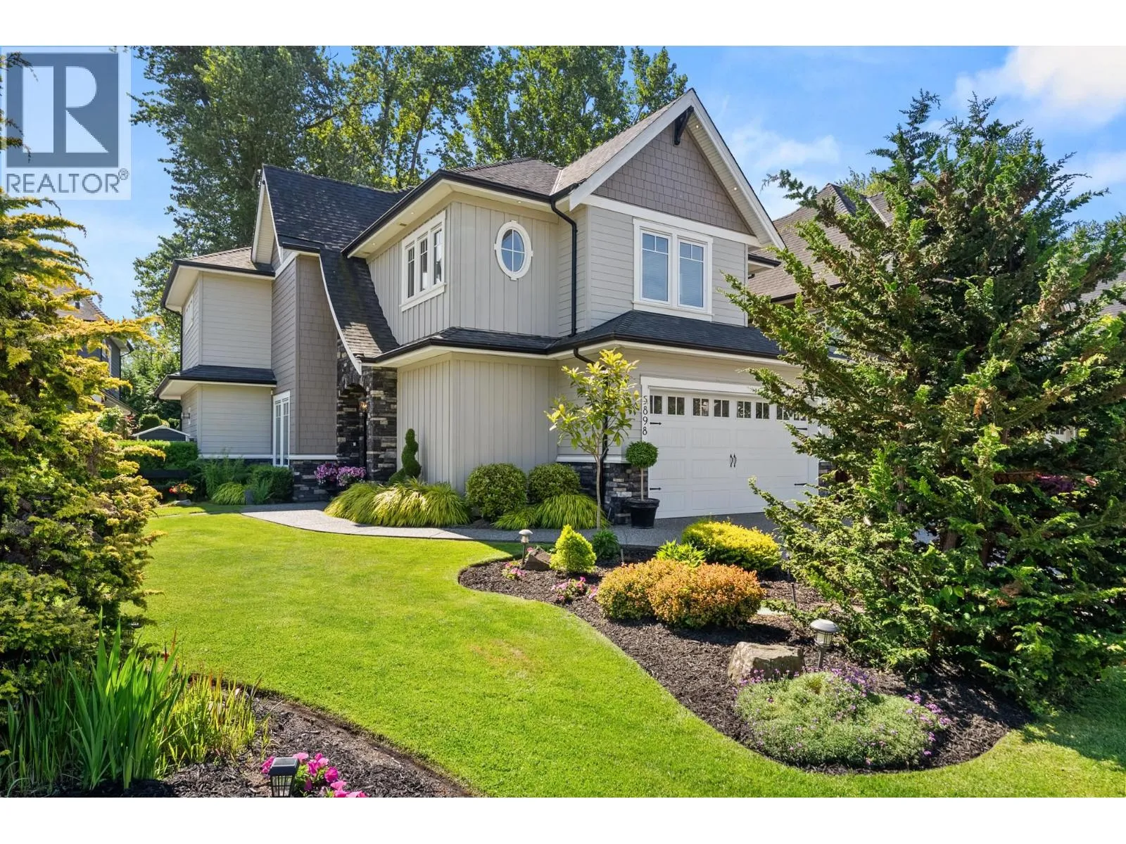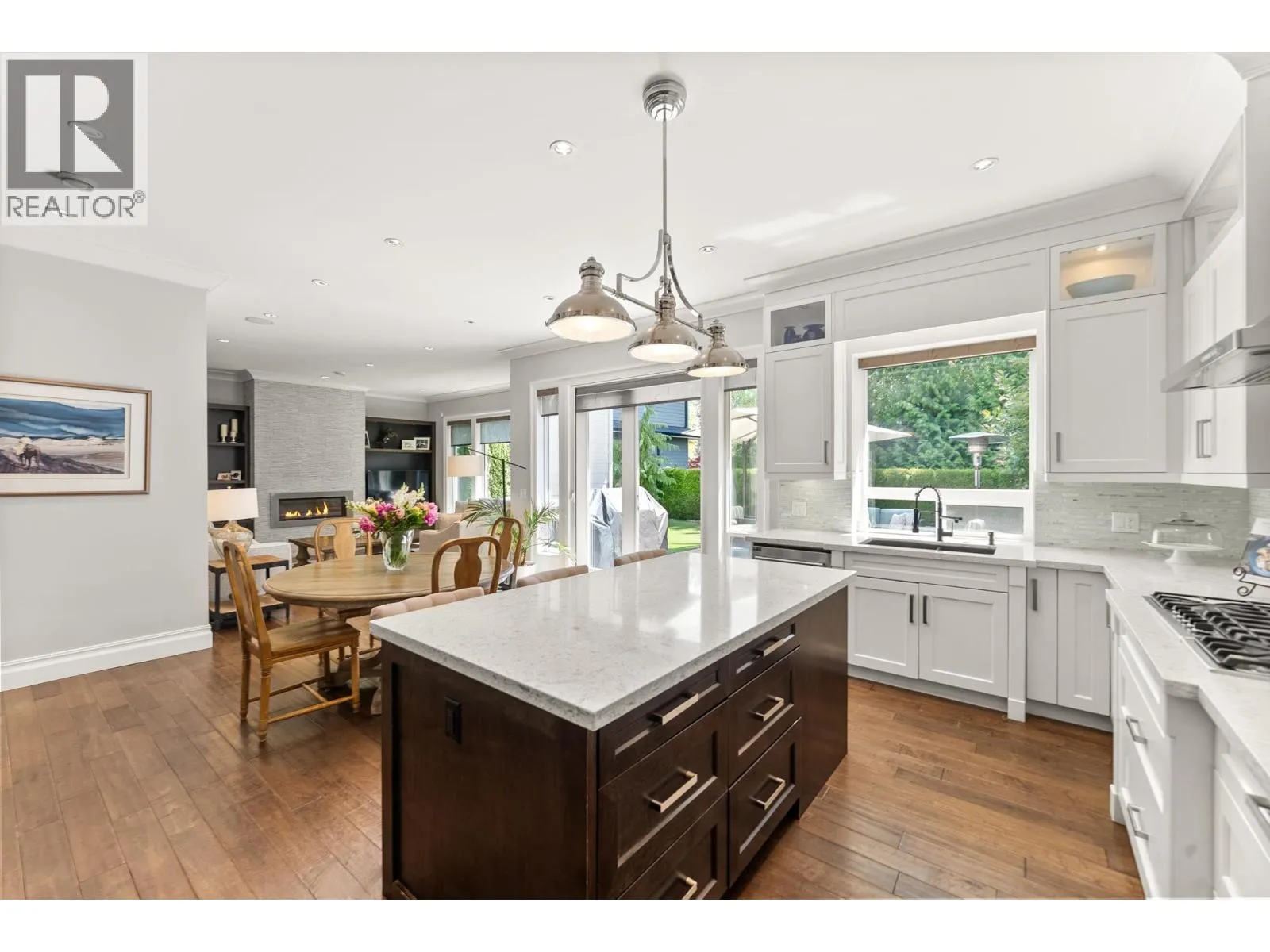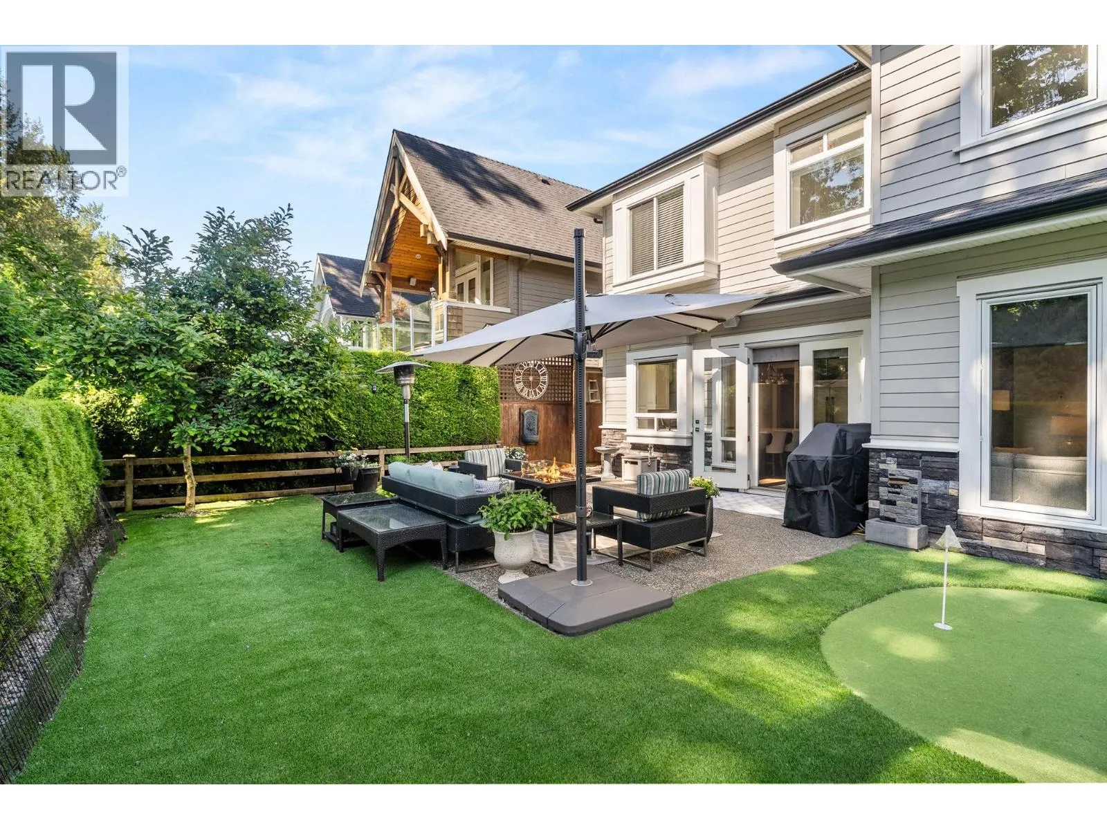 Elegantly situated on a cul-de-sac in Southamton Estates, this sophisticated 4-bedroom + den residence exudes luxury. Boasting 10' ceilings, engineered hardwood floors, and crown moldings, the home features a gas fireplace + HRV system for ultimate comfort. The dream kitchen is adorned with full-height cabinets, quartz countertops, and high-end stainless steel appliances, including an oversized side-by-side fridge and 5-burner gas range. The meticulously landscaped backyard offers a private oasis with a putting green + entertaining area. All bedrooms showcase ensuites, while the property also offers a partial view of the Cove Links golf course. Walking distance to Neilson Grove Elementary, marina, + parks. (id:27476)