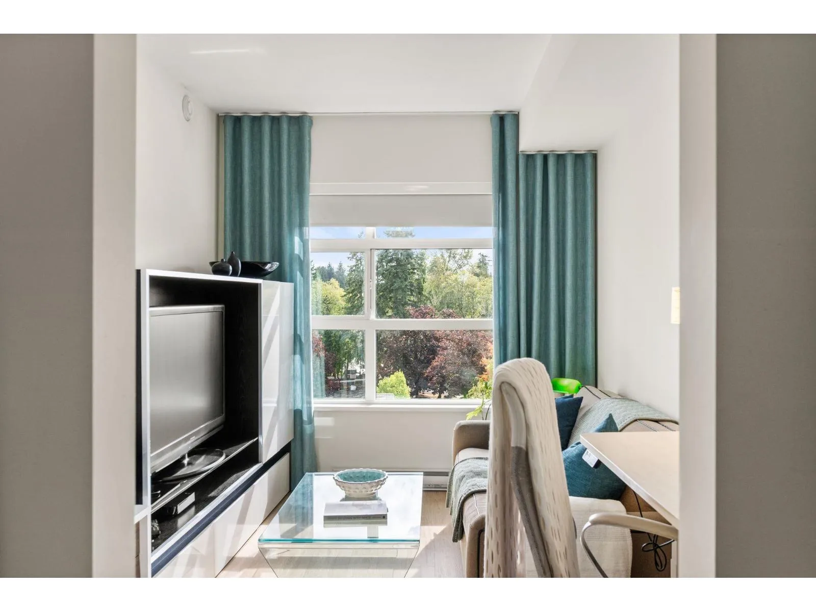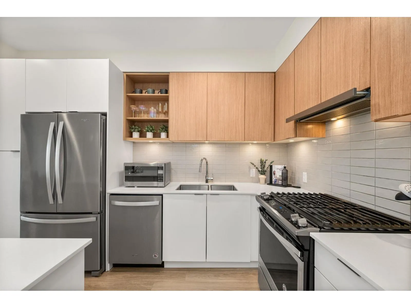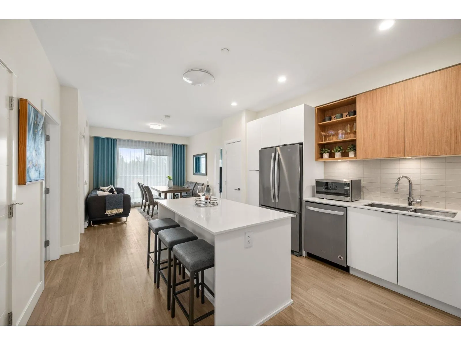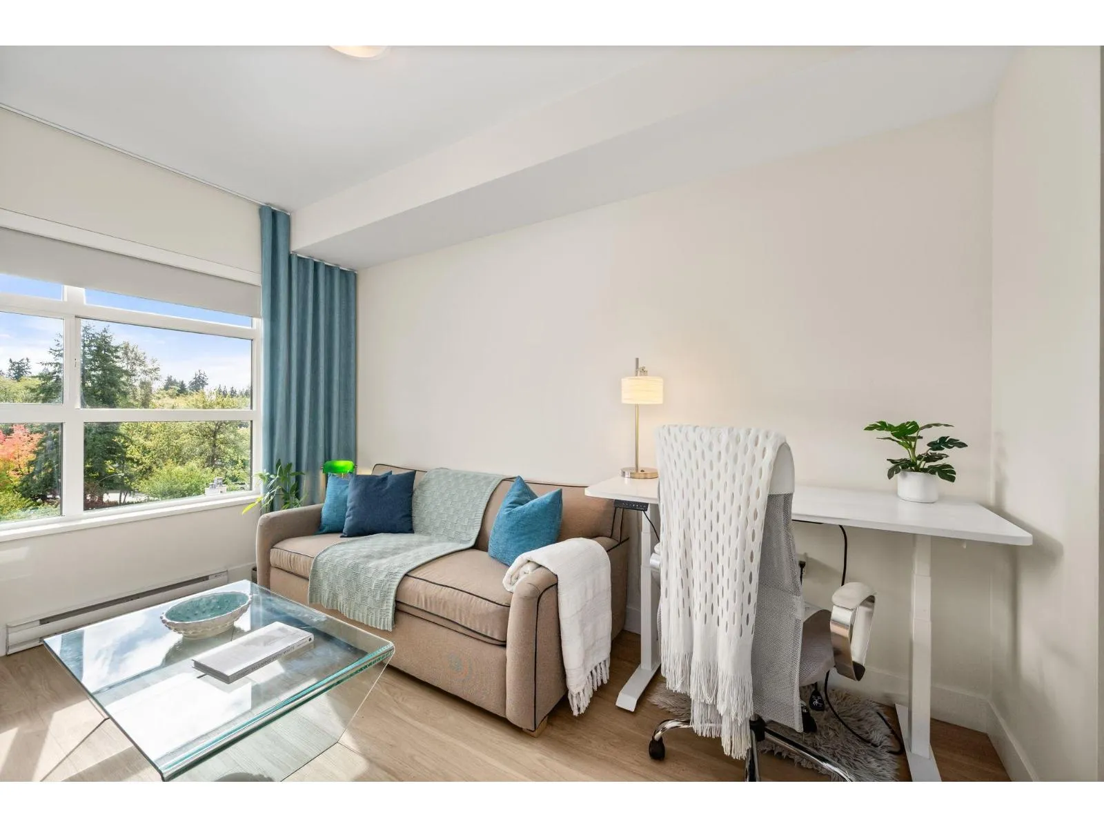 Sunny top-floor 2-bedroom+den home with bright southern exposure and soaring 11' vaulted ceilings-a rare find! This beautifully maintained, owner-occupied suite offers an airy open-concept design with abundant natural light, elegant finishes and no one above you for peace and privacy. The gourmet kitchen boasts sleek cabinetry, quartz counters and S/S appliances overlooking a spacious living/dining area that opens to a sunny balcony-perfect for relaxing and enjoying the views (gas outlet). The primary bedroom includes a walk-in closet and generous ensuite, while the den provides excellent flexibility for a home office, flex or large storage space. Amenities include a fitness centre, social lounge with kitchen and pool table, BBQ area and secure parking. Pet and rental friendly. Ideally located in sought-after Sunshine Hills within the coveted Seaquam Secondary (IB Program) catchment, just steps to shopping, restaurants, schools, trails, and transit. (id:27476)