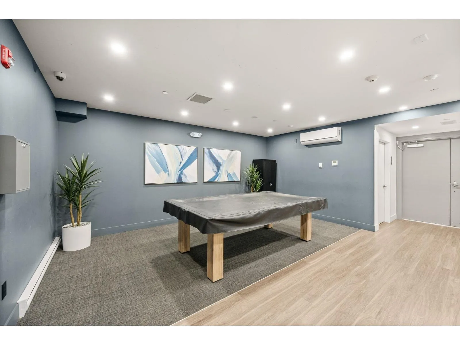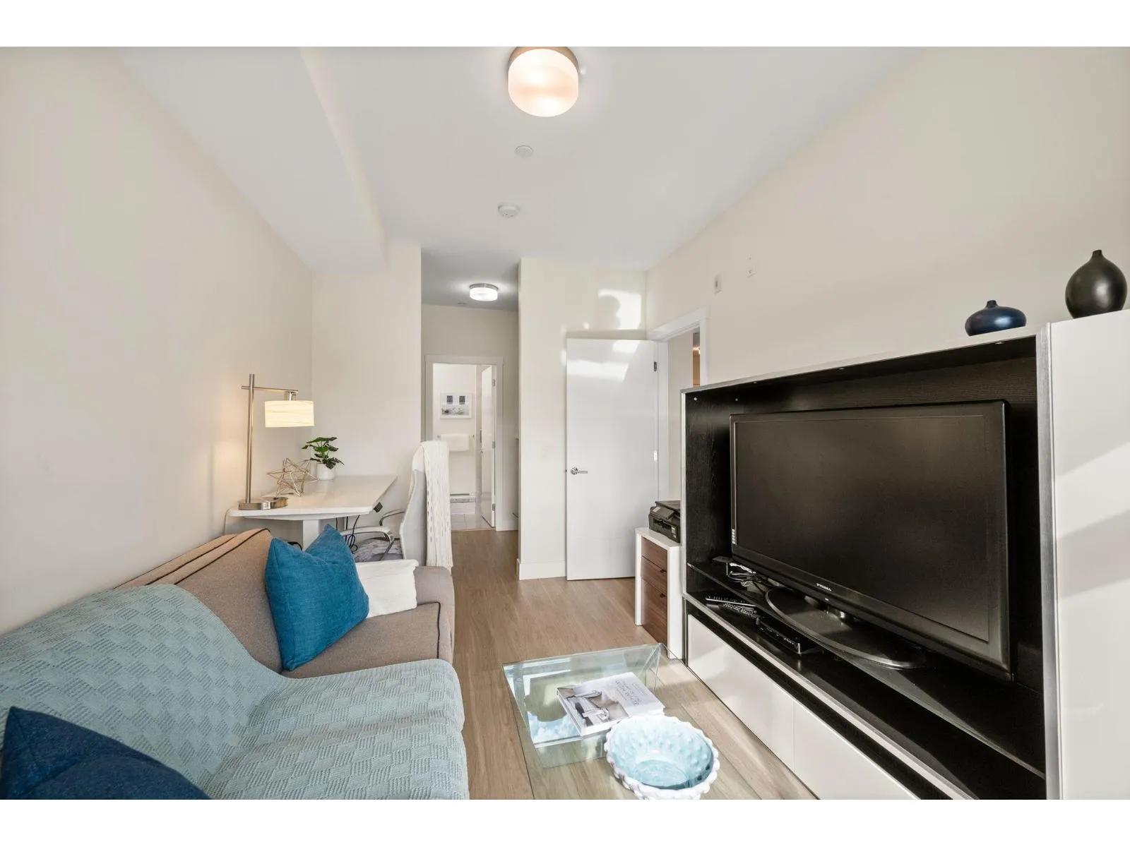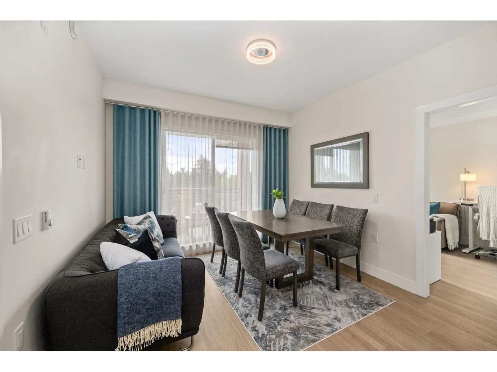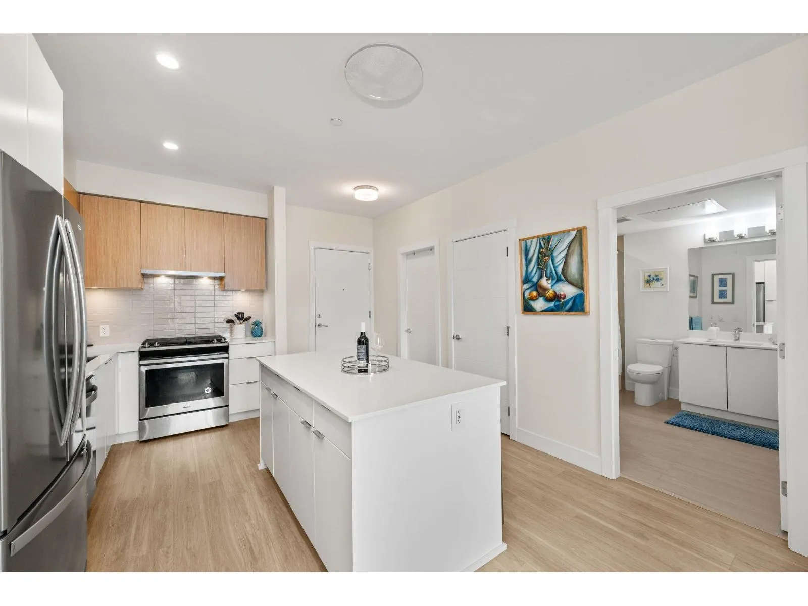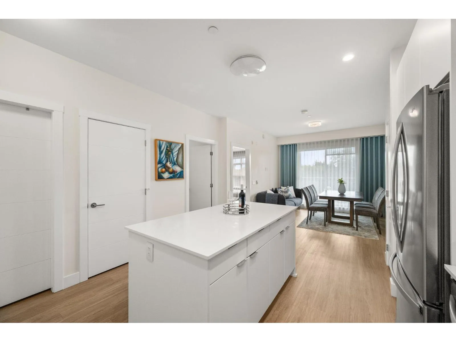 Sunny top-floor 2-bedroom+den home with bright southern exposure and soaring 11' vaulted ceilings-a rare find! This beautifully maintained, owner-occupied suite offers an airy open-concept design with abundant natural light, elegant finishes and no one above you for peace and privacy. The gourmet kitchen boasts sleek cabinetry, quartz counters and S/S appliances overlooking a spacious living/dining area that opens to a sunny balcony-perfect for relaxing and enjoying the views (gas outlet). The primary bedroom includes a walk-in closet and generous ensuite, while the den provides excellent flexibility for a home office, flex or large storage space. Amenities include a fitness centre, social lounge with kitchen and pool table, BBQ area and secure parking. Pet and rental friendly. Ideally located in sought-after Sunshine Hills within the coveted Seaquam Secondary (IB Program) catchment, just steps to shopping, restaurants, schools, trails, and transit. (id:27476)