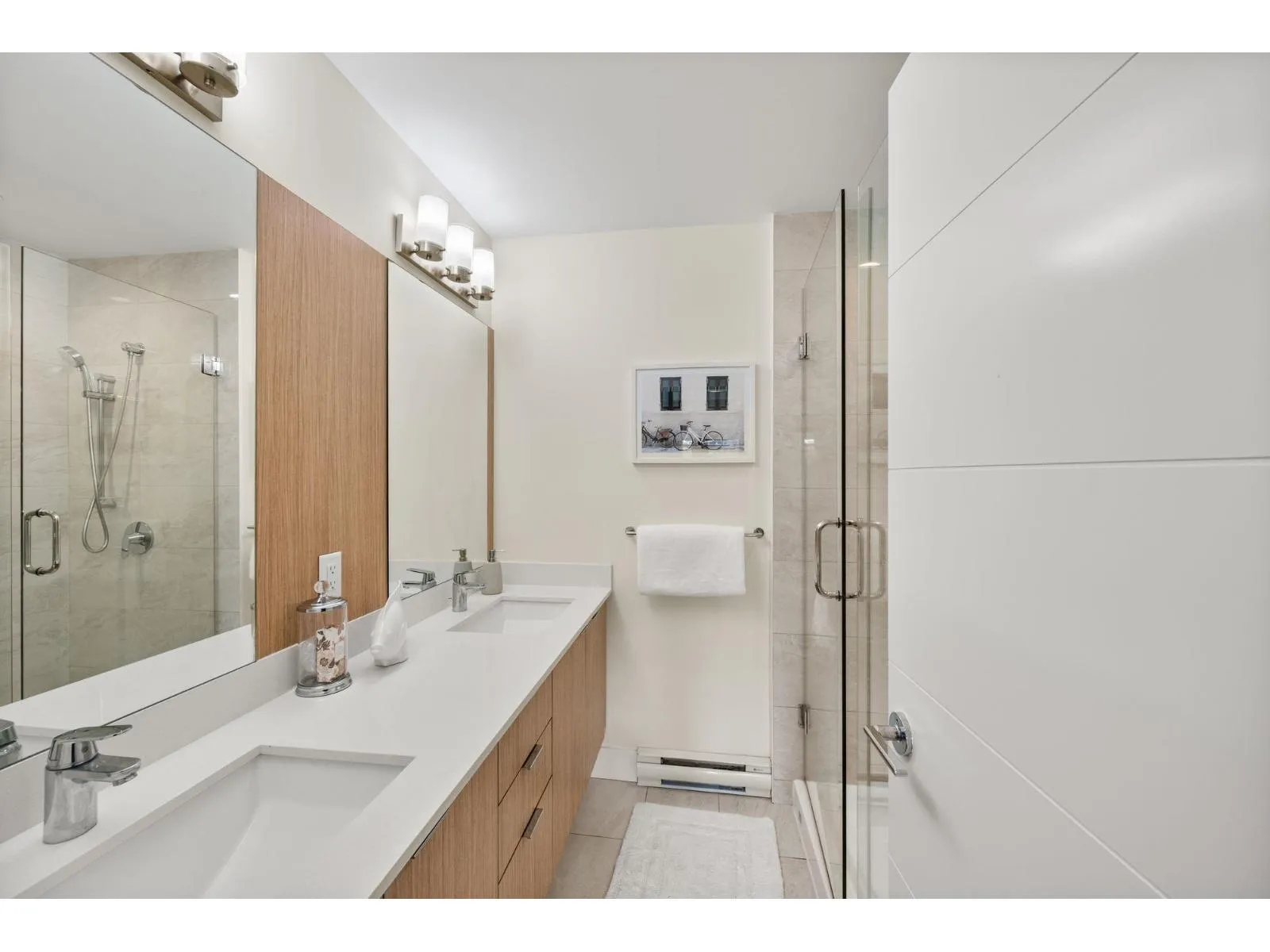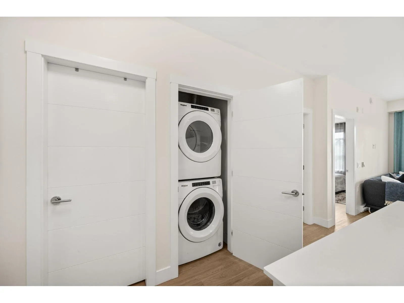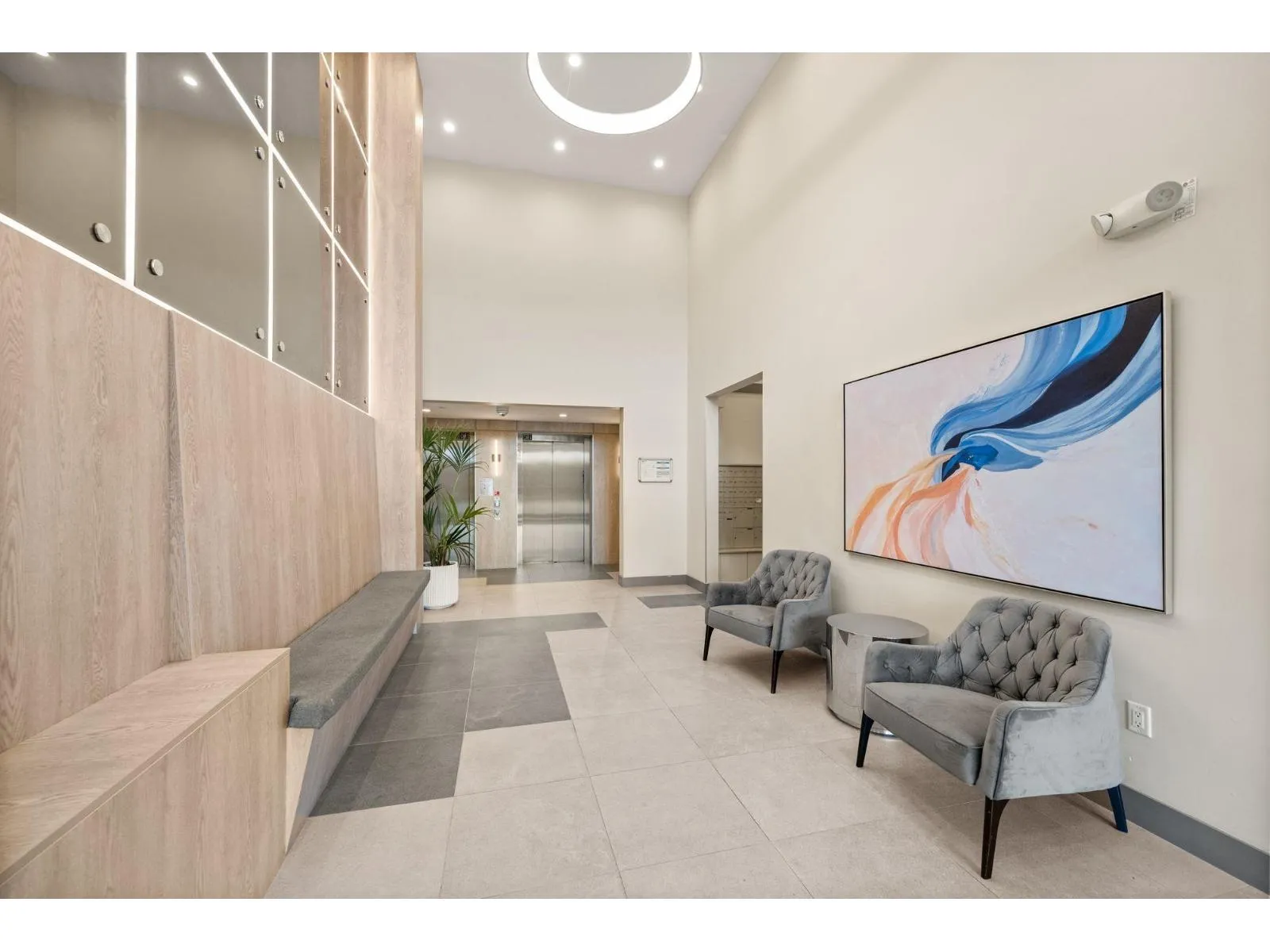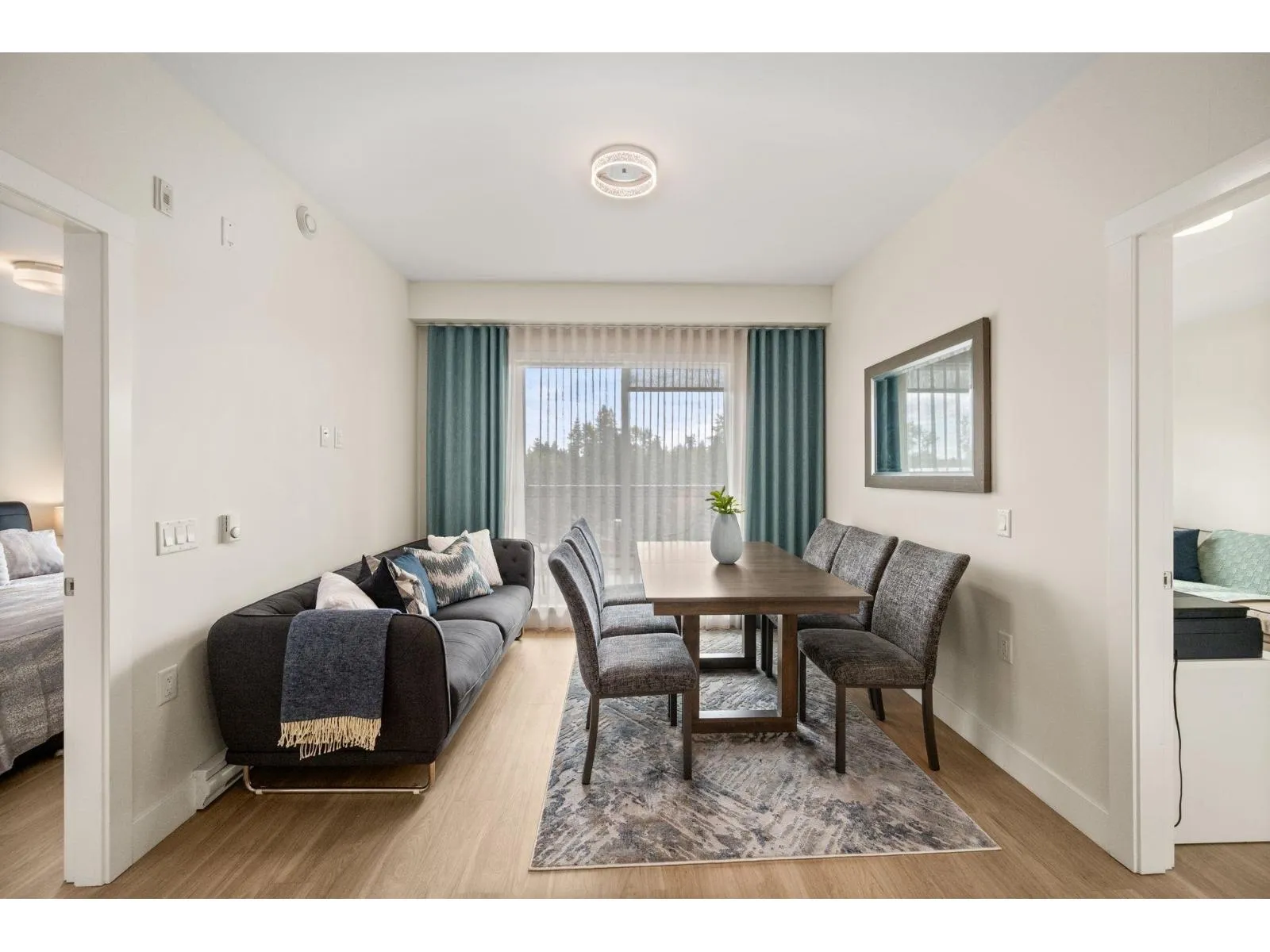 Sunny top-floor 2-bedroom+den home with bright southern exposure and soaring 11' vaulted ceilings-a rare find! This beautifully maintained, owner-occupied suite offers an airy open-concept design with abundant natural light, elegant finishes and no one above you for peace and privacy. The gourmet kitchen boasts sleek cabinetry, quartz counters and S/S appliances overlooking a spacious living/dining area that opens to a sunny balcony-perfect for relaxing and enjoying the views (gas outlet). The primary bedroom includes a walk-in closet and generous ensuite, while the den provides excellent flexibility for a home office, flex or large storage space. Amenities include a fitness centre, social lounge with kitchen and pool table, BBQ area and secure parking. Pet and rental friendly. Ideally located in sought-after Sunshine Hills within the coveted Seaquam Secondary (IB Program) catchment, just steps to shopping, restaurants, schools, trails, and transit. (id:27476)