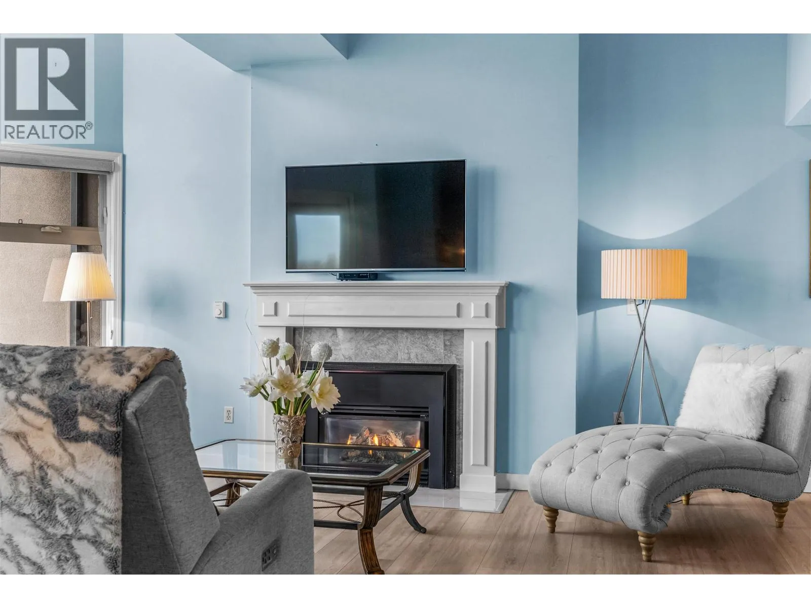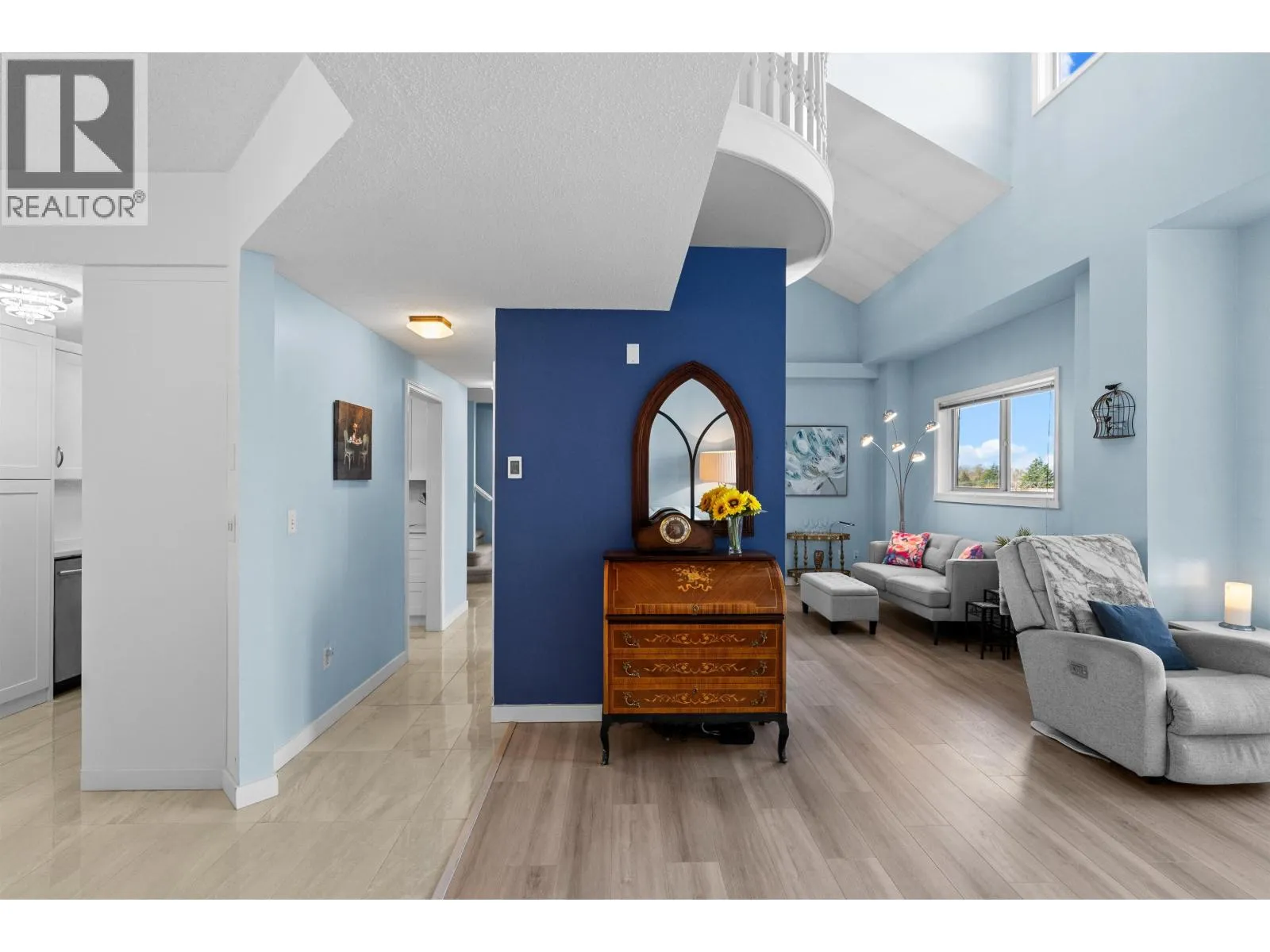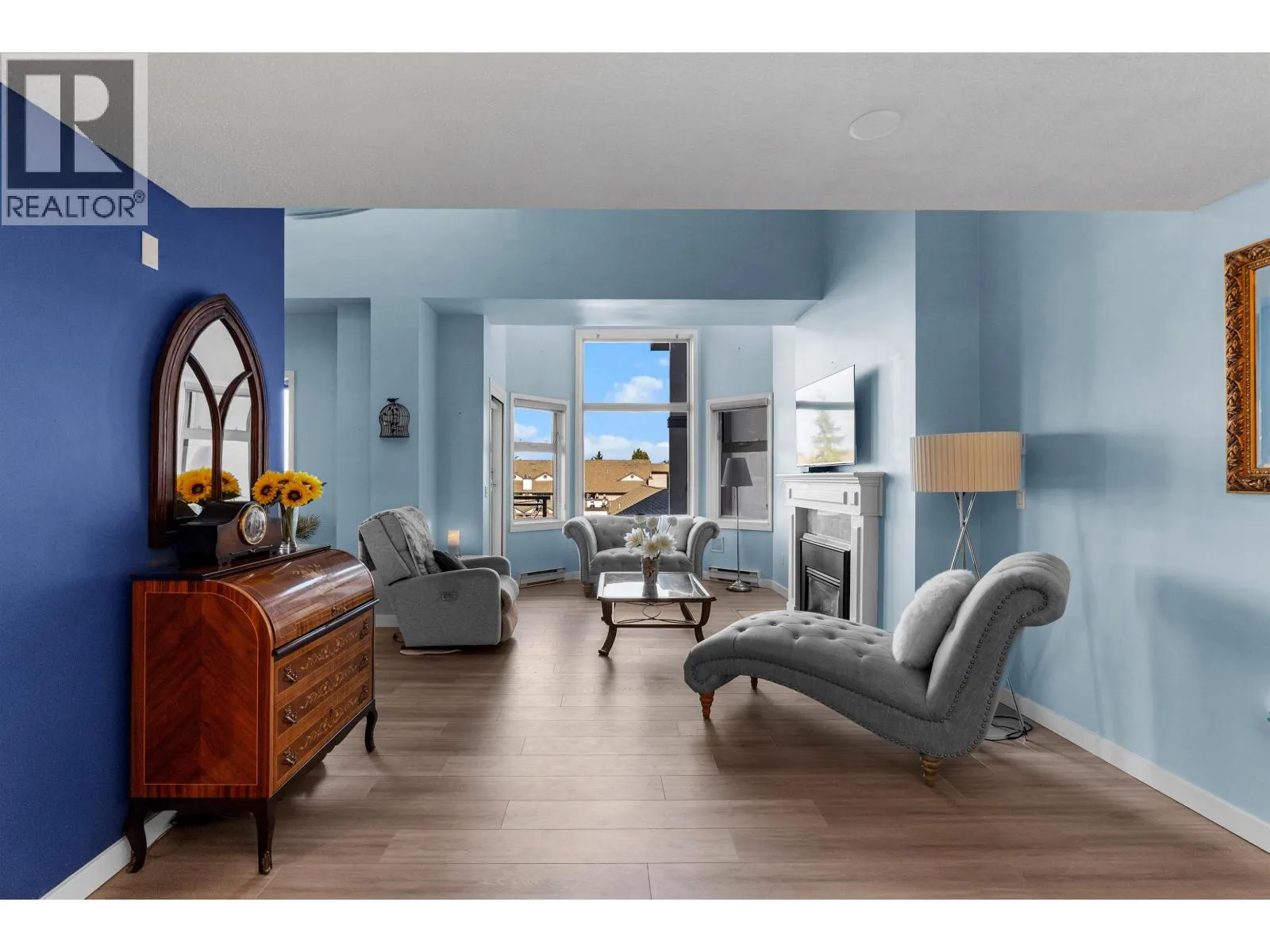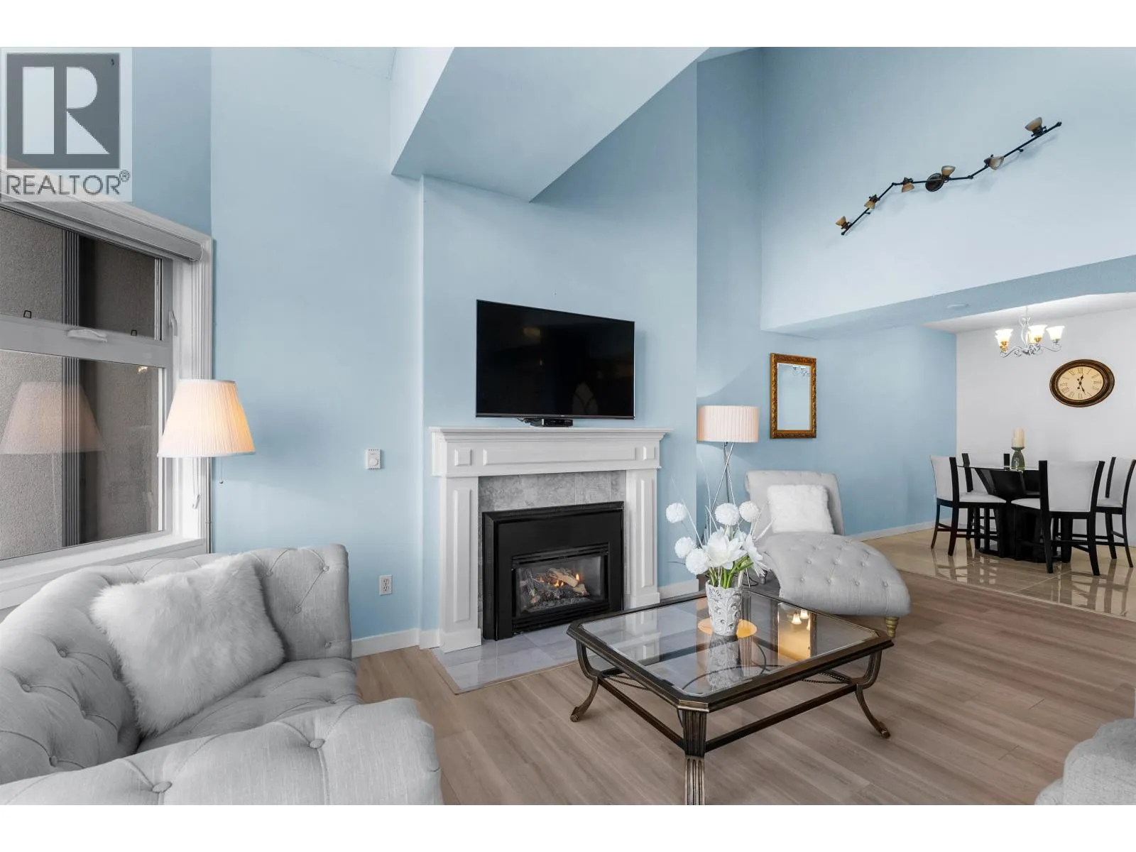 This incredible penthouse spans the 5th and 6th floors in one of Ladner´s only concrete, rain screened buildings! Bright and airy with over 1,800 sq.ft., 19-ft vaulted ceilings, and two-story windows that fill the home with natural light. The main level features a brand-new kitchen, spacious living and dining areas, cozy gas fireplace, and primary bedroom plus ensuite. Upstairs offers two additional bedrooms or office/flex space with its own private entrance. Enjoy North Shore mountain views, a large balcony, and an unbeatable central location just steps to shops, dining, and parks! Pets allowed w/restrictions + 2 parking spots. (id:27476)