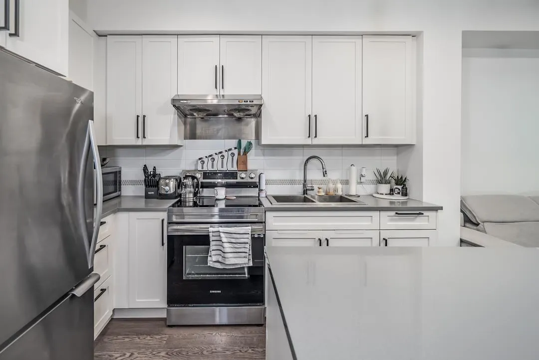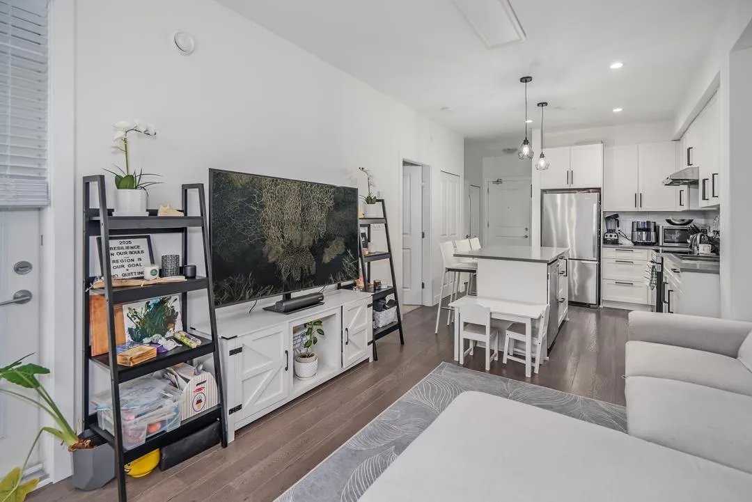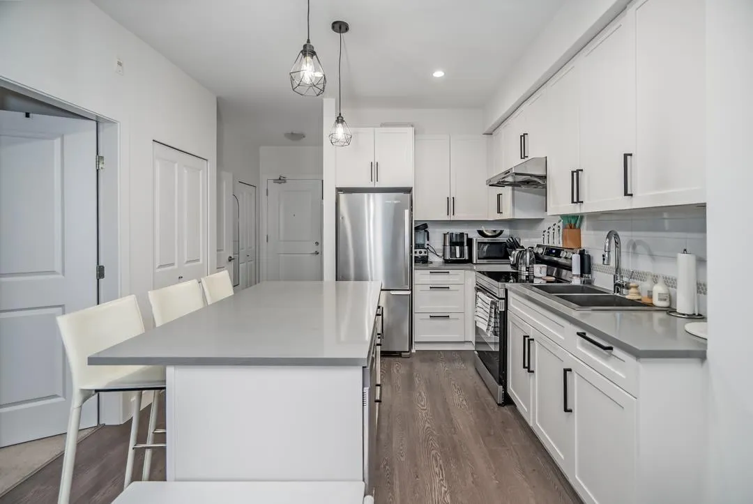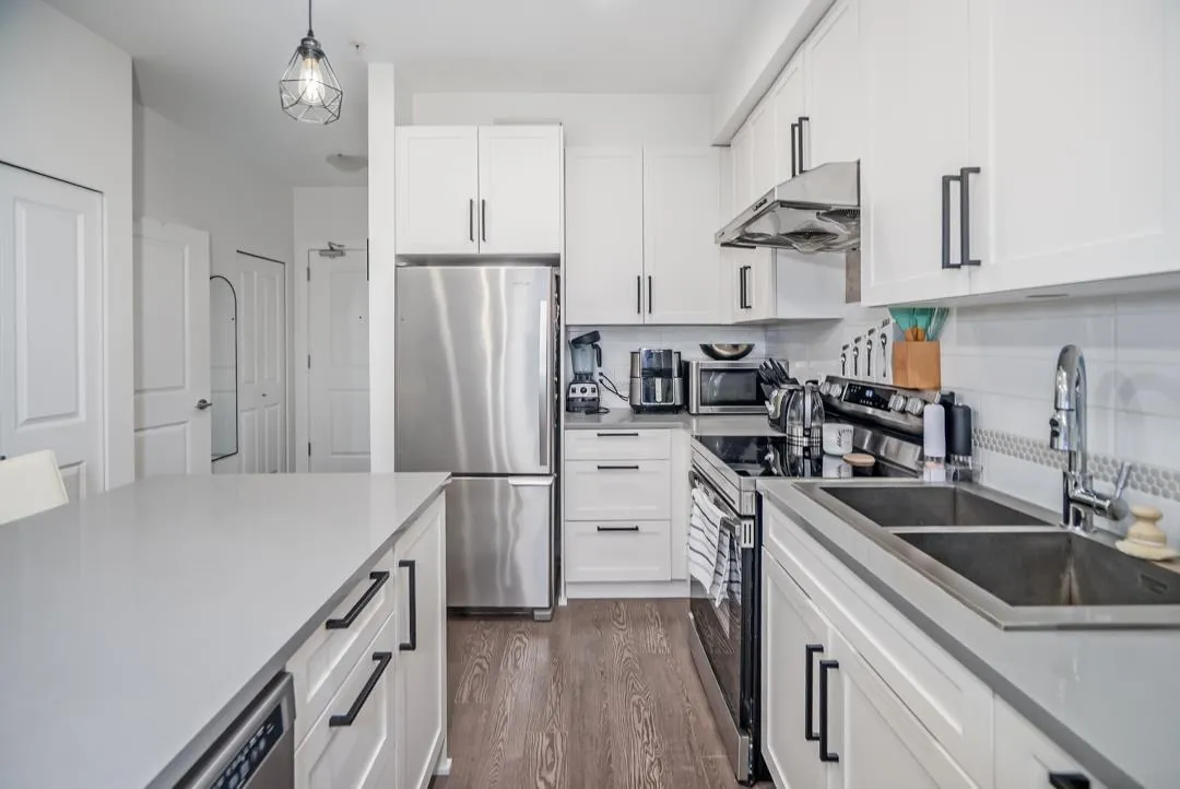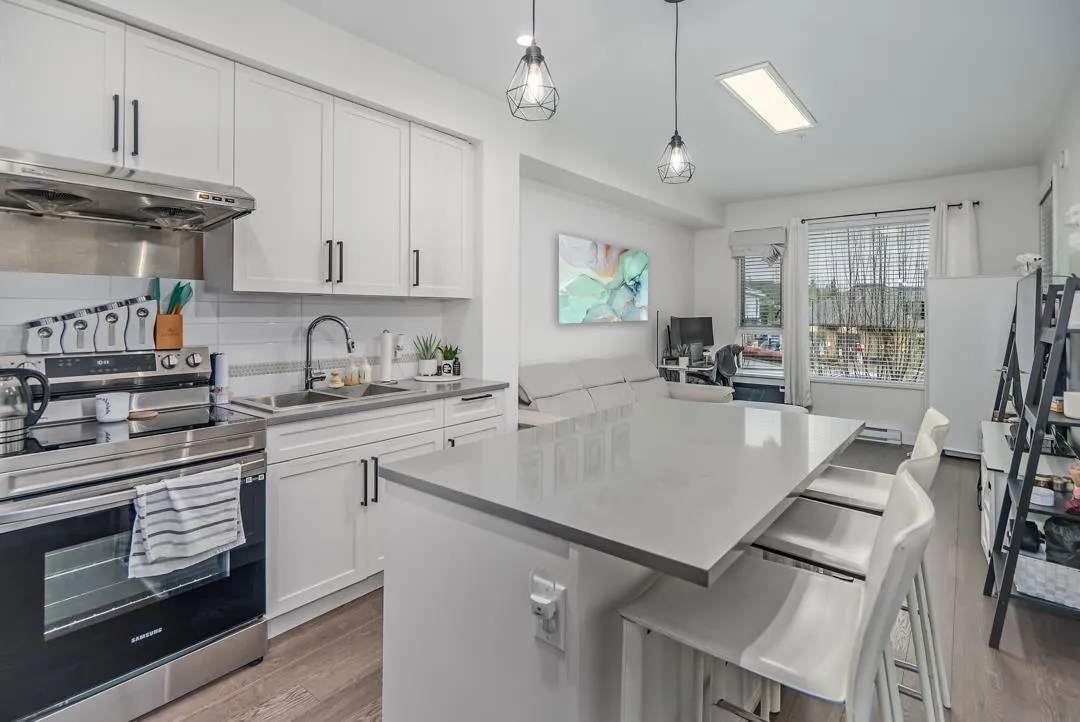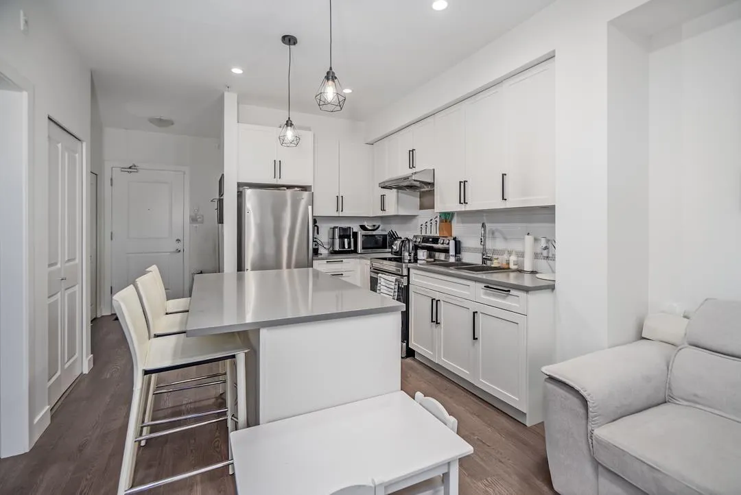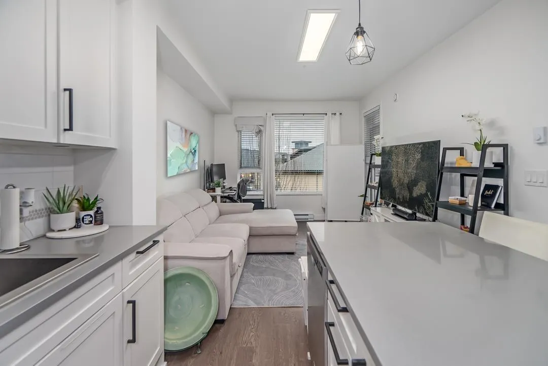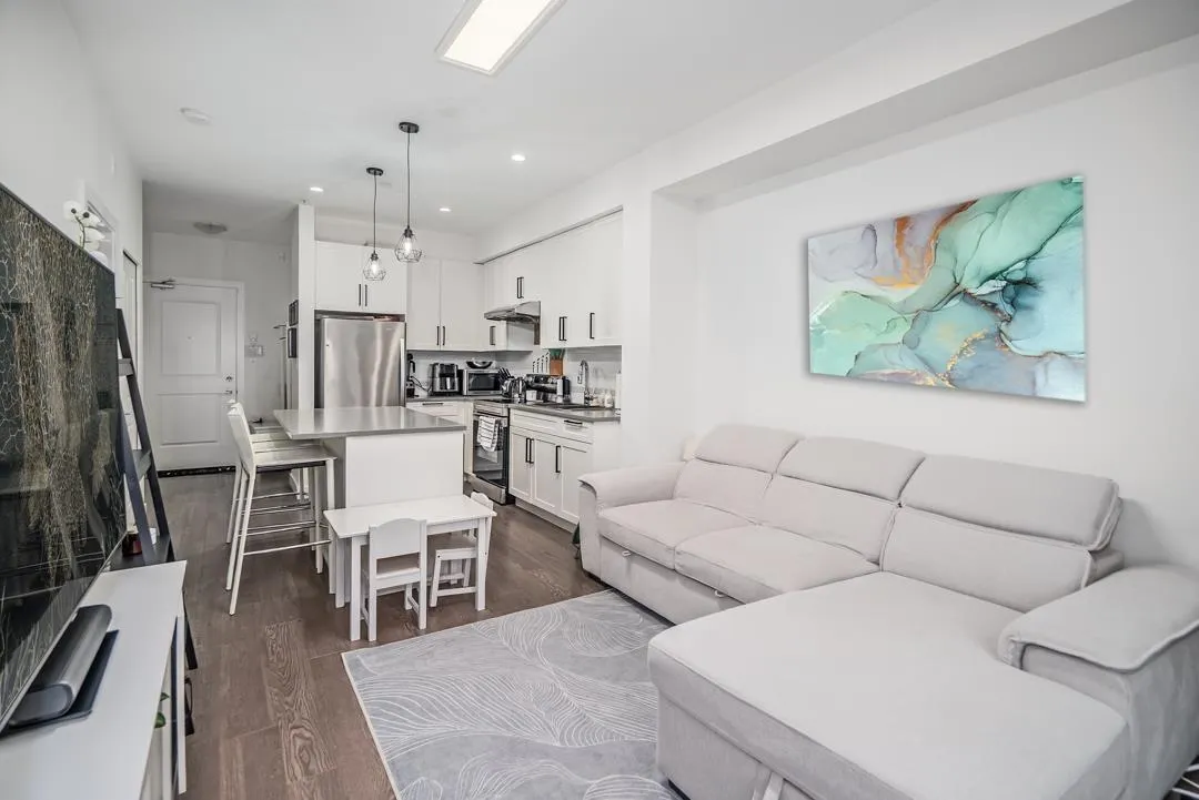 Sunstone Village Community with an easy access to a new commercial plaza built at your doorsteps! This south facing 1 bedroom plus 1 den unit with an open floor plan and is a perfect home for a young family or someone looking for hassle-free living. Your home features thoughtfully designed interiors that combine traditional finishes with modern comforts. Stunning, white shaker-style cabinets with quartz countertops, large island and full appliance package! This unit comes with 1 parking spot (EV CHARGER ready), and 1 locker. Close to schools, bus route and Hwy 91. Minutes to Gray Elementary, Sands Sec., Devon Garden & IC Delta. Pro-active strata! Must see! (id:27476)