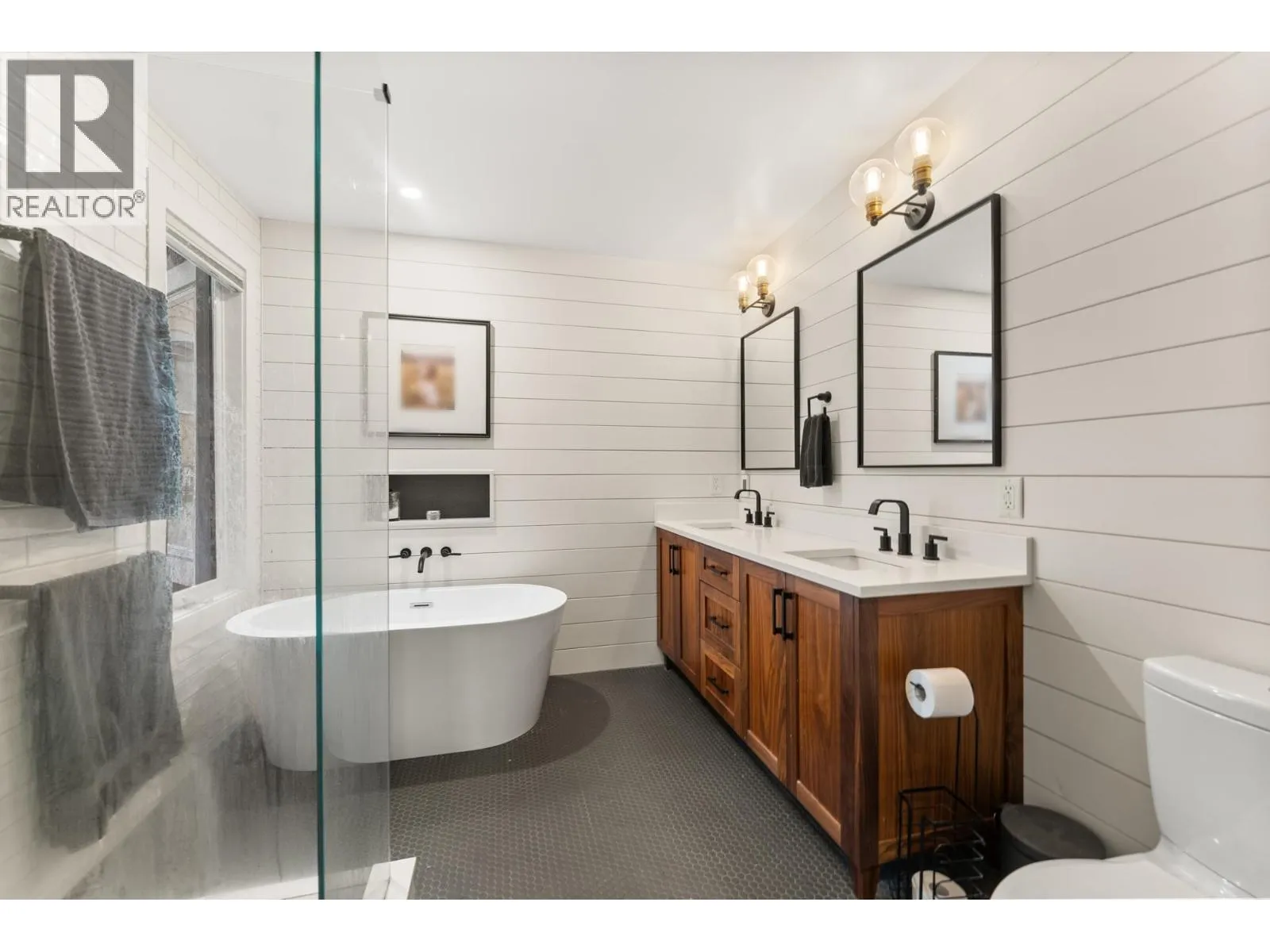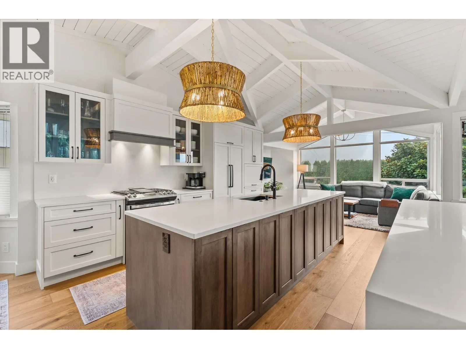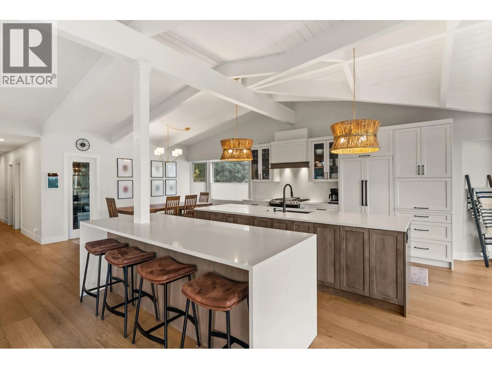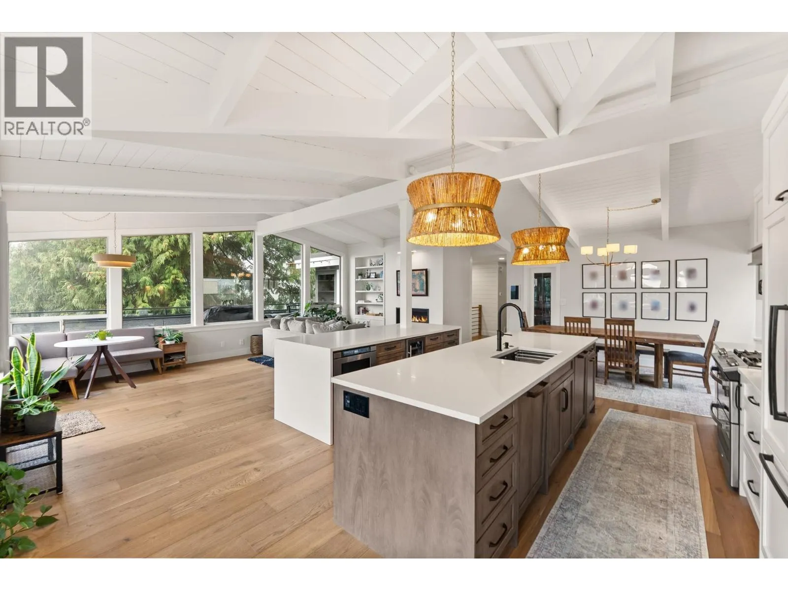Elegantly renovated West Coast contemporary residence showcasing dramatic post-and-beam ceilings in the expansive great room. The beautifully redesigned kitchen features custom cabinetry, quartz countertops, professional-series appliances, and dual islands ideal for everyday living and entertaining. Floor-to-ceiling windows frame picturesque views and open to a sun-filled southwest-facing deck. The upper level offers new hardwood flooring and a serene primary retreat with a luxurious five-piece ensuite, walk-in glass shower, and freestanding soaker tub. Ideally located in the Village on prestigious Pacific Drive, this exceptional home includes an additional bedroom with in-law or nanny potential, a private office, media room, and an oversized double garage with workshop and ample storage. (id:27476)