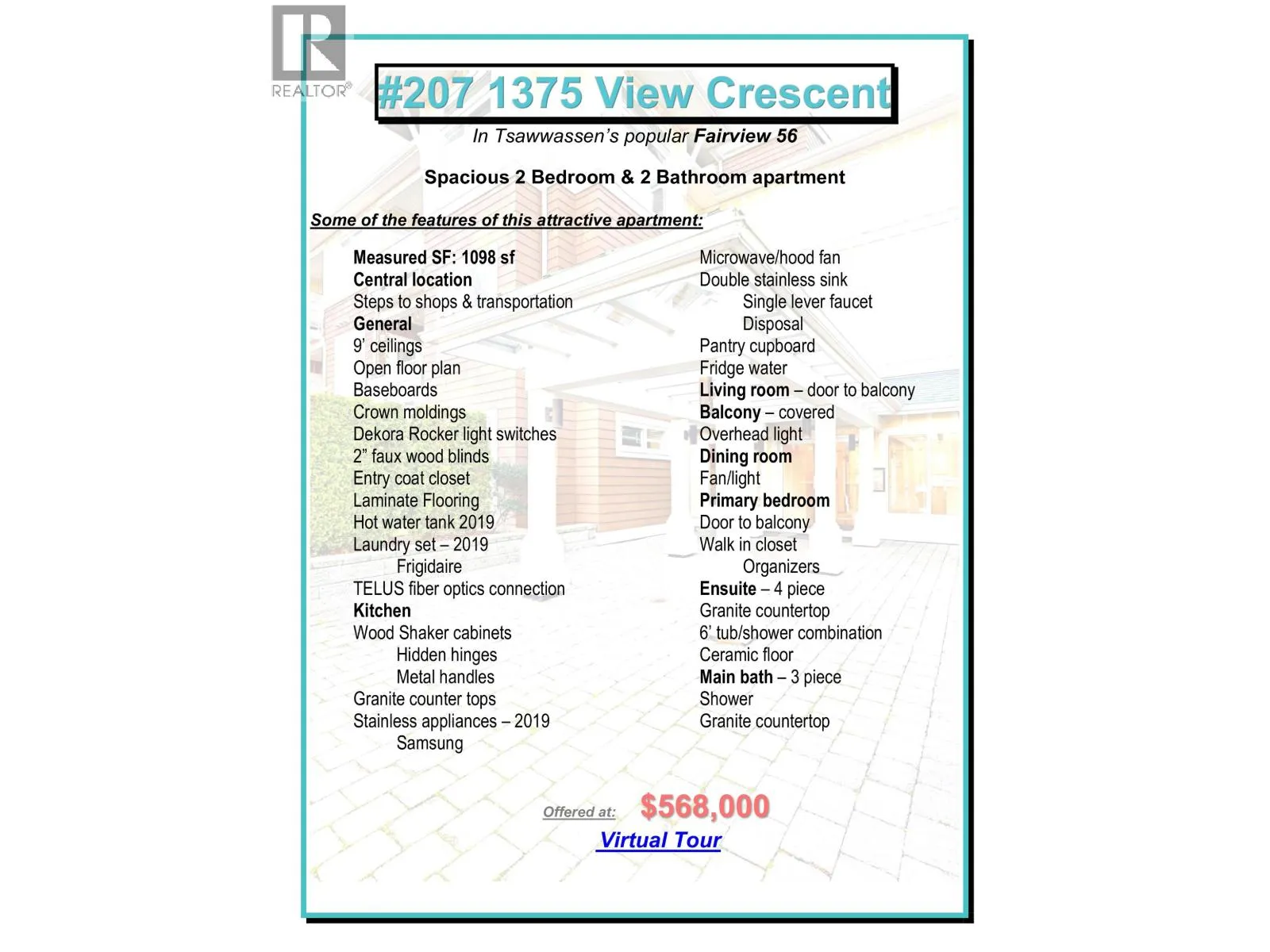 Sparkling modern apartment in Tsawwassen's popular Fairview 56. Superb central location steps to transpo, shopping & town centre amenities. Bonus size: Strata Plan shows 985 sf but as-builts measured by YVRPixel show 1098 sf! Open floor plan with spacious rooms & 9' ceilings. Superb finish with baseboards, crown mouldings, Dekora Rocker & more. Updates in 2019 include: all new stainless Samsung kitchen appliances (incl microwave - hood fan), Frigidaire laundry set & hot water tank. 2006 build means many modern components & applications including a fully rain-screened exterior. Well managed building - ask for the documents! This is a wonderful opportunity for carefree living in T-Town's vibrant centre. Visit an open house or request your private viewing. (id:27476)
