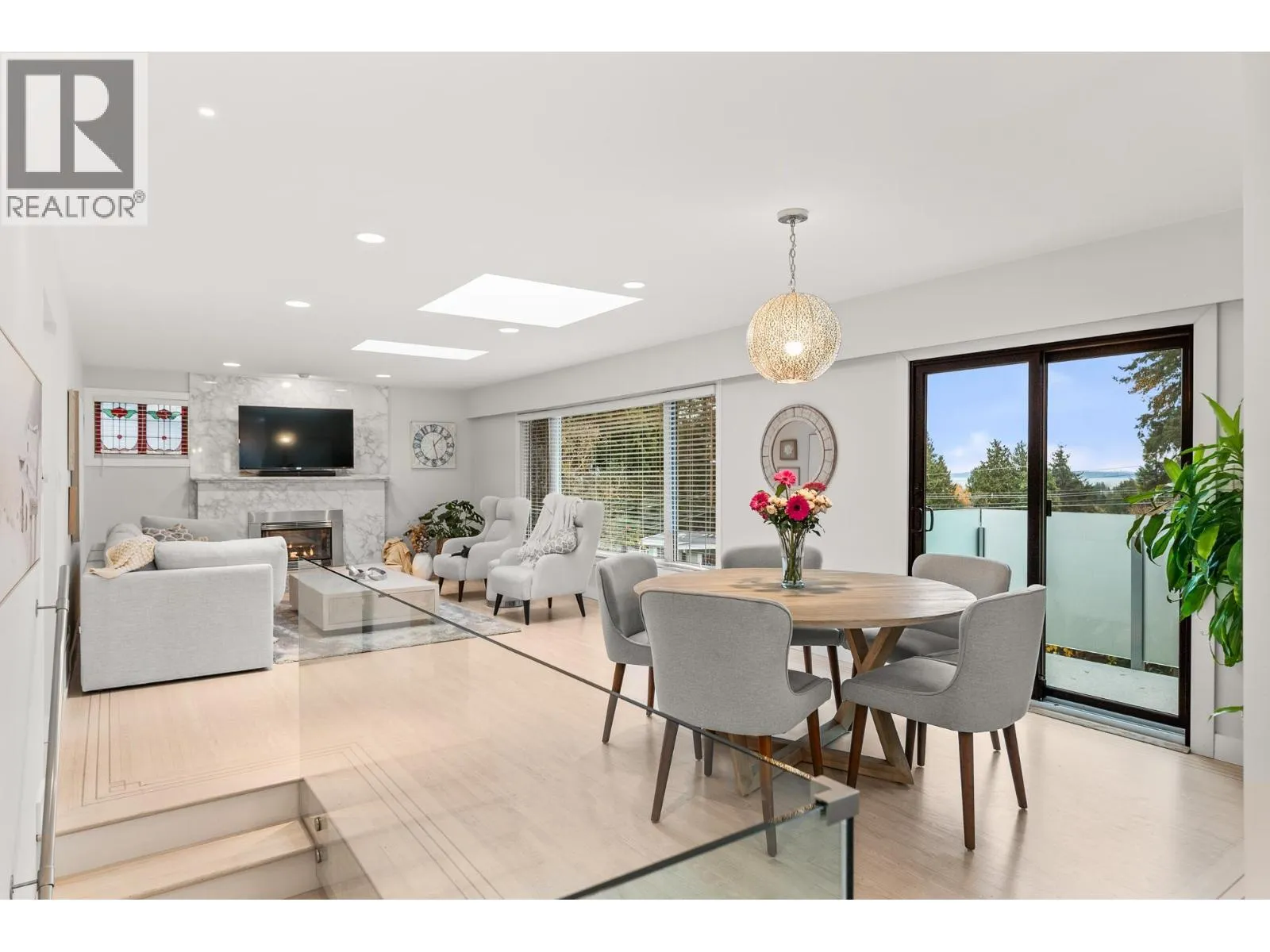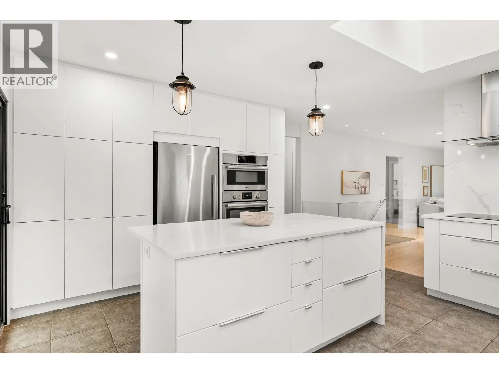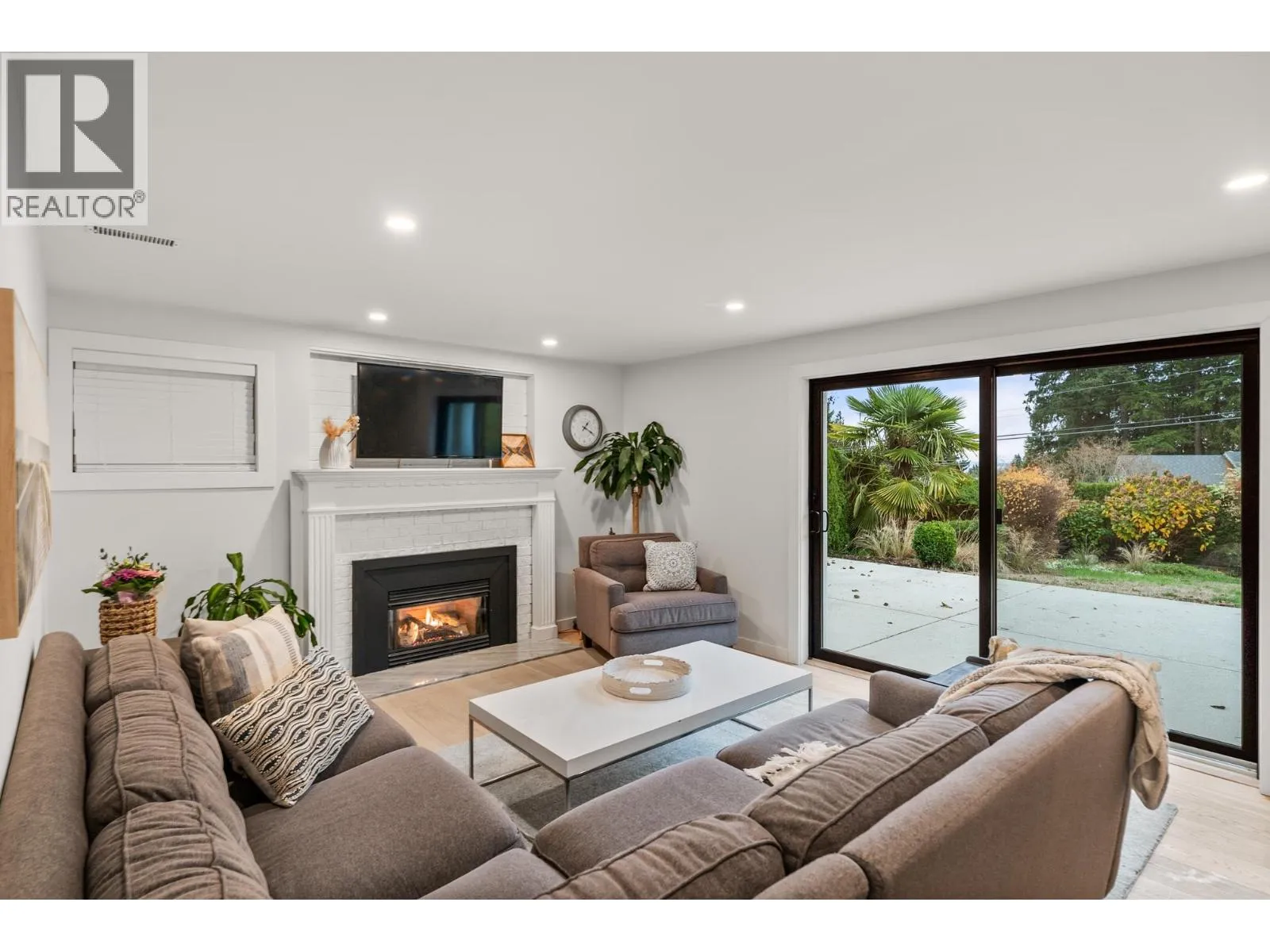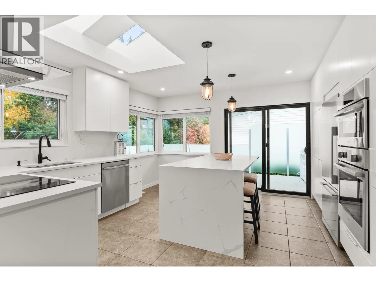 This stunning Village home delivers instant WOW with a dramatic marble floor-to-ceiling gas fireplace & a sleek designer kitchen featuring Bosch & Fisher & Paykel appliances, quartz accents, & a striking waterfall island. Large windows bring in natural light throughout. Upstairs offers 3 bedrooms & 2 beautifully renovated bathrooms, including a primary retreat opening to an expansive 966 sq. ft. deck. A sunny side deck W/opaque glass railings extends the living space while capturing peekaboo ocean & White Rock views. The lower level incudes a bedroom, den, family room, sauna, & spa-like bath w/heated marble floors - ideal for a suite. Double garage w/epoxy floors & EV charger. Private yard with mature gardens & powered shed. Must see! Book your private showing now! (id:27476)
