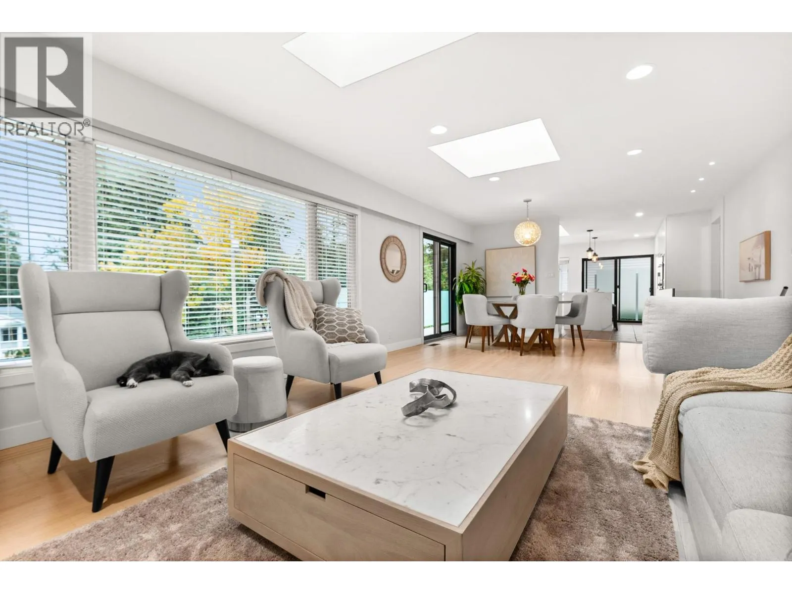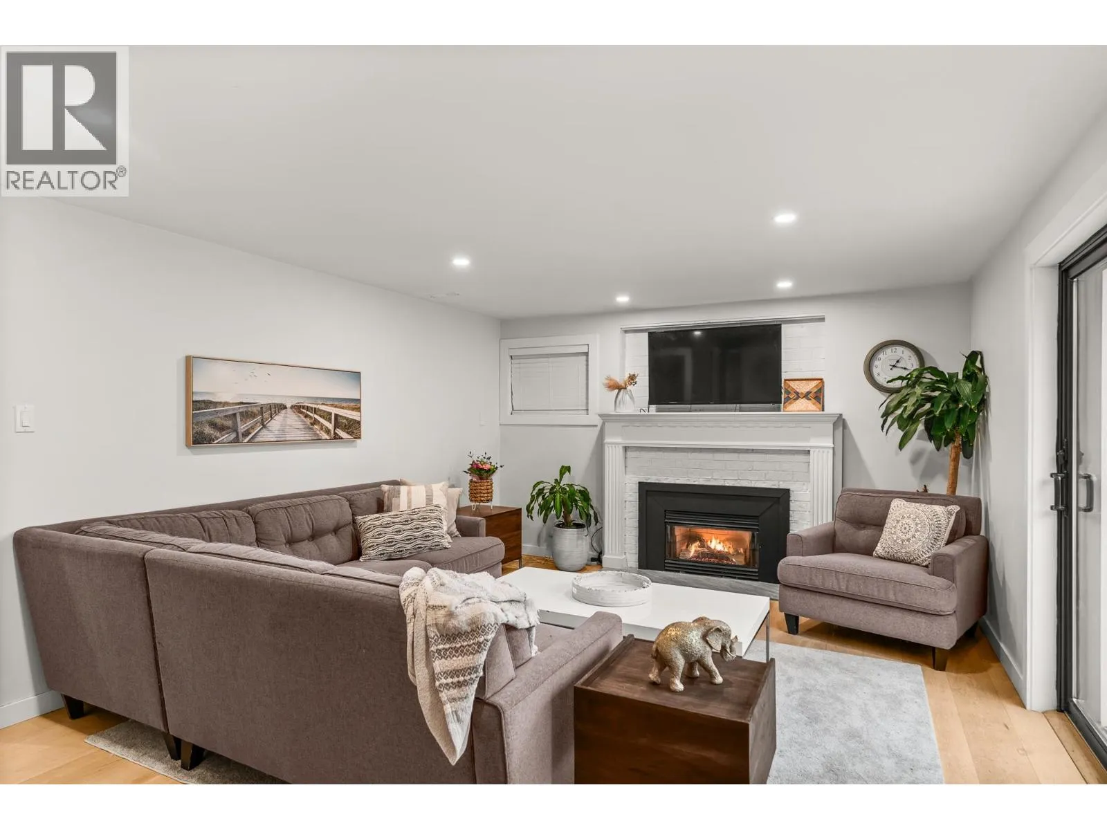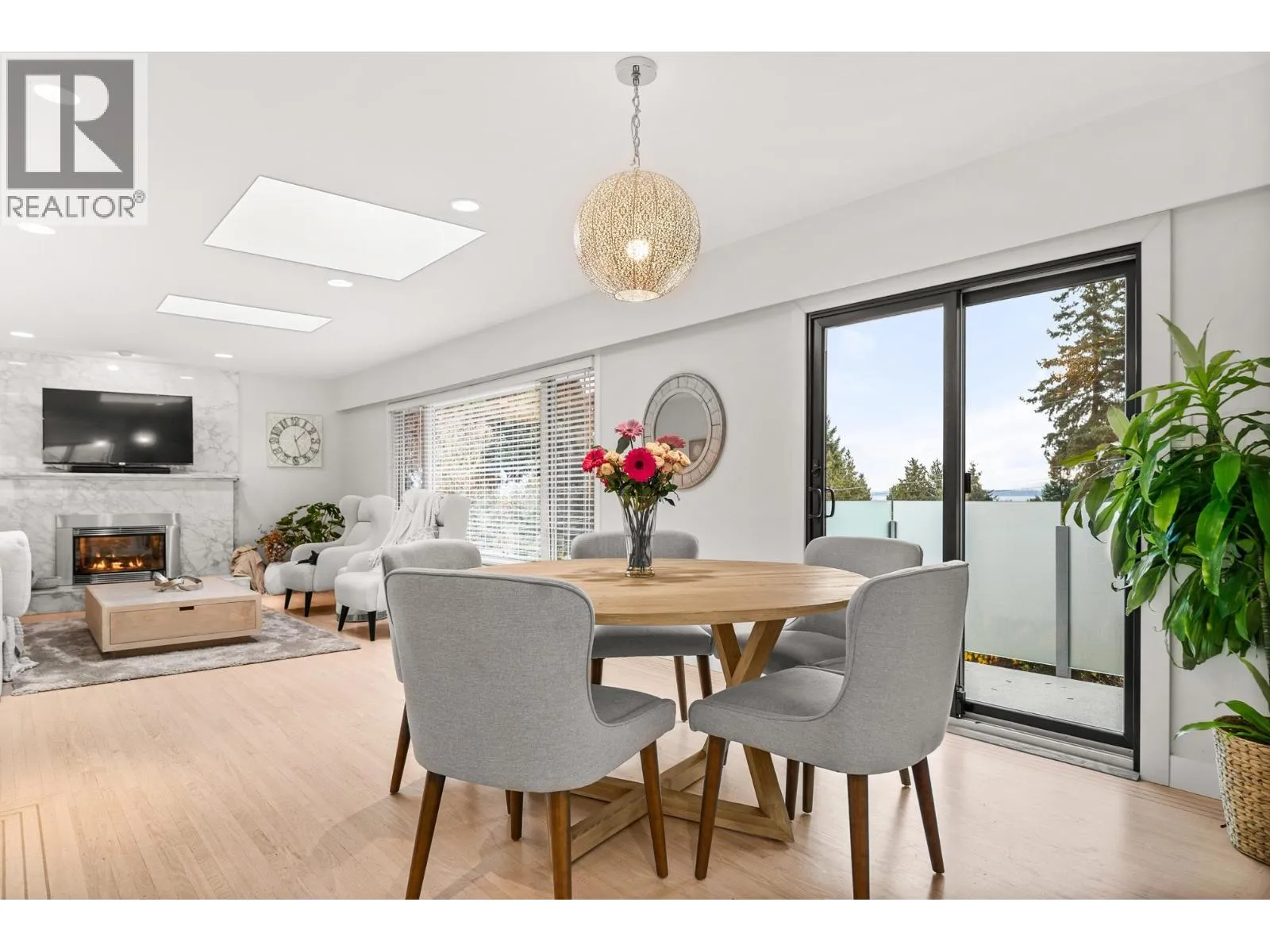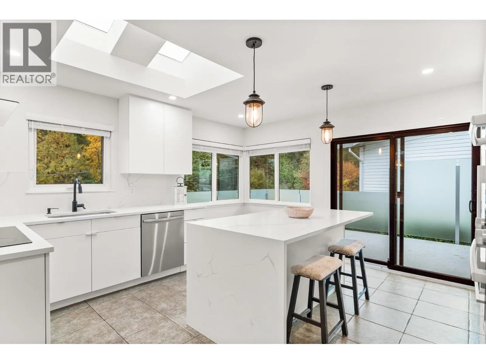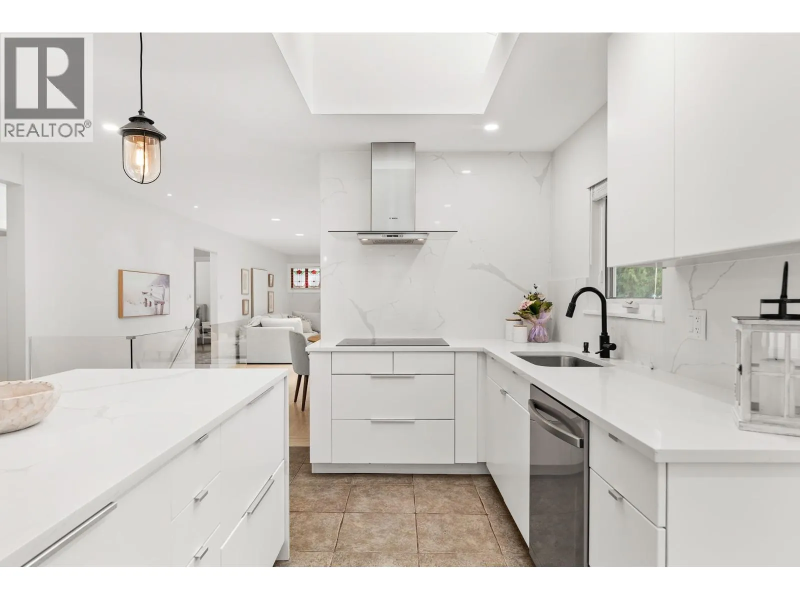 This stunning Village home delivers instant WOW with a dramatic marble floor-to-ceiling gas fireplace & a sleek designer kitchen featuring Bosch & Fisher & Paykel appliances, quartz accents, & a striking waterfall island. Large windows bring in natural light throughout. Upstairs offers 3 bedrooms & 2 beautifully renovated bathrooms, including a primary retreat opening to an expansive 966 sq. ft. deck. A sunny side deck W/opaque glass railings extends the living space while capturing peekaboo ocean & White Rock views. The lower level incudes a bedroom, den, family room, sauna, & spa-like bath w/heated marble floors - ideal for a suite. Double garage w/epoxy floors & EV charger. Private yard with mature gardens & powered shed. Must see! Book your private showing now! (id:27476)