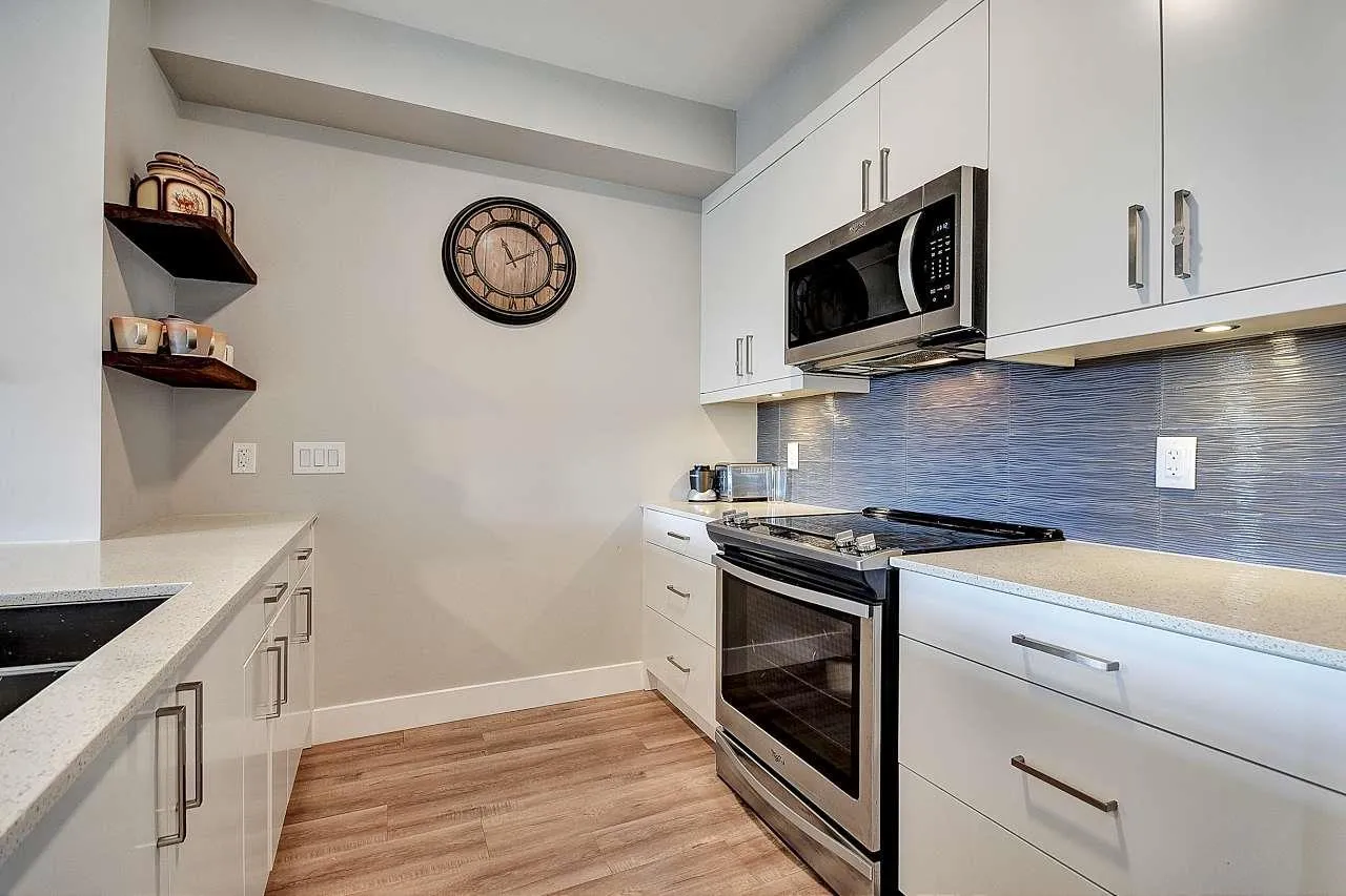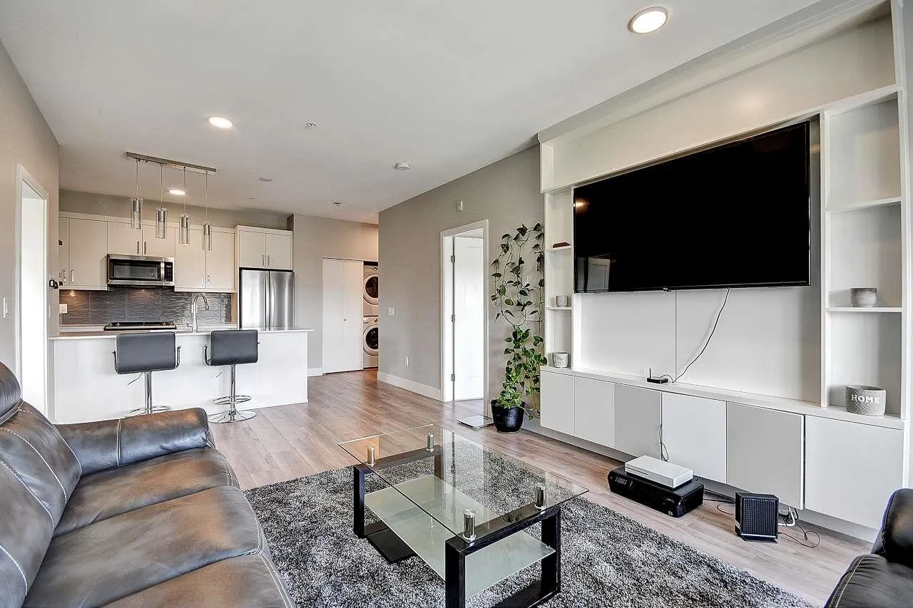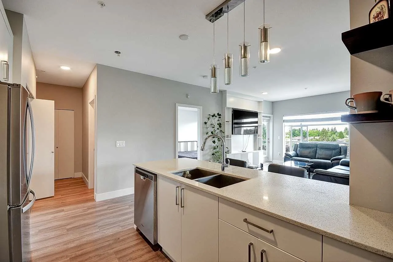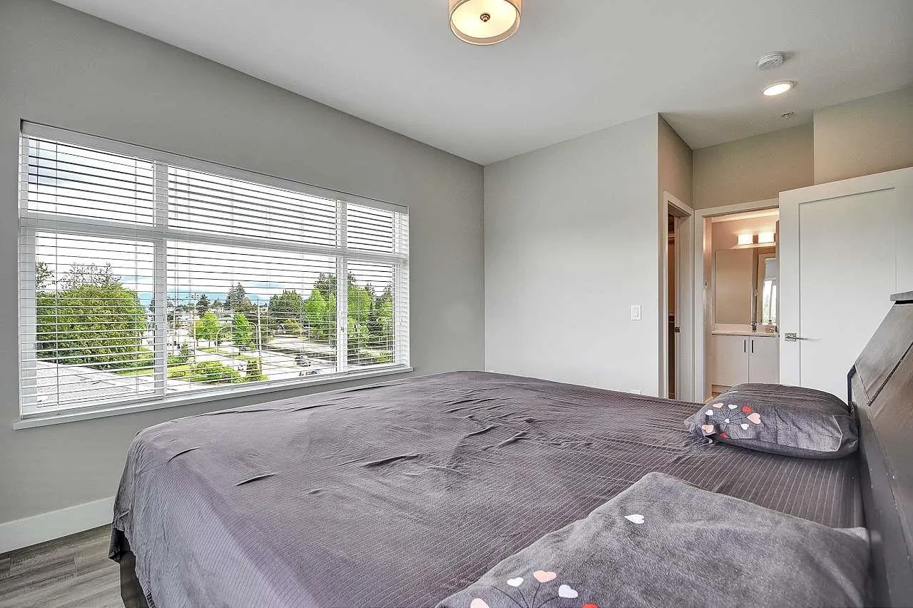 Welcome to Spectacular home at The Muse in an unbeatable location! Situated on the quiet side of the building, this gorgeous 4th floor corner unit features extra windows and stunning west-facing views of Delta, Richmond, and the North Shore Mountains. This bright and spacious 2-bedroom, 2-bathroom home offers an open-concept layout, stainless steel appliances, quartz countertops, and modern white cabinetry and doors. Enjoy beautiful sunsets and summer BBQs from the large balcony accessible from both the living room and bedrooms. Conveniently located within walking distance to Gibson Elementary and Delview Secondary, and close to shopping, transit, and amenities. Building features include a fitness center, one storage locker, and two side-by-side parking stalls. A must-see home. (id:27476)