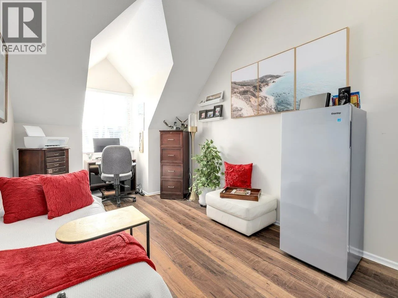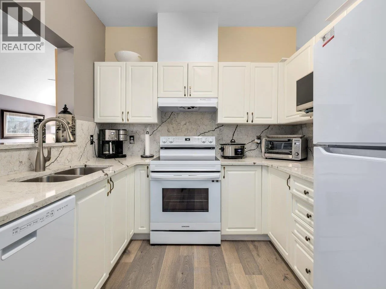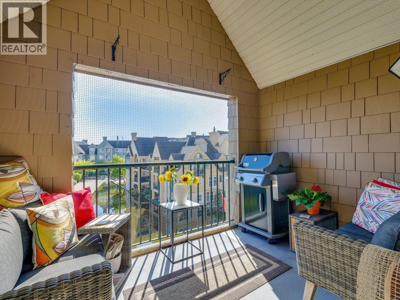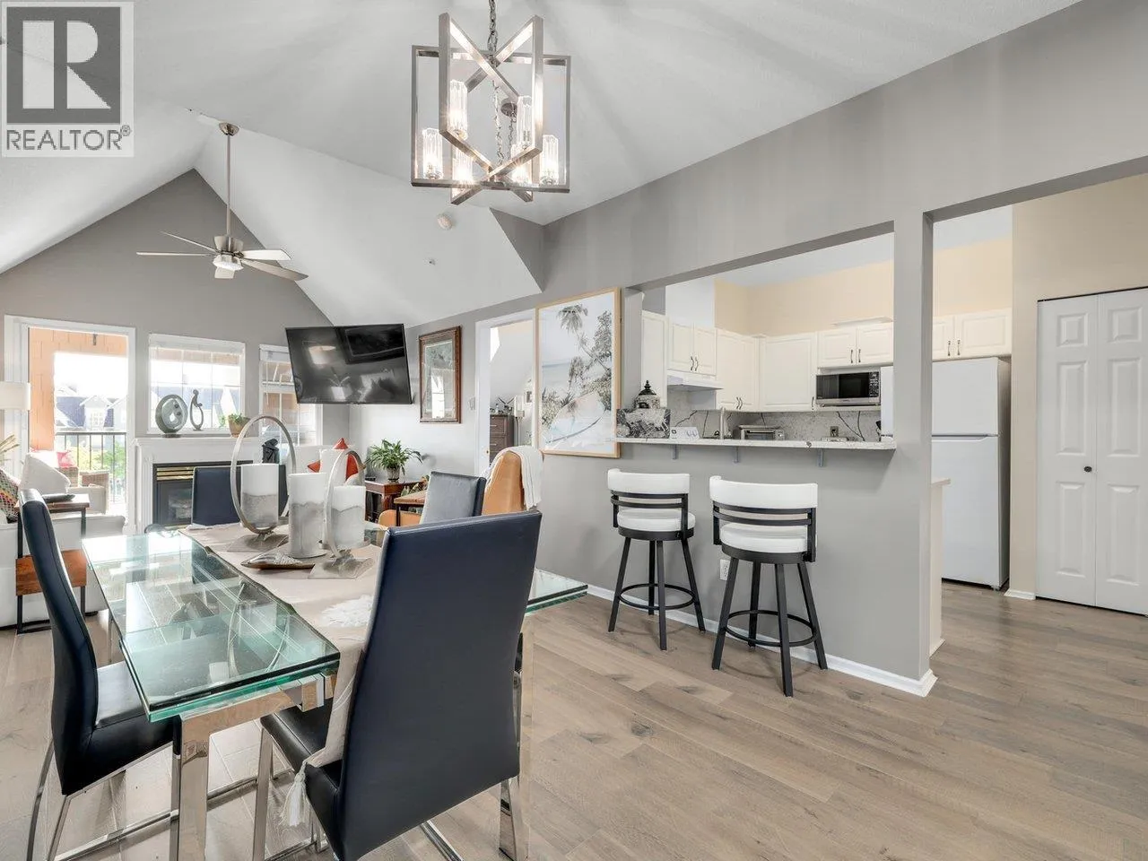 PENTHOUSE - Welcome to this beautifully renovated 2-bedroom, 2-bathroom home in the highly sought-after Windsor Woods.This bright and spacious top-floor unit features soaring 12-foot vaulted ceilings, large south-facing windows, and a sun-drenched balcony overlooking the Lagoon. The open-concept living and dining area is complemented by a cozy gas fireplace, creating a warm and inviting atmosphere. Extensively updated throughout, this home boasts granite countertops, laminate flooring, fully renovated bathrooms and new lighting fixtures. The functional layout includes in-suite laundry, one secure underground parking stall, and a separate storage locker. Open House Sat/Sun April 4 & 5, 2026, 2-4 pm (id:27476)