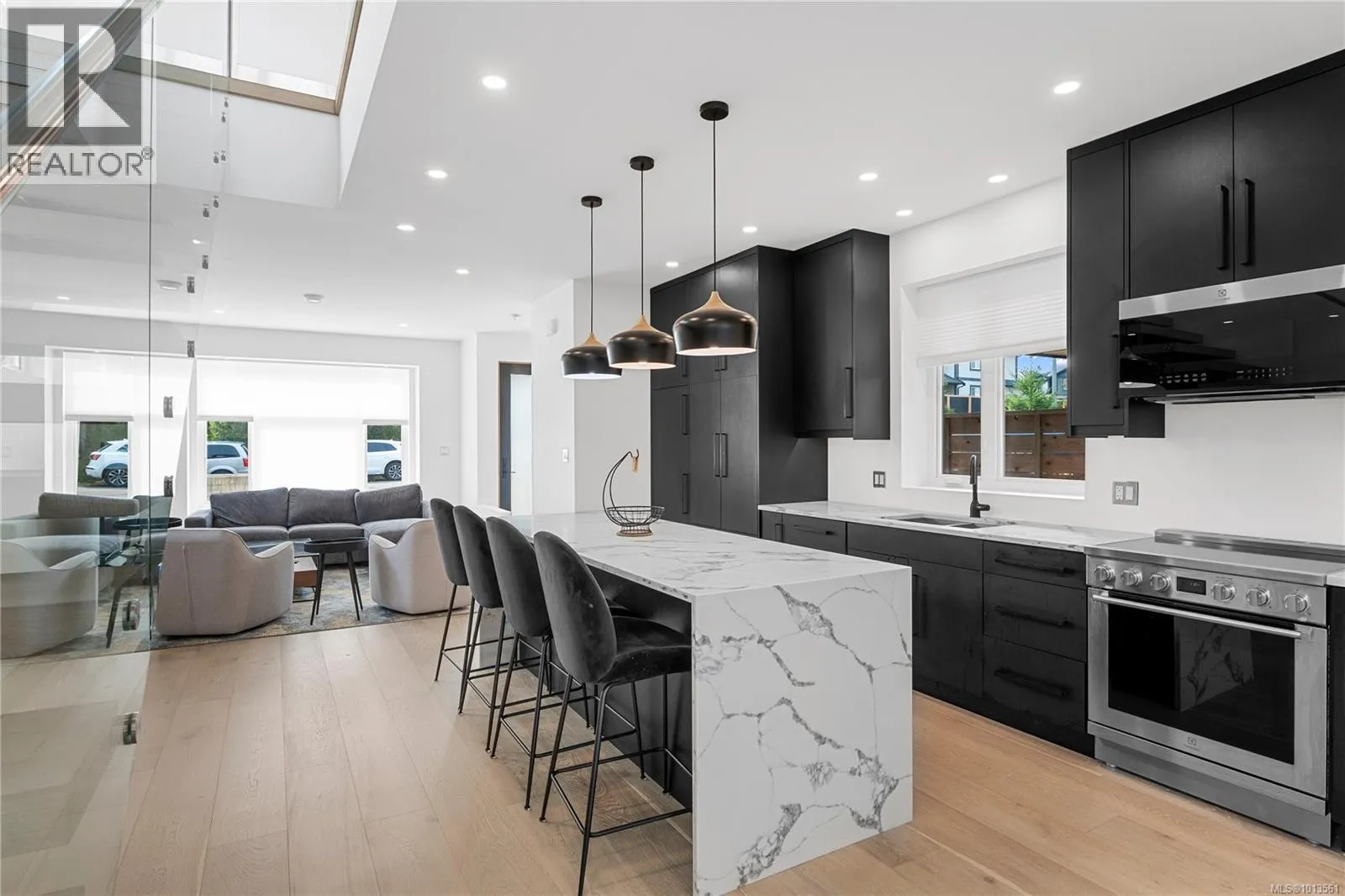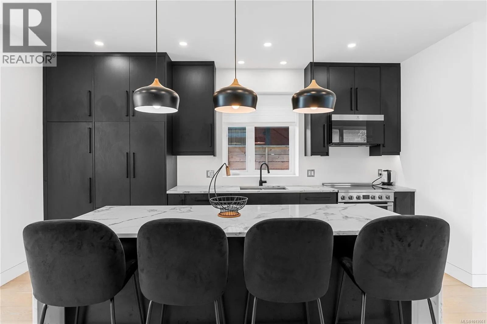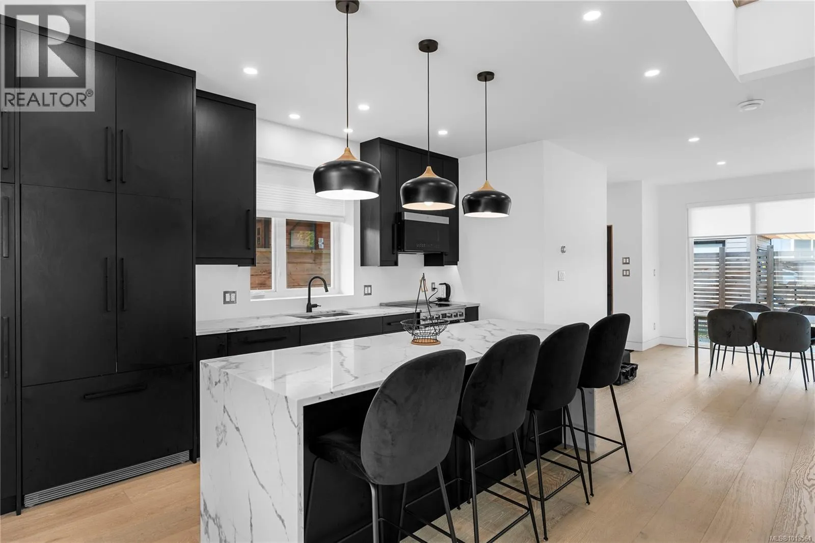 Discover modern living at its finest in this contemporary 2-storey home, ideally located in Duncanâs desirable Berkeyâs Corner community. Just steps to schools, shopping, and the local soccer & baseball fields, this thoughtfully designed residence offers the perfect balance of convenience, style, & functionality. With 1,774 sq. ft. of living space on a low-maintenance 0.09-acre lot, it is well suited for both families and professionals seeking a refined lifestyle. The main floor welcomes you with an airy open-concept design highlighted by a chef-inspired kitchen. High-end appliances include a Fisher & Paykel panel-matched fridge and dishwasher, plus an Electrolux induction range and microwave. A stunning waterfall marble island anchors the space, complemented by custom soft-close cabinetry & integrated appliances for a sleek finish. The dining area flows effortlessly to the rear patio, while the living room provides a comfortable place to relax. A stylish powder room features a wall-mounted Duravit commode, emphasizing the homeâs modern aesthetic. A striking floating staircase leads to the second floor, where three bedrooms and a spacious family room await. From here, step out through glass doors onto the private upper deck, an ideal spot for morning coffee or evening unwinding. The primary suite is a true retreat, with vaulted ceilings and a spa-like ensuite boasting dual sinks with waterfall faucets, a backlit mirror, and a fully tiled Steam Suite shower with a rain showerhead. Comfort is ensured year-round with radiant in-floor heating throughout the home, complemented by a heat pump for efficient cooling and backup heat. Outside, the low-maintenance yard is enhanced by a detached single-car garage/workshop/office, already plumbed for a shower and designed with flexibility in mind. For those who love to entertain, amenities are in place to create an outdoor kitchen beneath the garage pergola, offering the potential for an exceptional backyard oasis. (id:27476)