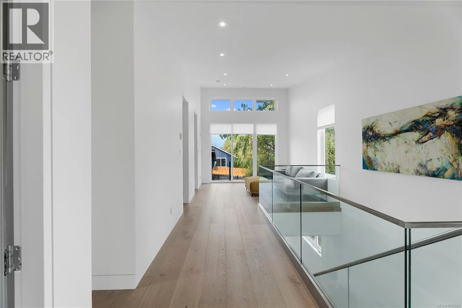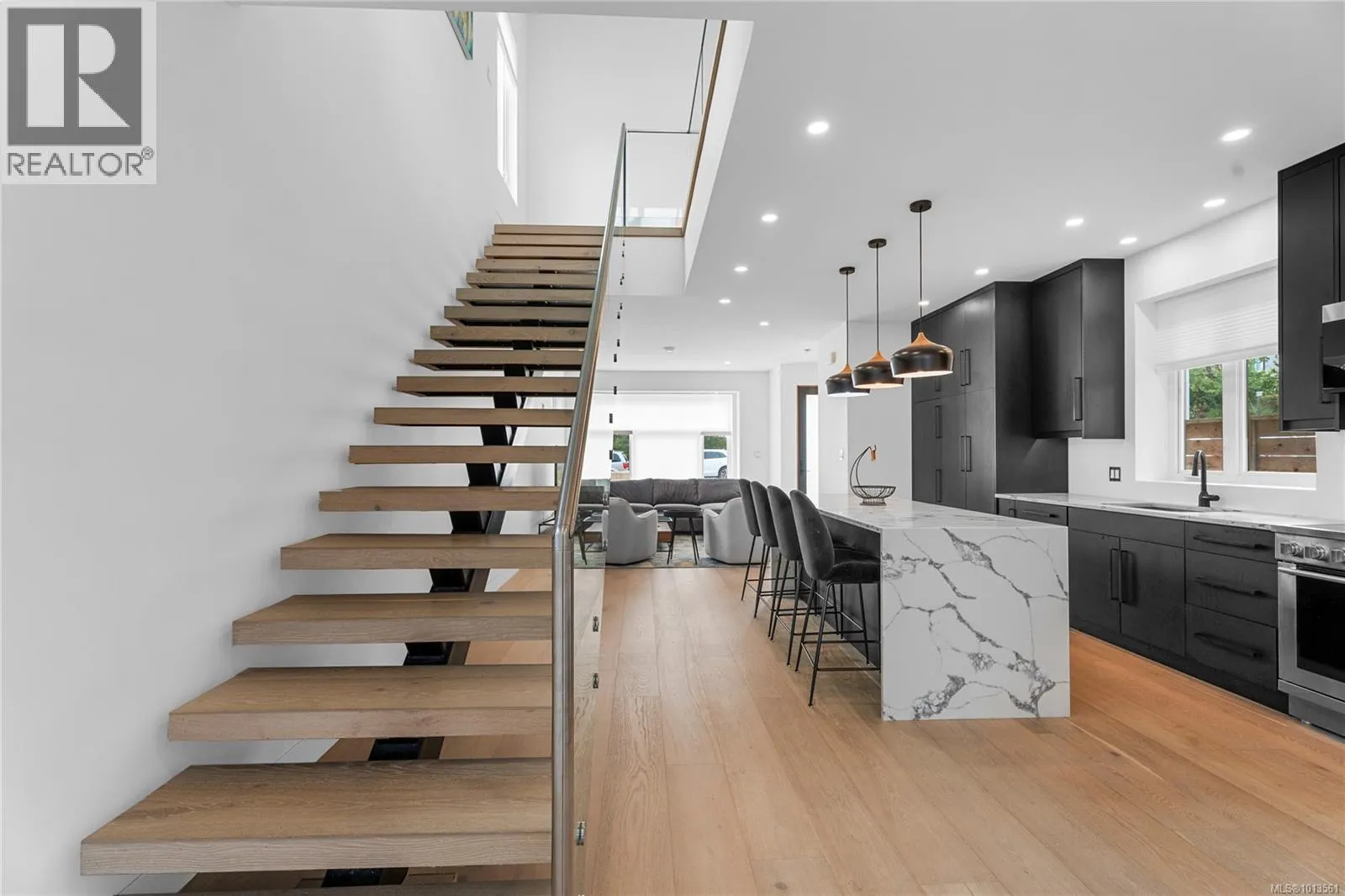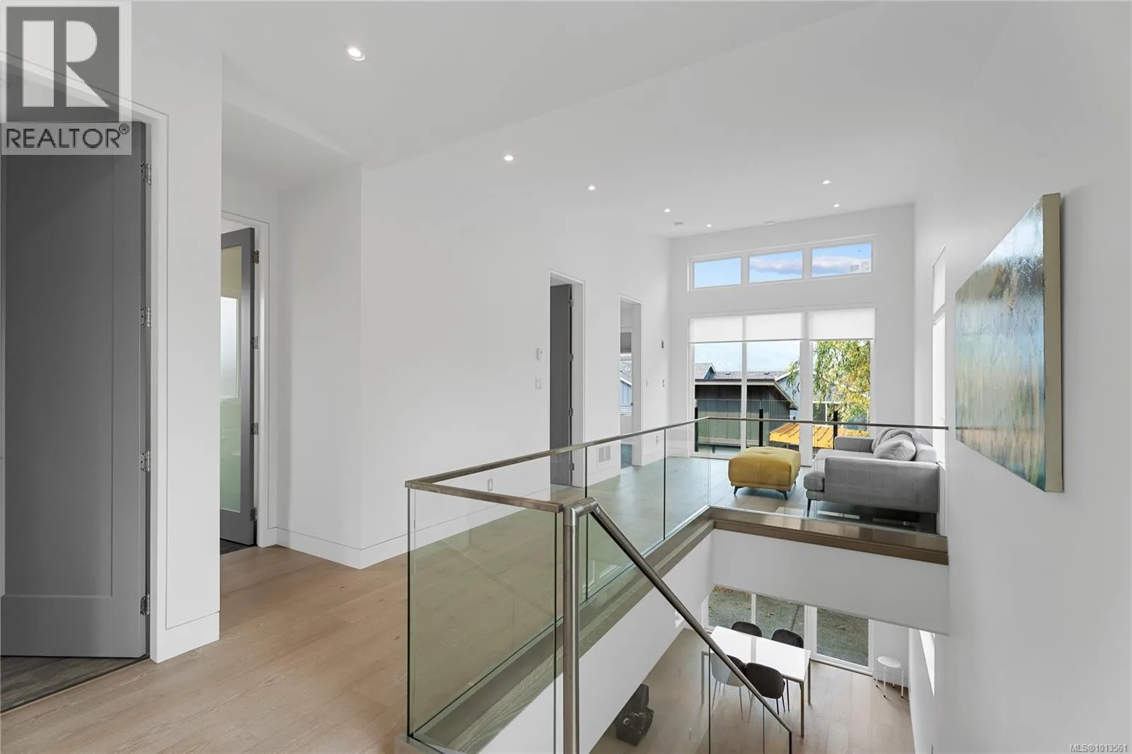 Discover modern living at its finest in this contemporary 2-storey home, ideally located in Duncanâs desirable Berkeyâs Corner community. Just steps to schools, shopping, and the local soccer & baseball fields, this thoughtfully designed residence offers the perfect balance of convenience, style, & functionality. With 1,774 sq. ft. of living space on a low-maintenance 0.09-acre lot, it is well suited for both families and professionals seeking a refined lifestyle. The main floor welcomes you with an airy open-concept design highlighted by a chef-inspired kitchen. High-end appliances include a Fisher & Paykel panel-matched fridge and dishwasher, plus an Electrolux induction range and microwave. A stunning waterfall marble island anchors the space, complemented by custom soft-close cabinetry & integrated appliances for a sleek finish. The dining area flows effortlessly to the rear patio, while the living room provides a comfortable place to relax. A stylish powder room features a wall-mounted Duravit commode, emphasizing the homeâs modern aesthetic. A striking floating staircase leads to the second floor, where three bedrooms and a spacious family room await. From here, step out through glass doors onto the private upper deck, an ideal spot for morning coffee or evening unwinding. The primary suite is a true retreat, with vaulted ceilings and a spa-like ensuite boasting dual sinks with waterfall faucets, a backlit mirror, and a fully tiled Steam Suite shower with a rain showerhead. Comfort is ensured year-round with radiant in-floor heating throughout the home, complemented by a heat pump for efficient cooling and backup heat. Outside, the low-maintenance yard is enhanced by a detached single-car garage/workshop/office, already plumbed for a shower and designed with flexibility in mind. For those who love to entertain, amenities are in place to create an outdoor kitchen beneath the garage pergola, offering the potential for an exceptional backyard oasis. (id:27476)