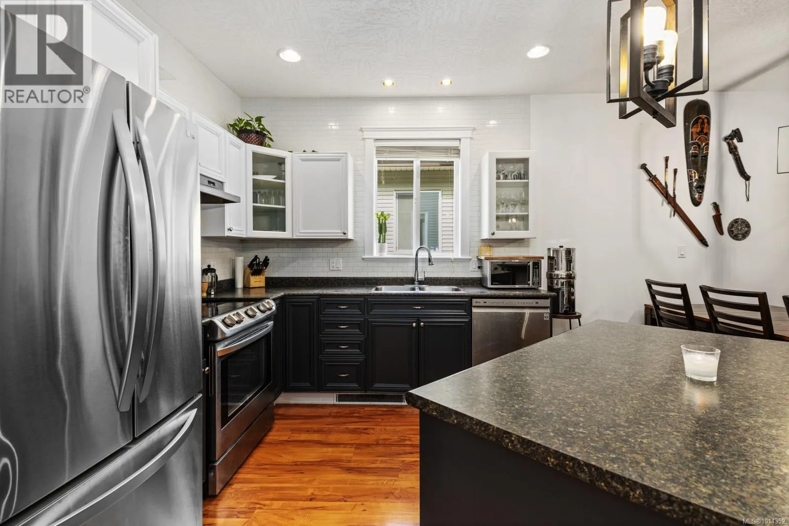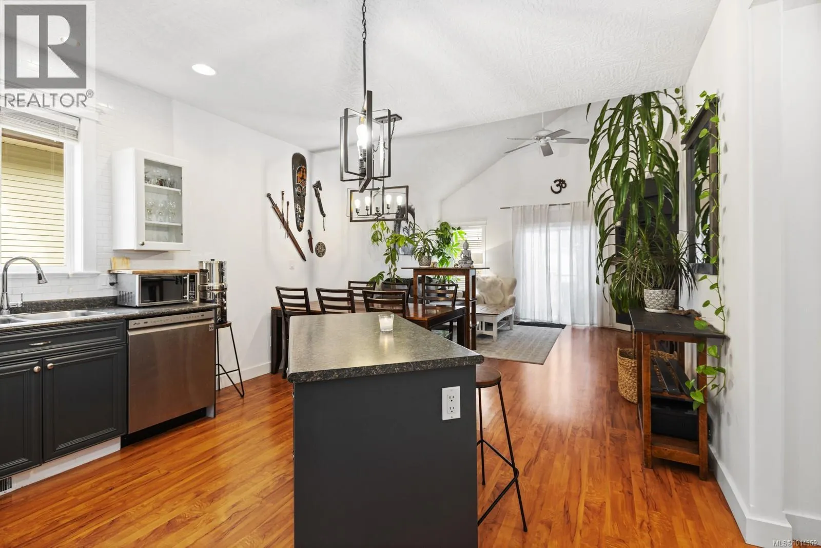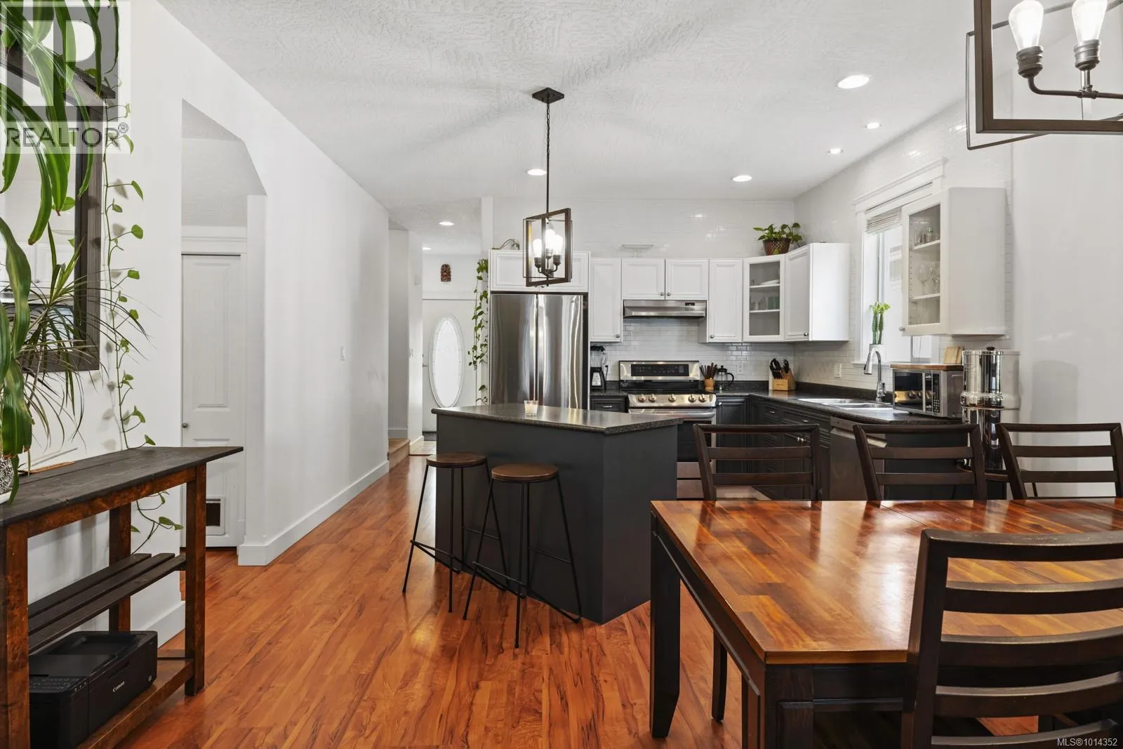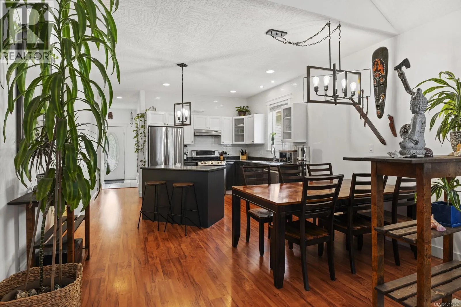 This updated townhouse combines modern style with everyday convenience. The main level features vaulted ceilings, a cozy gas fireplace with custom mantel, and a primary bedroom for easy main-floor living. The kitchen is both stylish and functional with a white tiled backsplash, new counters, updated stainless steel appliances, and dark accents balanced by fresh green tones. Upstairs offers two bedrooms and a loft-style family room overlooking the main level, while a 6-foot crawl space spanning the entirety of the floorplan, provides excellent storage. Bathrooms and paint have been refreshed throughout, making the home move-in ready. Ideally located in Duncan, youâre within walking distance to coffee shops, restaurants, The Oak pub, grocery stores, soccer fields, and Mount Prevost Elementary schoolâall while being minutes from trails and Holmes Creek. This home is priced below assessed value. (id:27476)