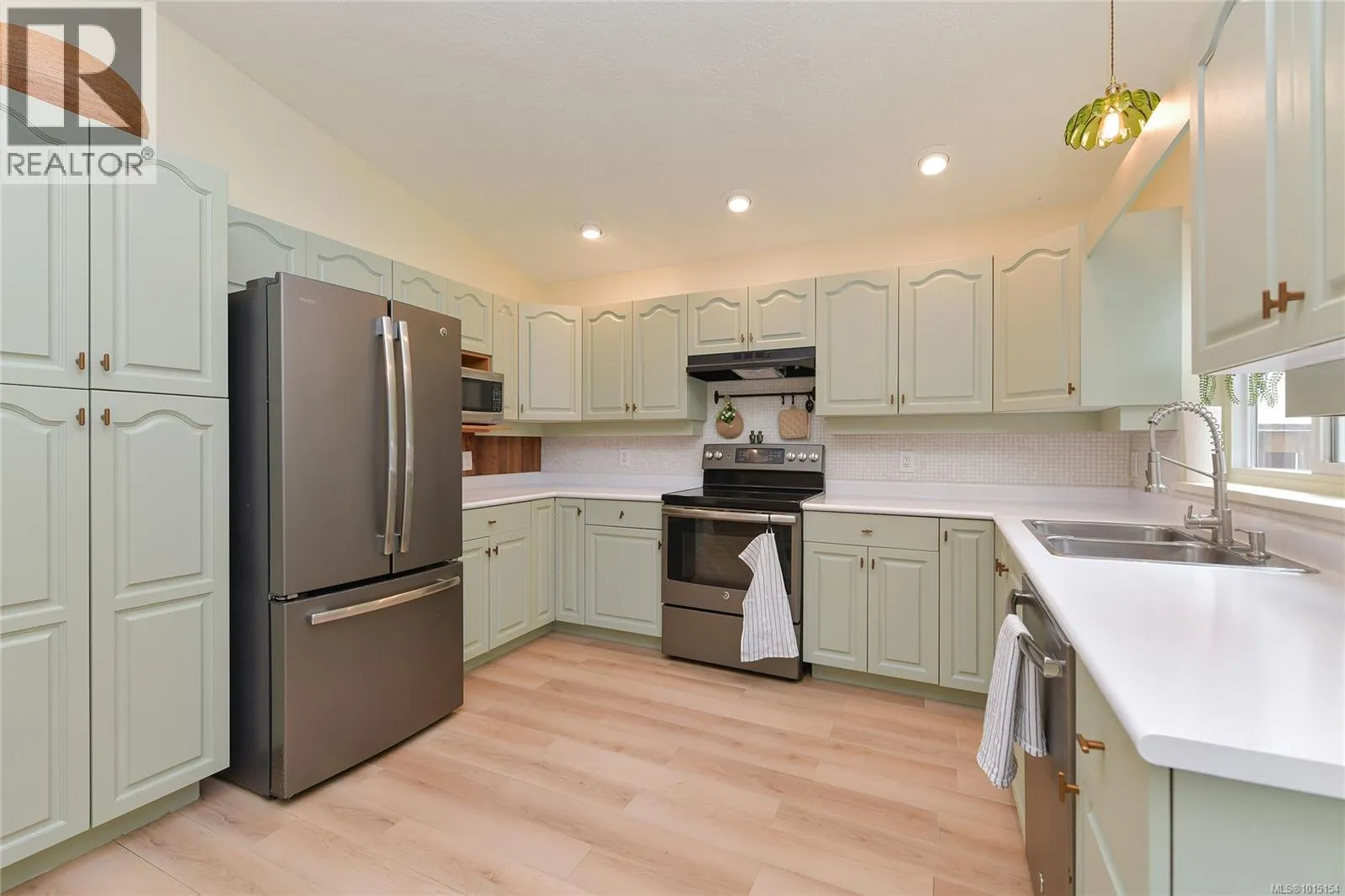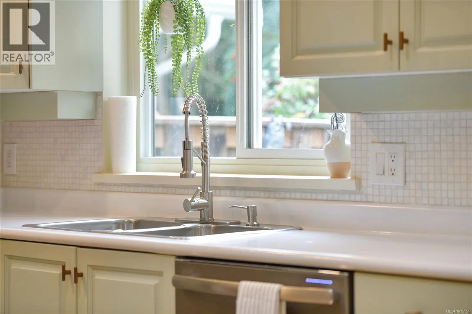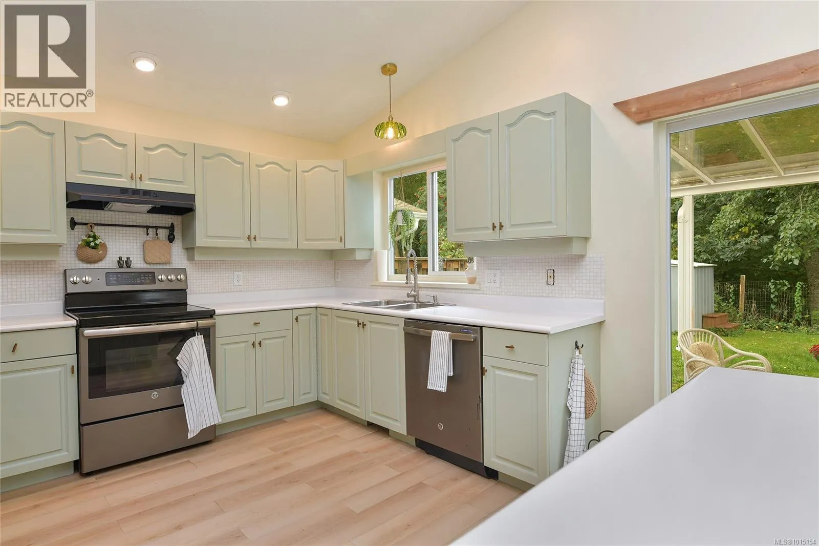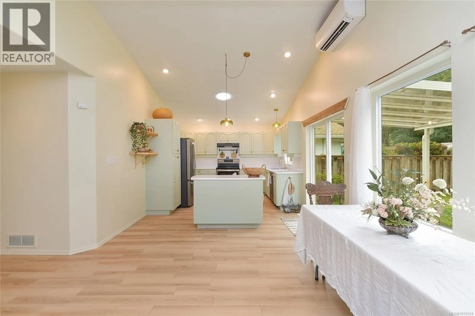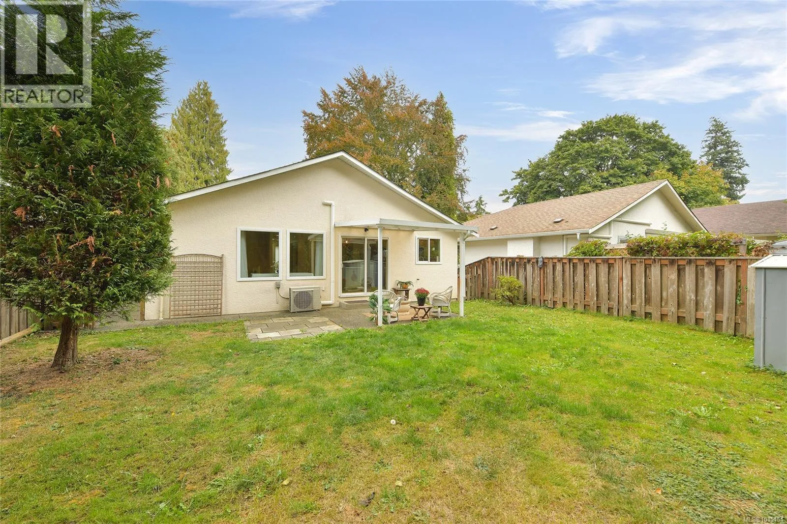 NEW PRICE! Welcome to this fantastic, move-in-ready rancher on a quiet cul-de-sac, central to all amenities. This home has been completely refreshed with new flooring throughout, new bathroom and kitchen fixtures, new lighting, and paint. Upgrades include a newer roof, vinyl windows, and a ductless electric heat pump for heating and cooling. The spacious primary bedroom features beautiful bay windows, a full ensuite bathroom, and a walk-in closet. There is a second bedroom as well as a den/office or third bedroom with laundry and extra storage. Enjoy the modern, open-concept kitchen, dining, and living areas with vaulted ceilings, loads of natural light, and a cozy propane fireplace. The private, sunny, peaceful, and easy-care backyard with a covered patio backs onto a forested area and parkland with tennis courts and walking trails. There are only 5 homes in this quiet 55+ strata, with only a shared roadway. Quick possession for this truly special offering! (id:27476)