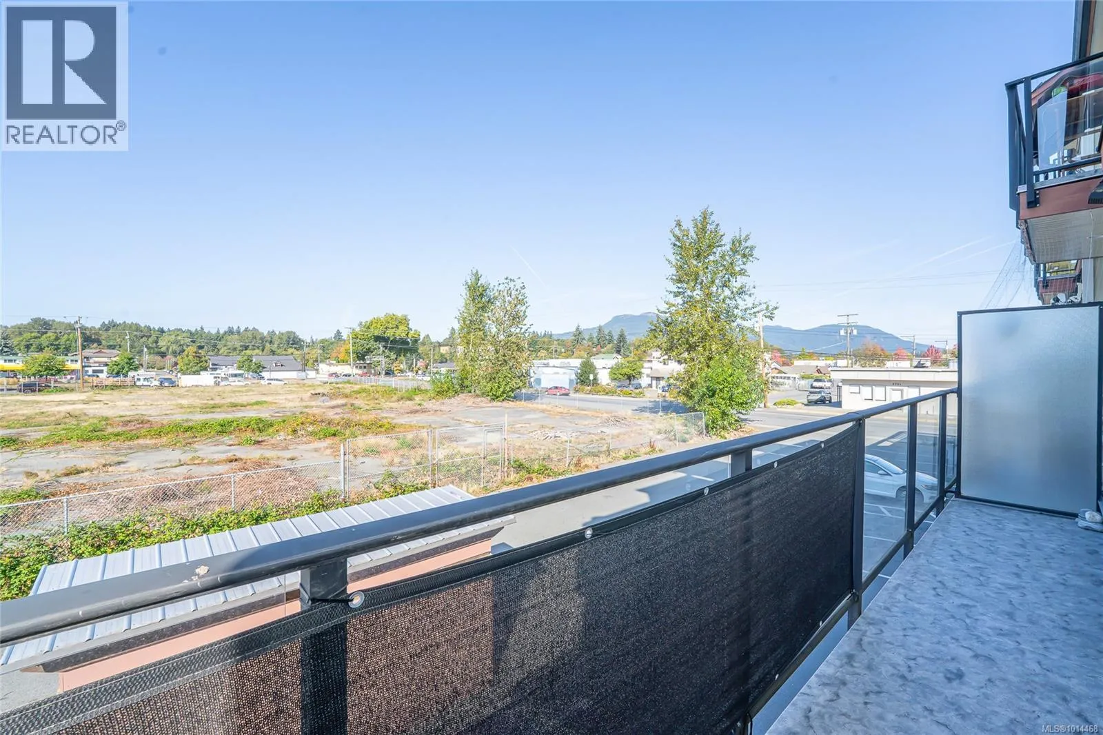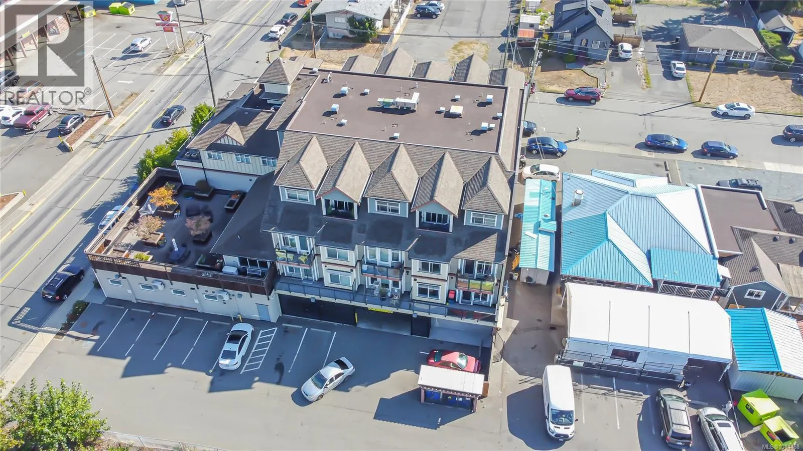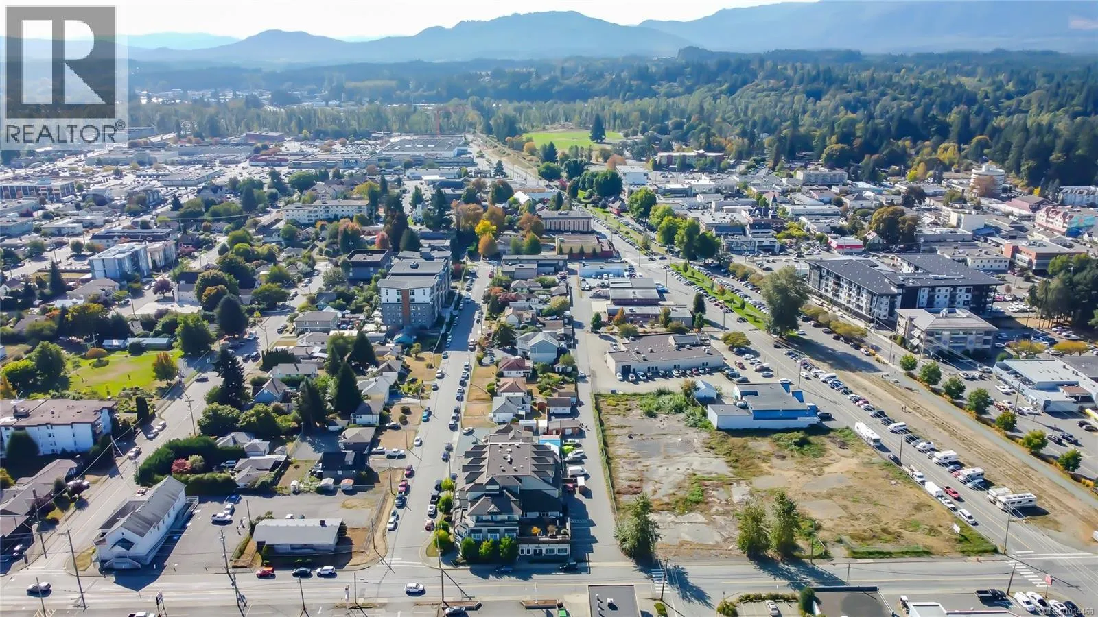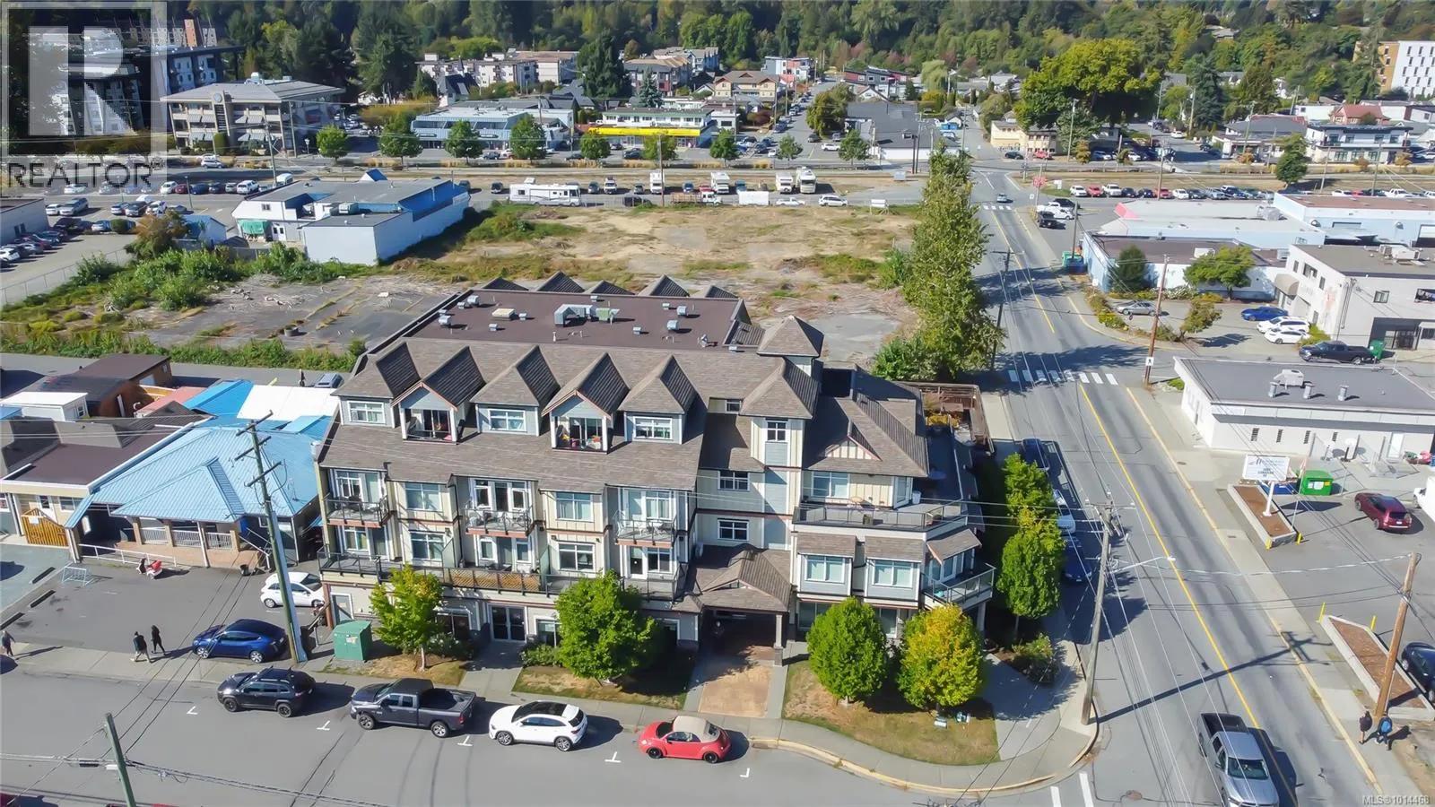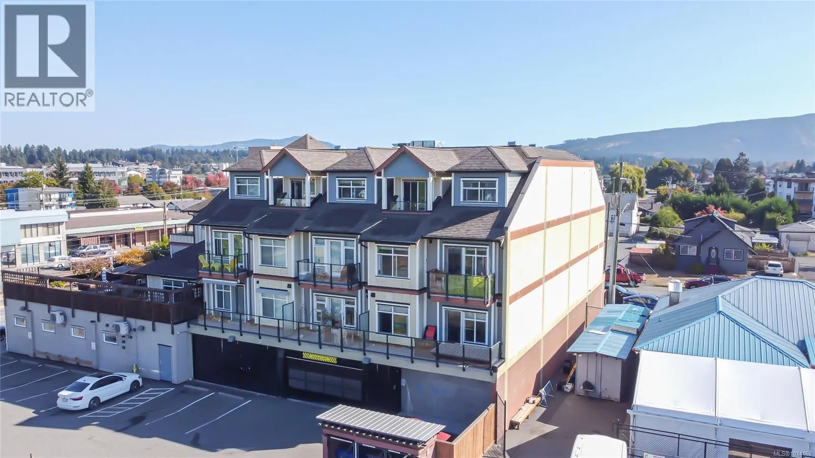Captivating Sunset Views of Mt. Prevost! This beautiful bright 960 sq. ft. corner condo combines affordability and style with no age restriction, a low strata fee, and flexible rental optionsâideal for investors, first-time buyers, or downsizers. The contemporary 1-bedroom + den layout features 9' ceilings, wide-plank flooring, and a sleek kitchen with eating bar. The bedroom offers a walk-in closet and easy access to the 4-piece bath, while the den is perfect for an office, studio, or guest space. Extras include in-suite laundry, a large storage room with newer hot water tank, built in shelving for storage, and a sunny west-facing balcony to soak in those sunsets. The Rossco provides secure entry and parking, bike storage, a gym, and a rooftop patio for BBQs or gardening. Cats and dogs welcome (no size limit). Walk to the rec centre, library, theatre, VIU, shops, and diningâthis home truly checks all the boxes! (id:27476)