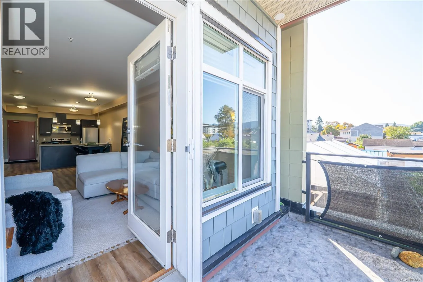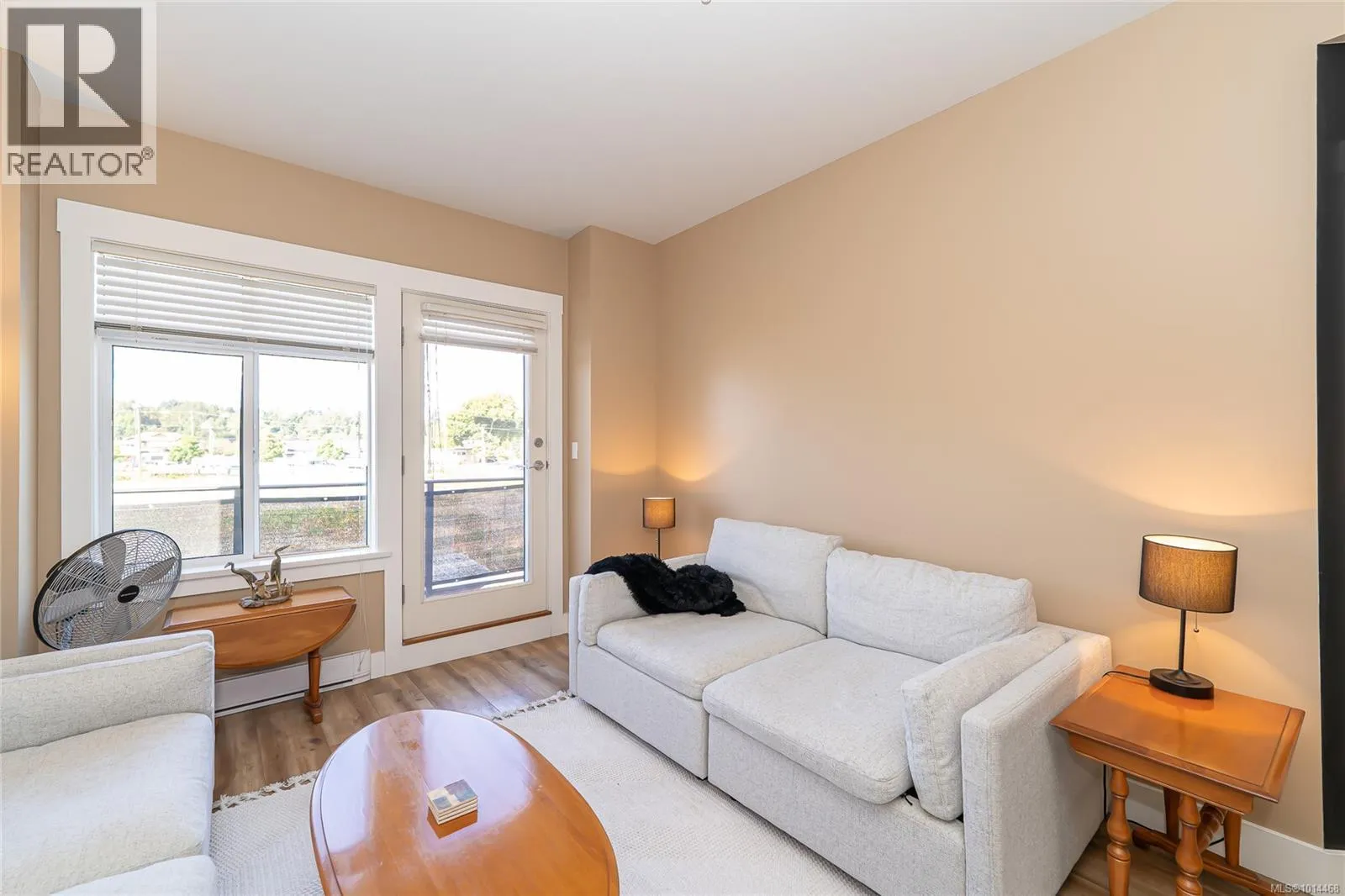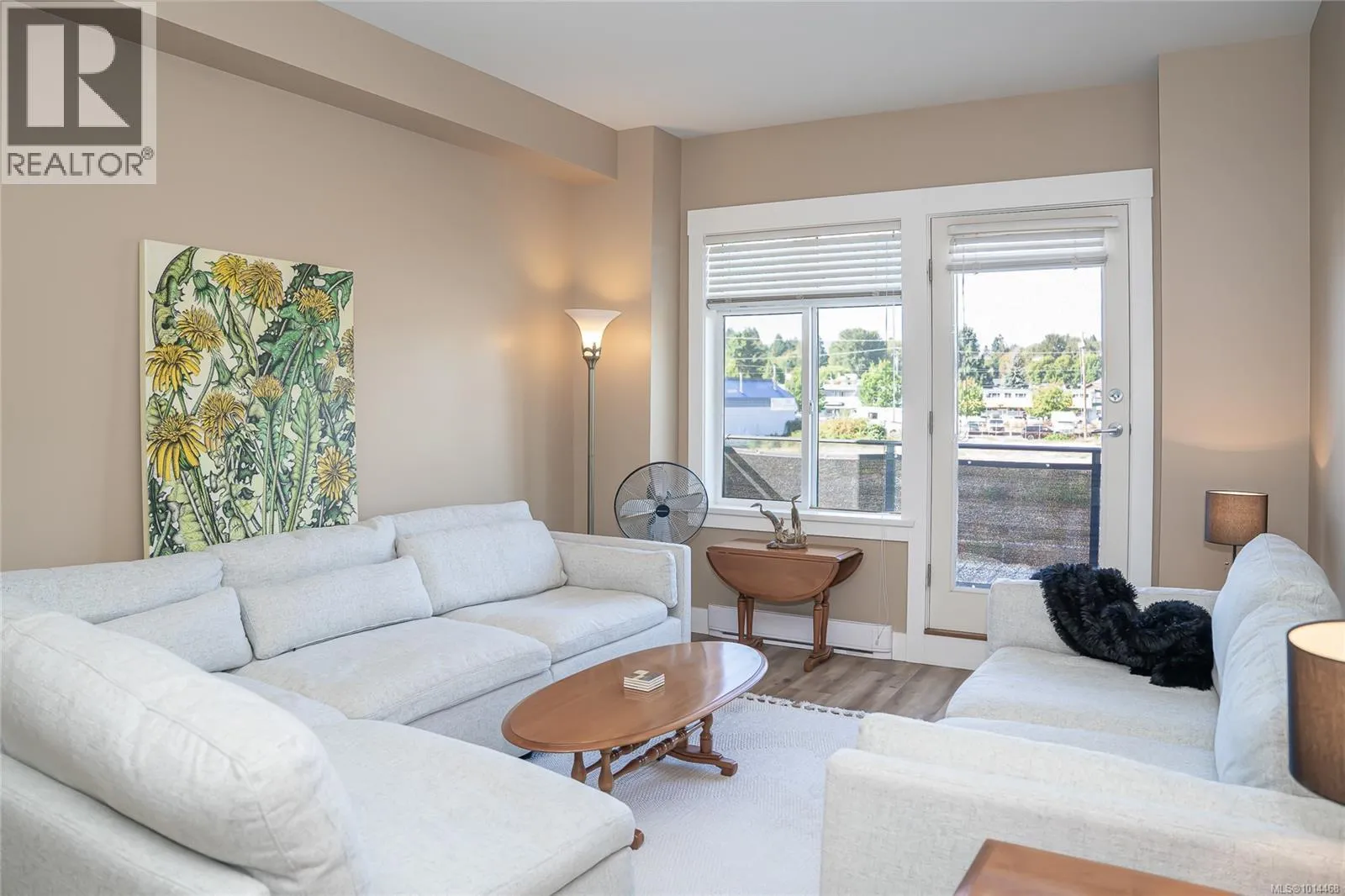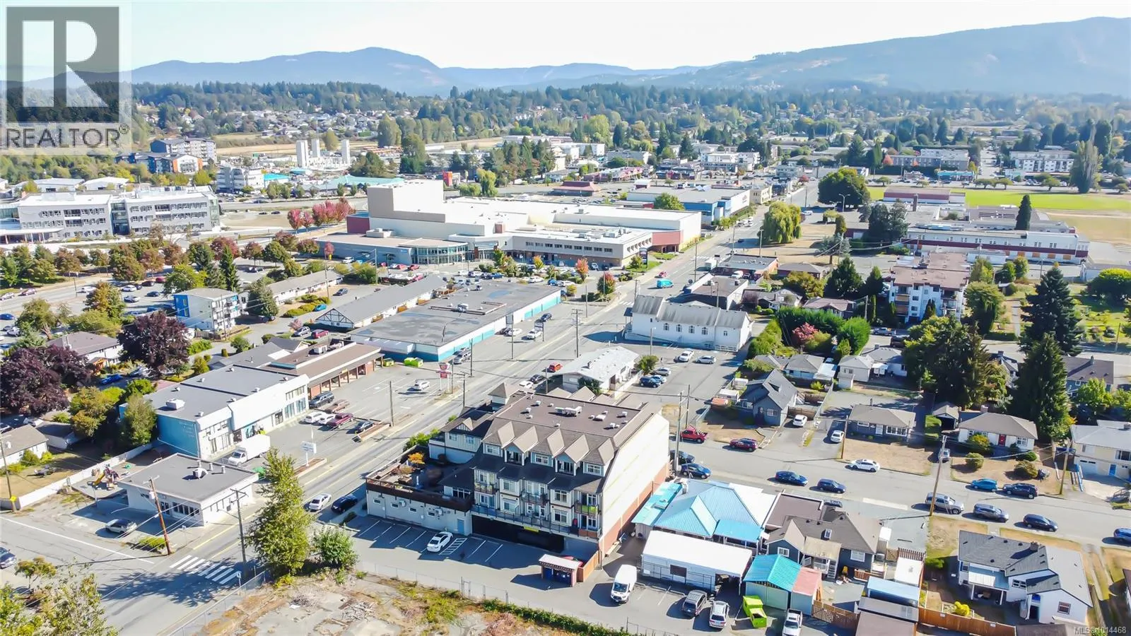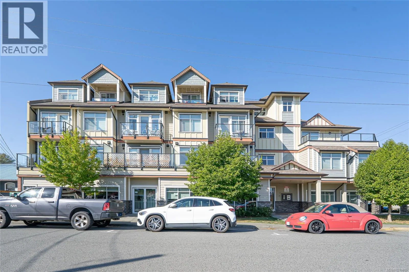 Captivating Sunset Views of Mt. Prevost! This beautiful bright 960 sq. ft. corner condo combines affordability and style with no age restriction, a low strata fee, and flexible rental optionsâideal for investors, first-time buyers, or downsizers. The contemporary 1-bedroom + den layout features 9' ceilings, wide-plank flooring, and a sleek kitchen with eating bar. The bedroom offers a walk-in closet and easy access to the 4-piece bath, while the den is perfect for an office, studio, or guest space. Extras include in-suite laundry, a large storage room with newer hot water tank, built in shelving for storage, and a sunny west-facing balcony to soak in those sunsets. The Rossco provides secure entry and parking, bike storage, a gym, and a rooftop patio for BBQs or gardening. Cats and dogs welcome (no size limit). Walk to the rec centre, library, theatre, VIU, shops, and diningâthis home truly checks all the boxes! (id:27476)