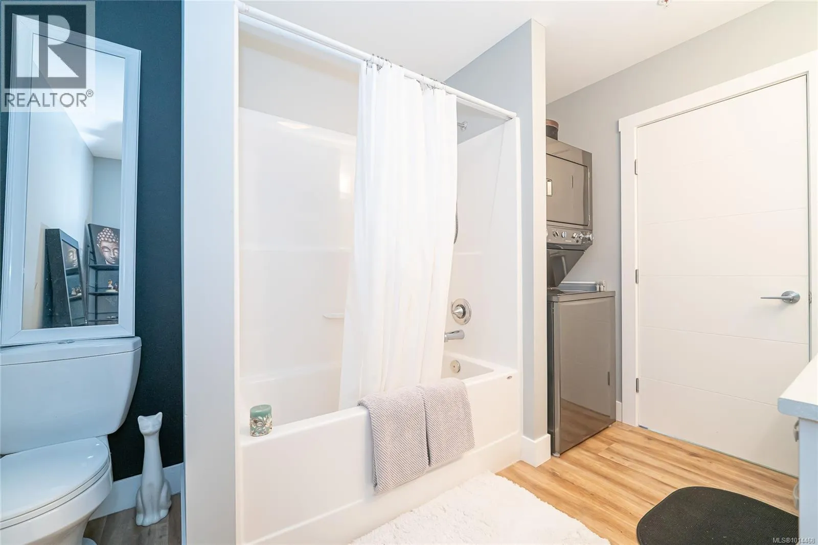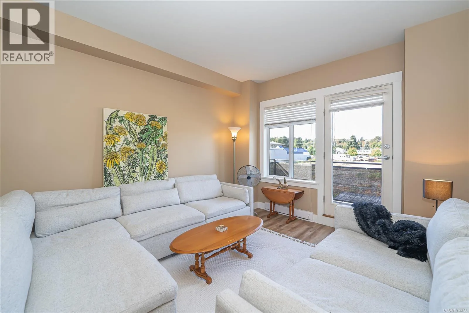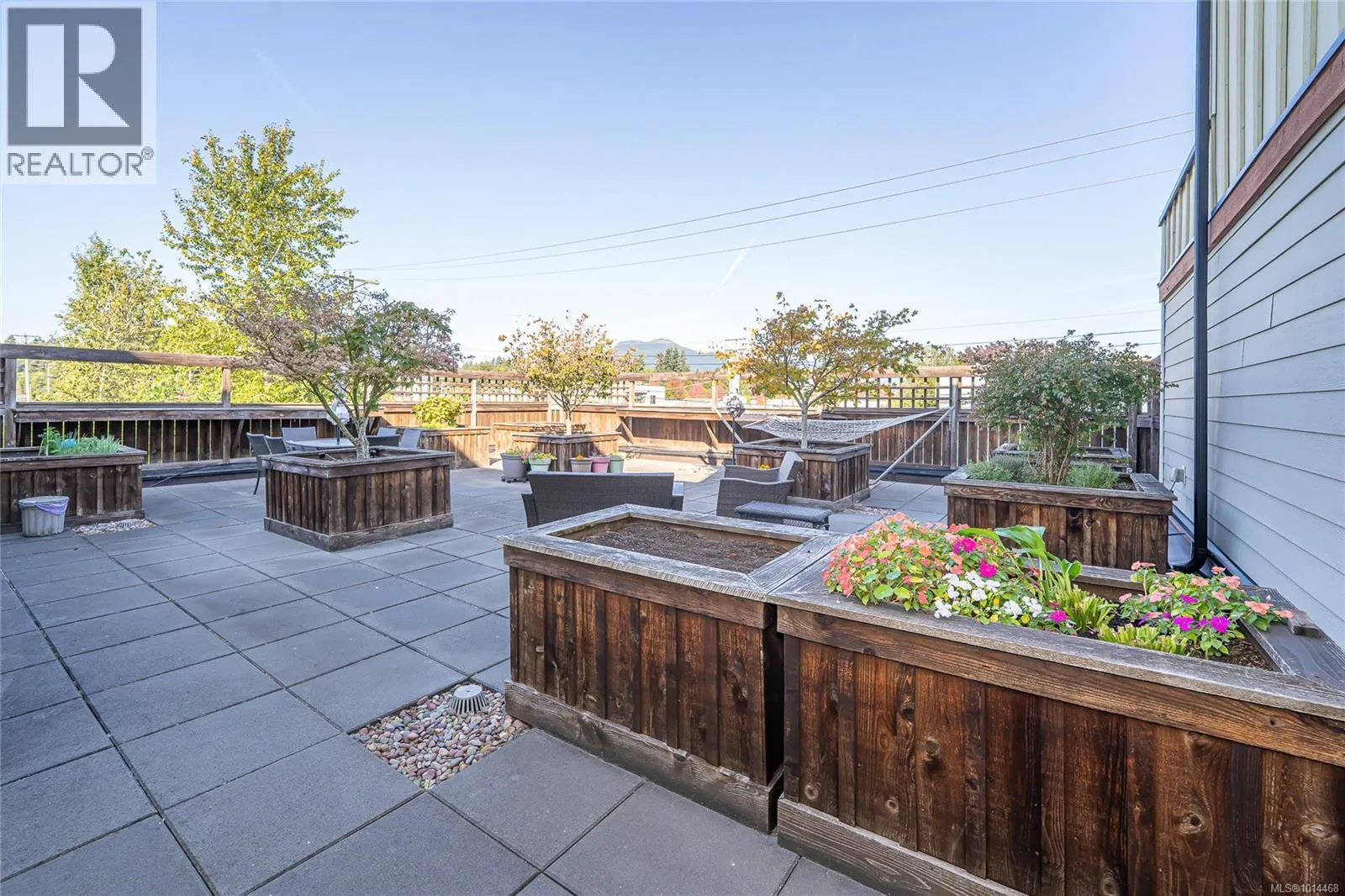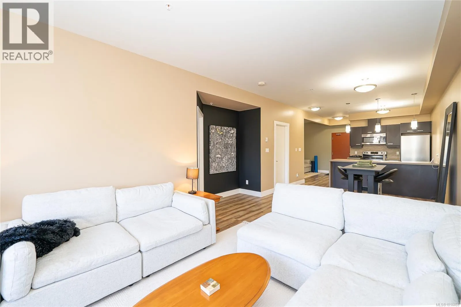 Captivating Sunset Views of Mt. Prevost! This beautiful bright 960 sq. ft. corner condo combines affordability and style with no age restriction, a low strata fee, and flexible rental optionsâideal for investors, first-time buyers, or downsizers. The contemporary 1-bedroom + den layout features 9' ceilings, wide-plank flooring, and a sleek kitchen with eating bar. The bedroom offers a walk-in closet and easy access to the 4-piece bath, while the den is perfect for an office, studio, or guest space. Extras include in-suite laundry, a large storage room with newer hot water tank, built in shelving for storage, and a sunny west-facing balcony to soak in those sunsets. The Rossco provides secure entry and parking, bike storage, a gym, and a rooftop patio for BBQs or gardening. Cats and dogs welcome (no size limit). Walk to the rec centre, library, theatre, VIU, shops, and diningâthis home truly checks all the boxes! (id:27476)